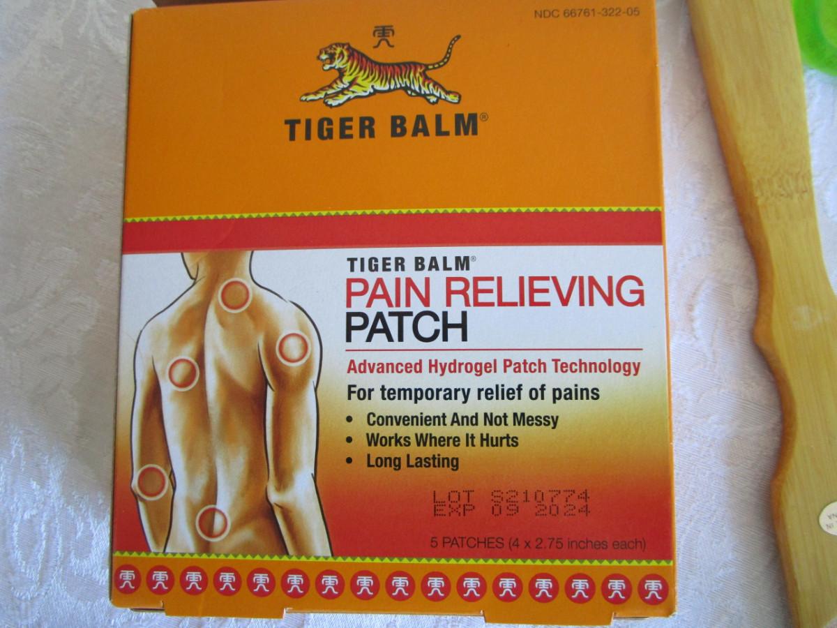 2 boxes of Tiger Balm pain relieving patches 5 in each box 4" x 2.75" expiration date Sept 2024; back scratcher and 2 massagers
