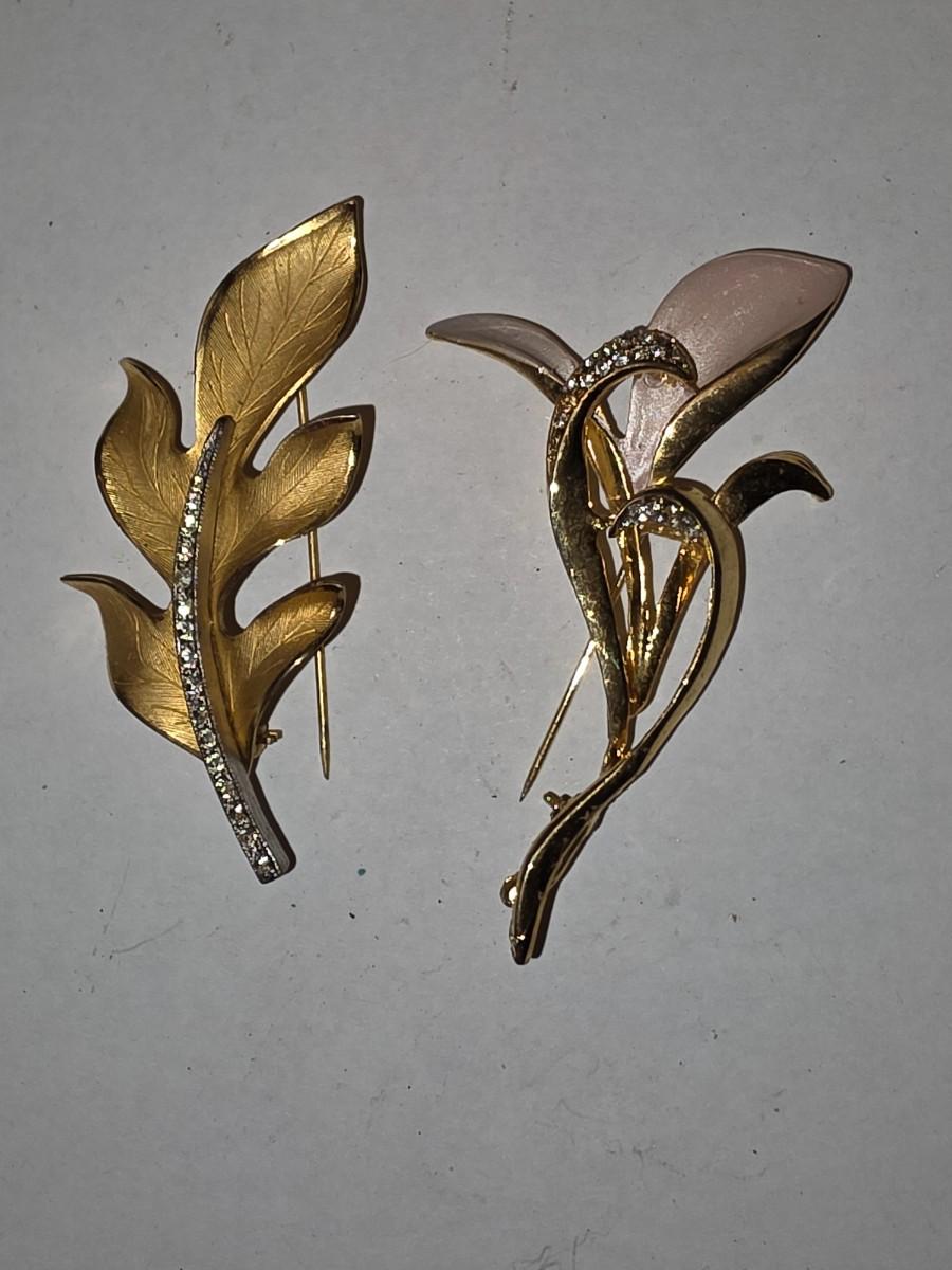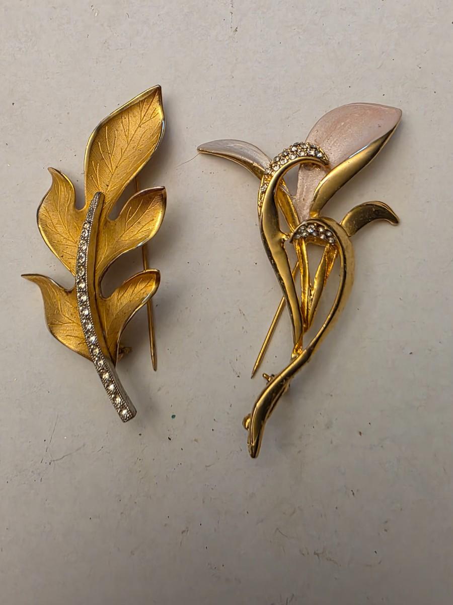 3 inches tall. One is a delicate pink flower on gold backing. Both have cubic zirconia stones.