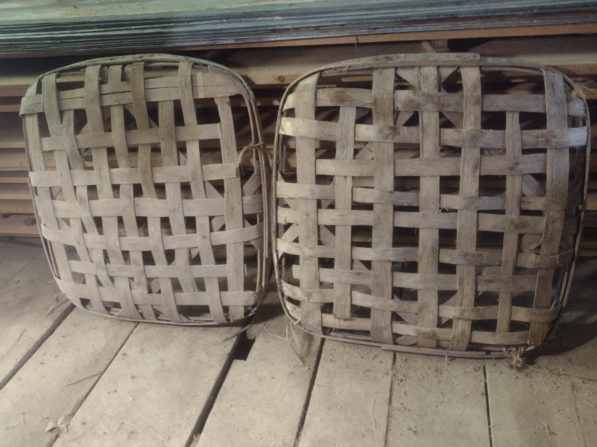Vintage Authentic Splint Wood Tobacco Leaf Market Baskets (DD). Sizes of each basket will vary. The baskets are all in used condition and will have broken slats, missing pieces, stains, etc. Sold as is.