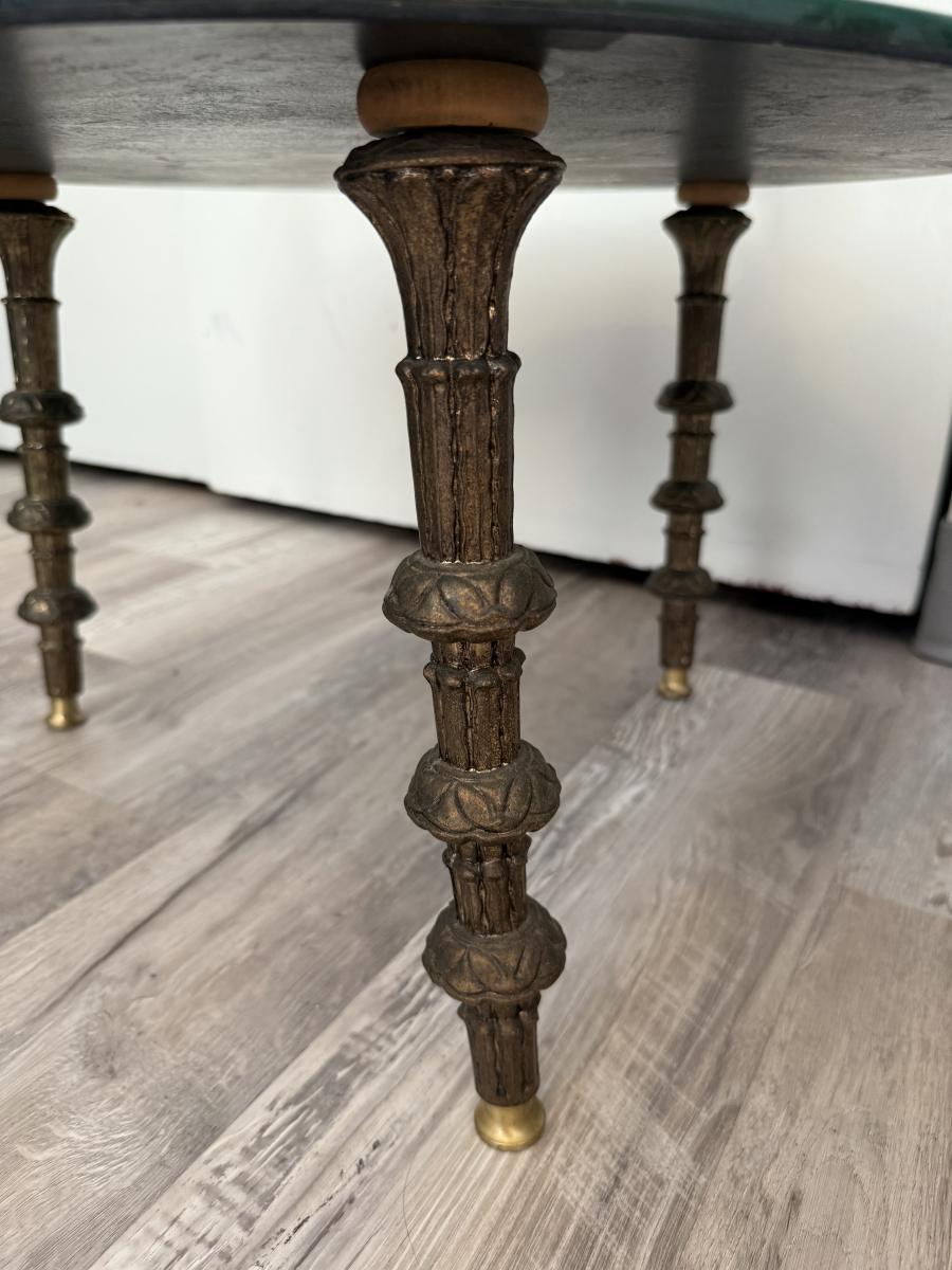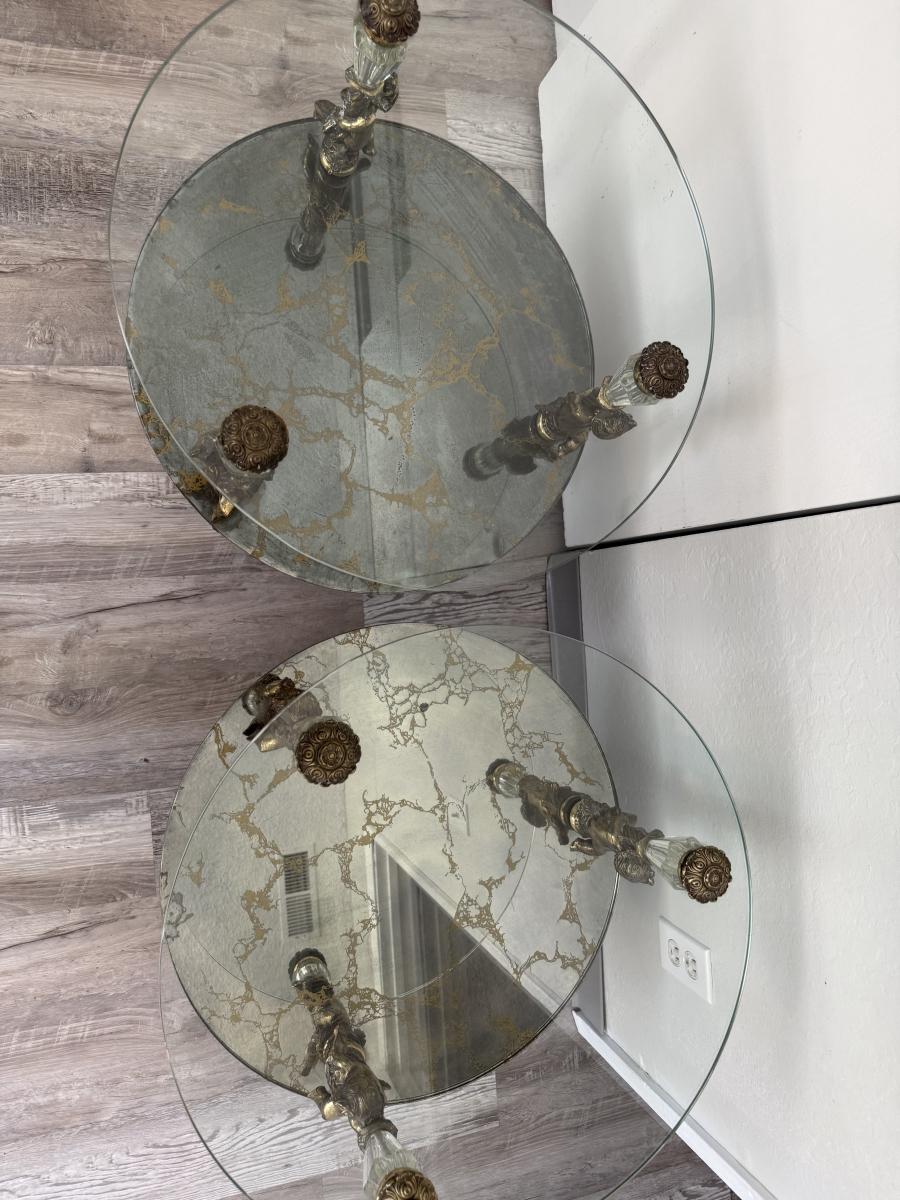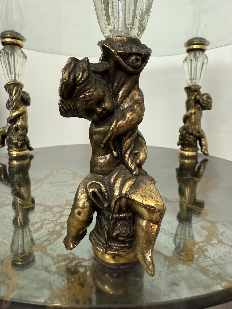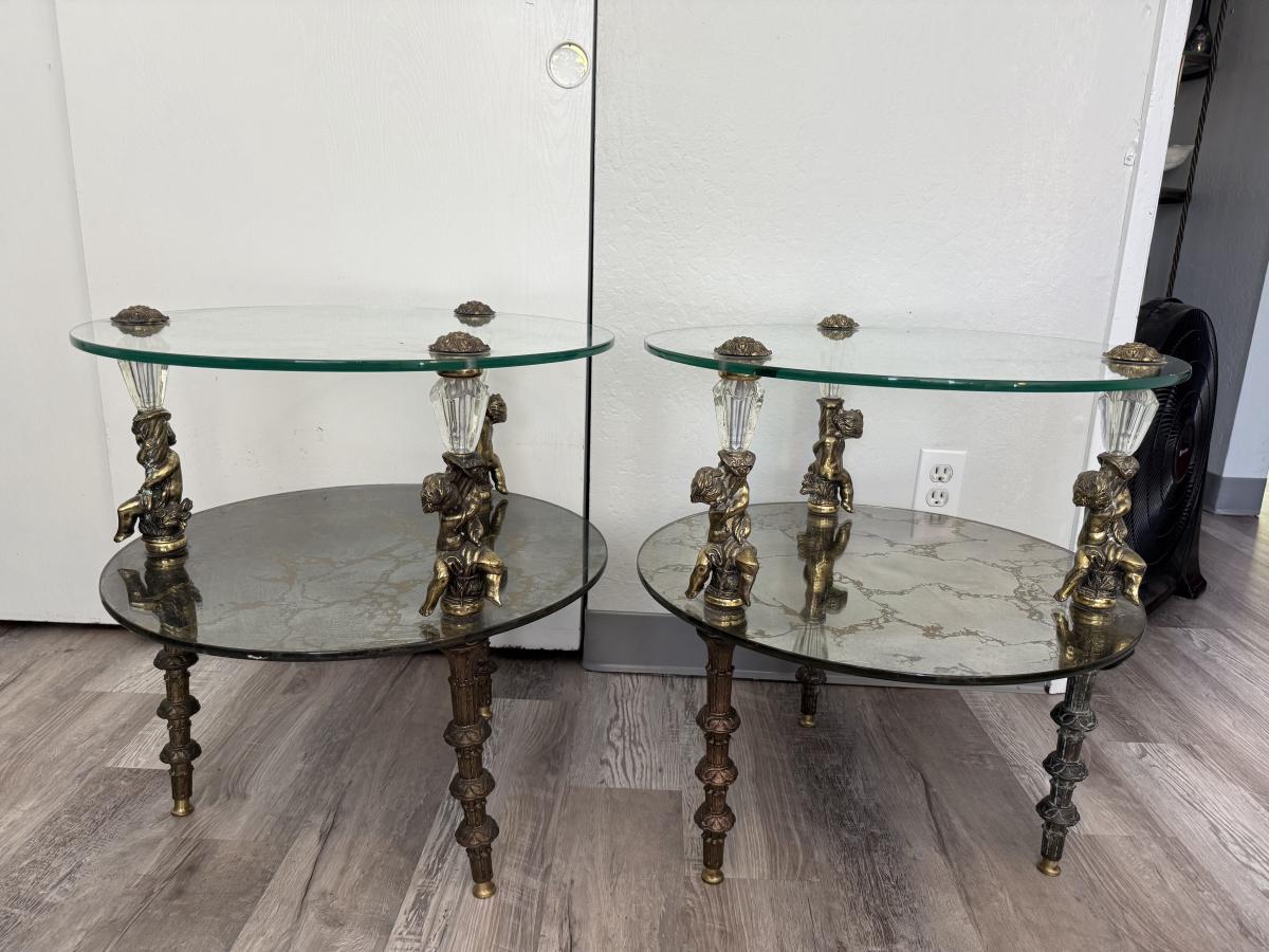 Set of two matching round glass-top side tables featuring ornate gold-tone cherub supports and decorative legs. Mid-century Hollywood Regency style.