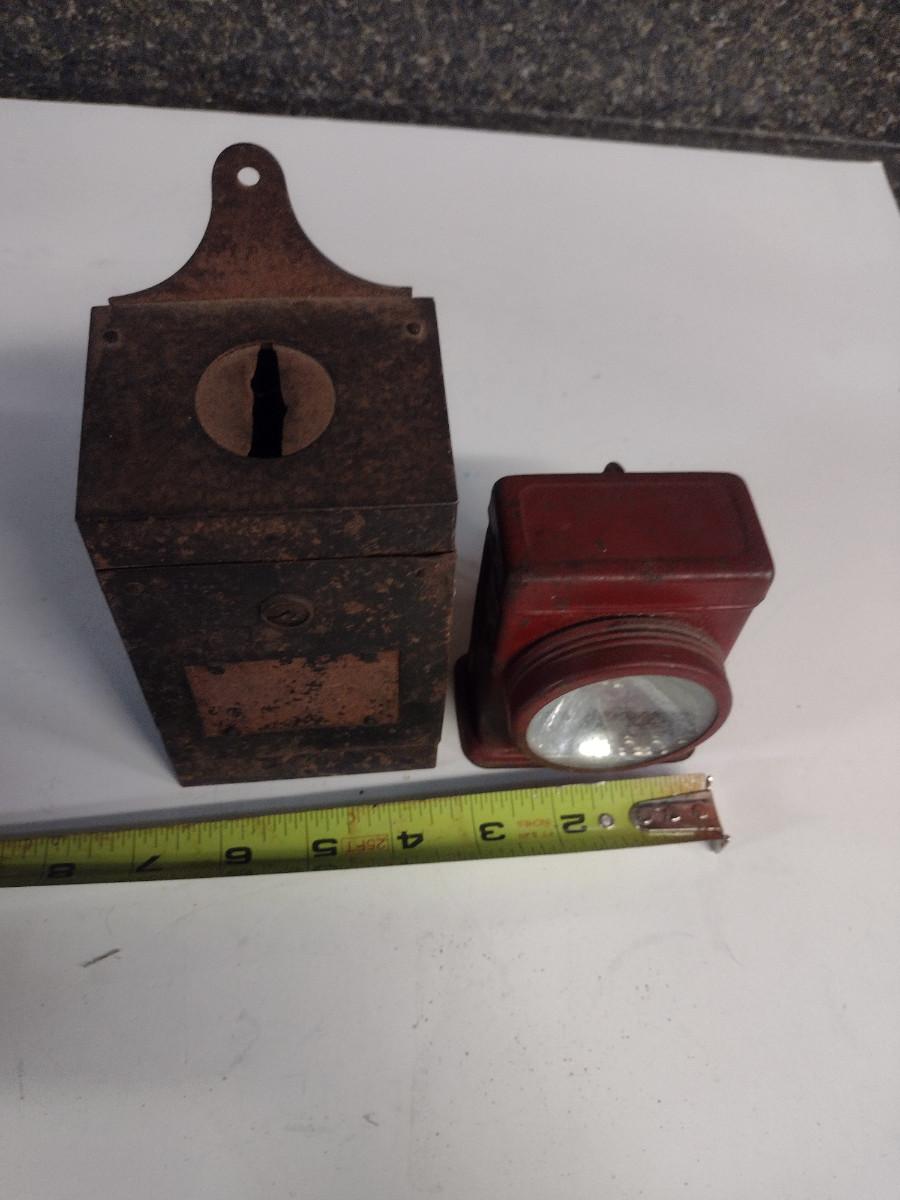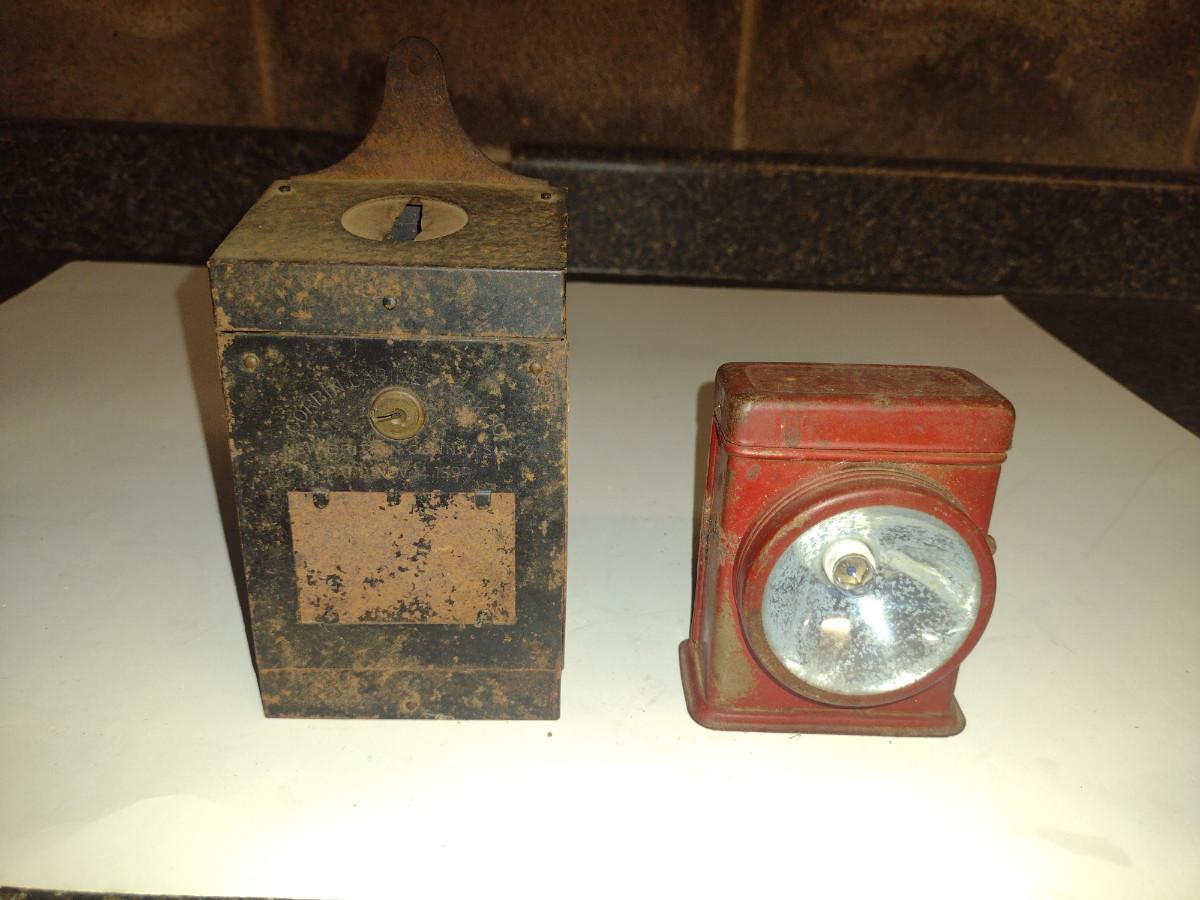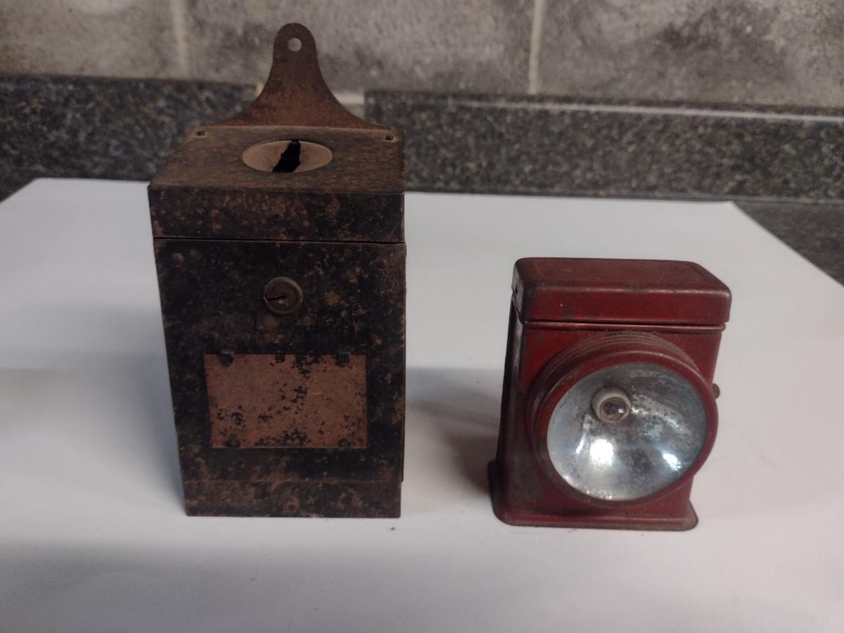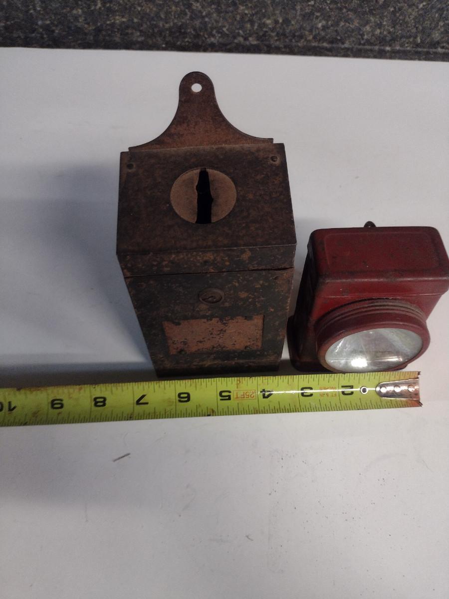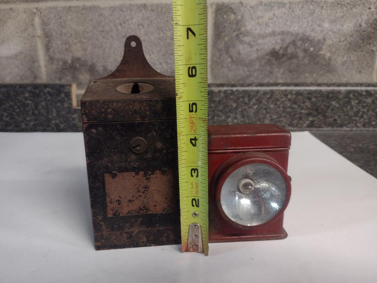 Pair of Vintage Collectibles- Metal Bank and Flashlight. Both pieces are in heavily worn condition- please see all pictures. No key available.