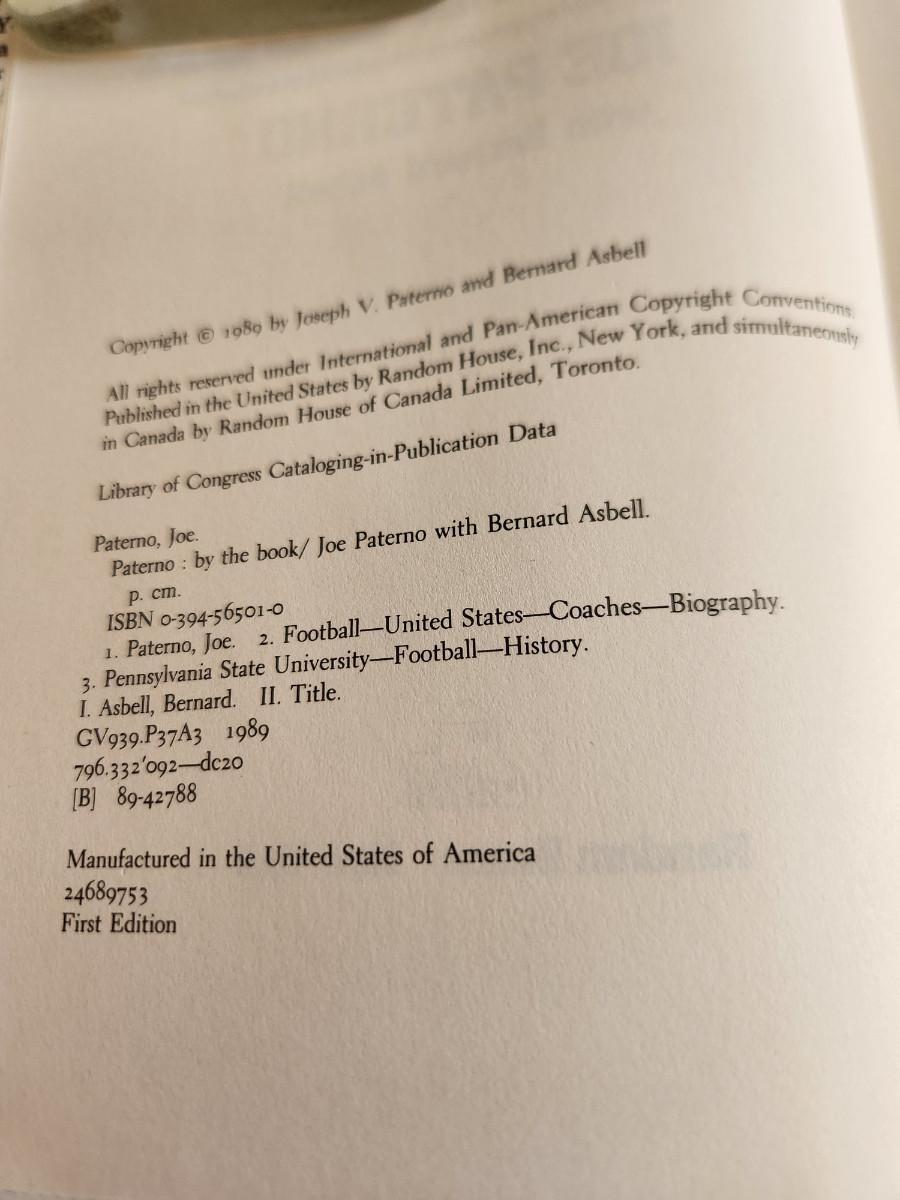 This auction lot is for a copy of Paterno By The Book by Joe Paterno - Autographed. This very clean hardbound copy with good dust jacket is in as new condition. The book written by the "infamous ?" coach is authentically authographed and ready for your read on the subject. Quite a collectible in the sports world. Published by Random House, 1989, 1st Edition. 287 Pages.