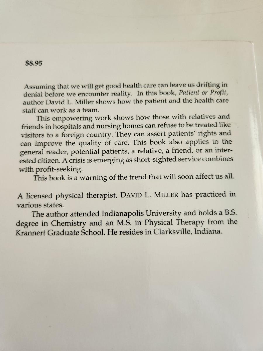 This auction lot is for the book Patient or Profit by David L. Miller - Autographed by the author with an addition of a photocopied collection of poems also signed by the author. The paperback booklet was published by Vantage Press in 1998. 56 pages, it is a treatise on American healthcare.