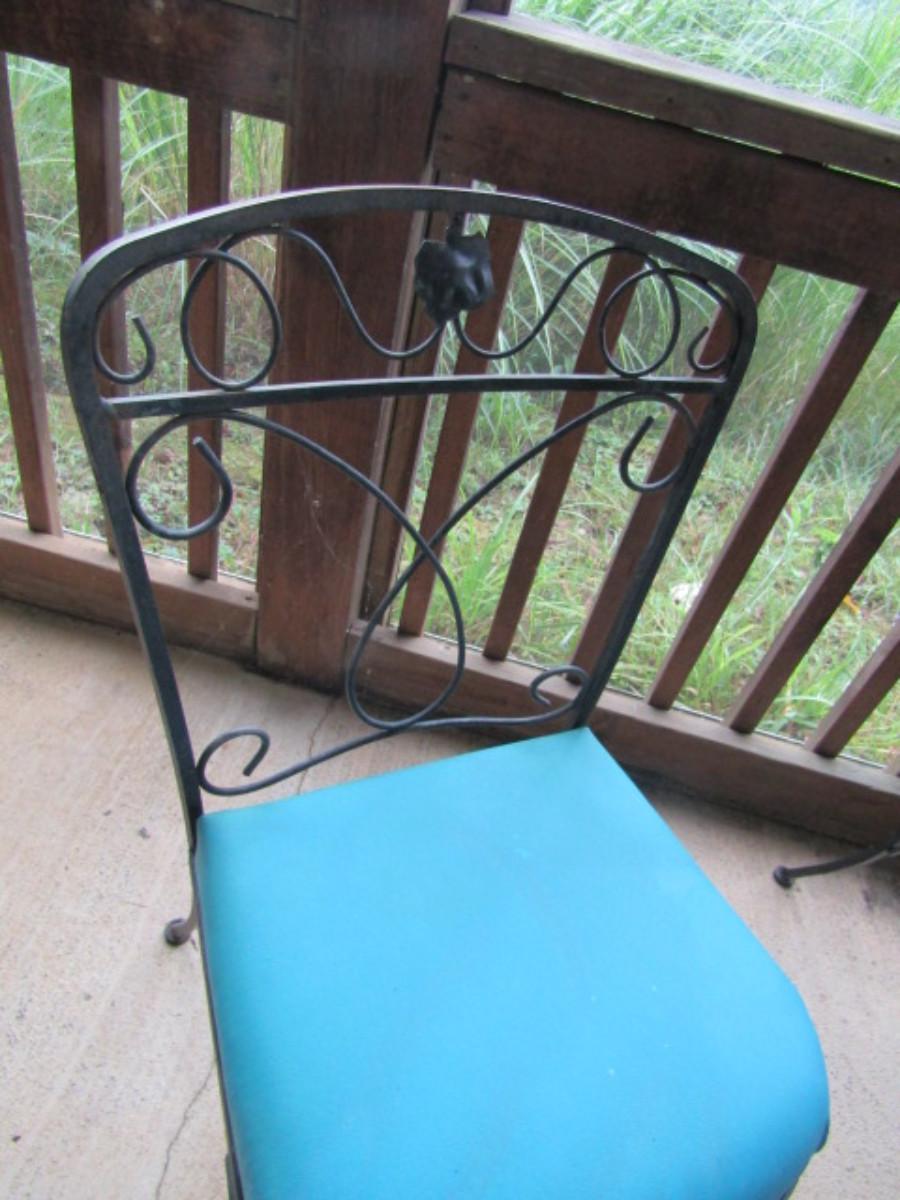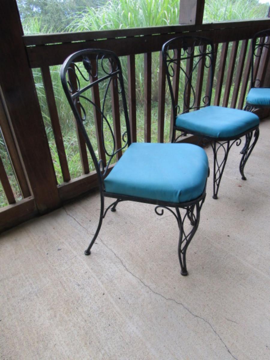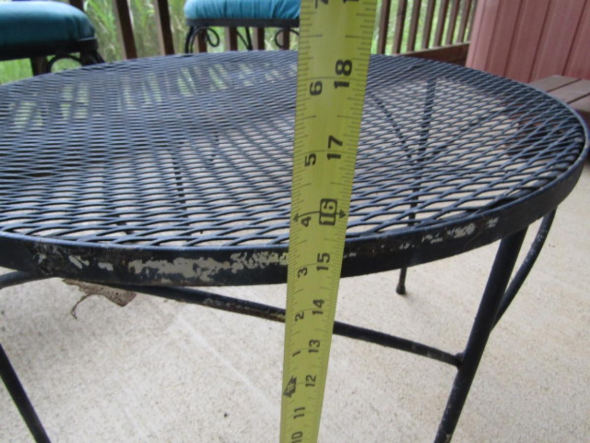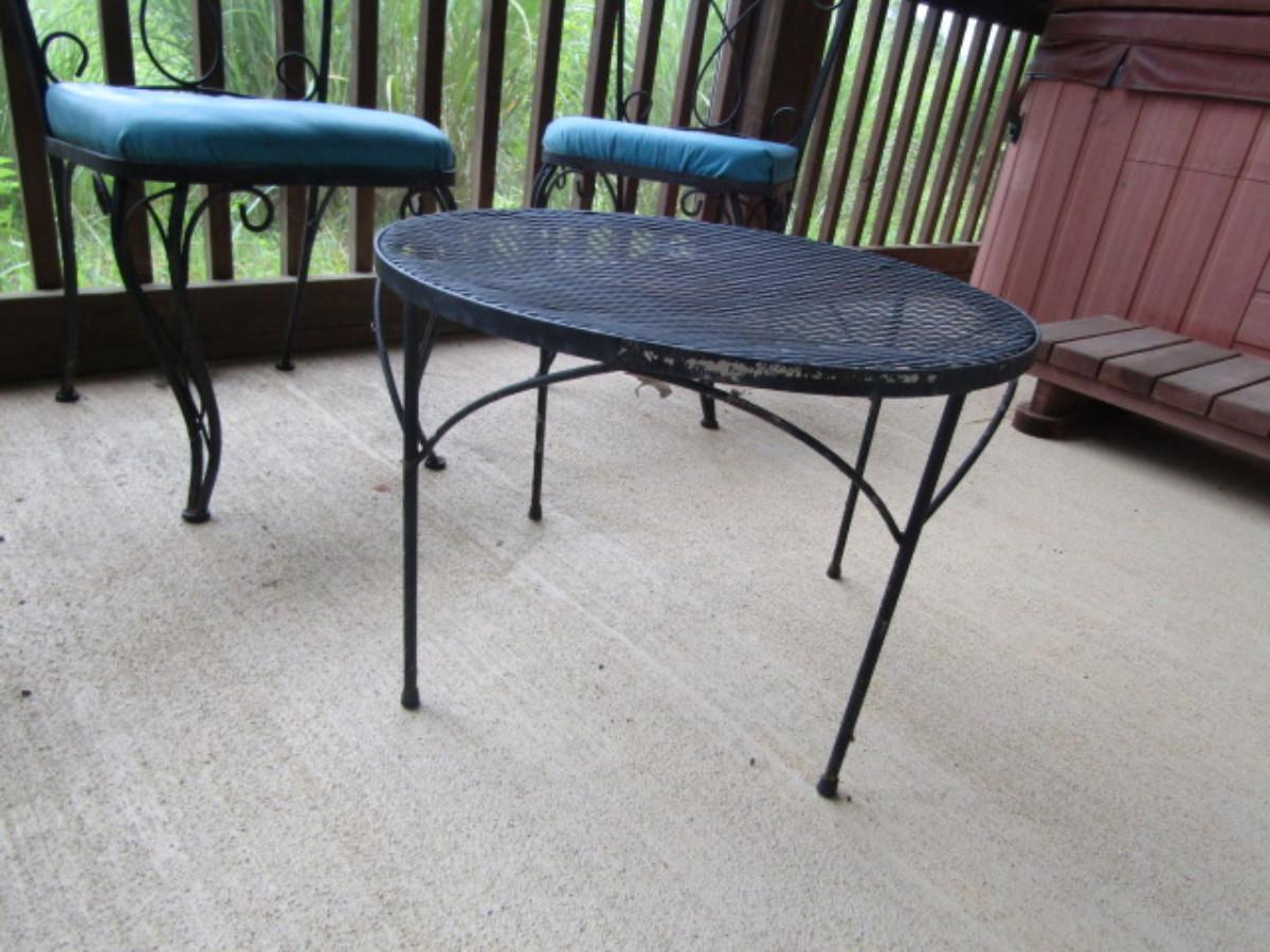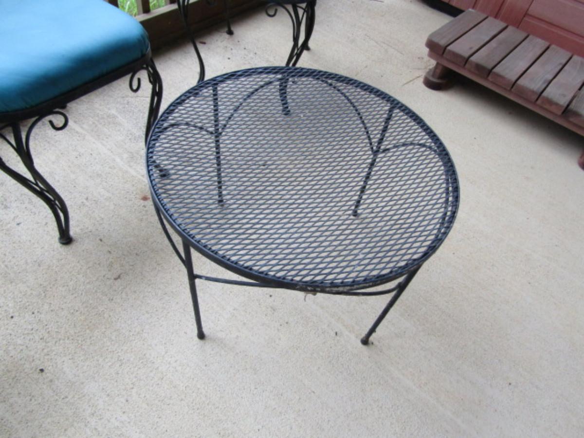 Patio Furniture- Three Wrought Metal Chairs and One Side Table. Chairs are approx 15 1/2" wide. Table is 23" in diameter and 15 1/2" tall.