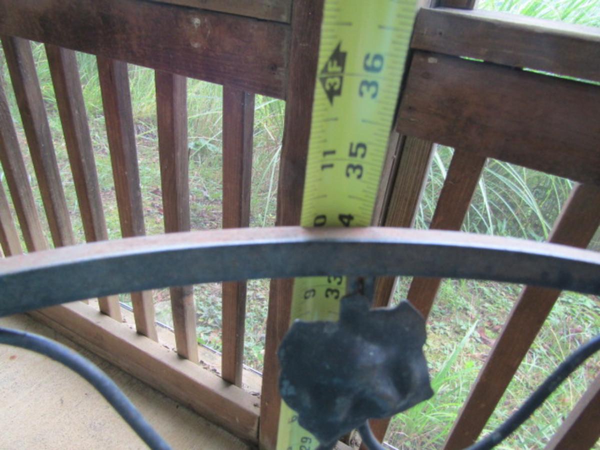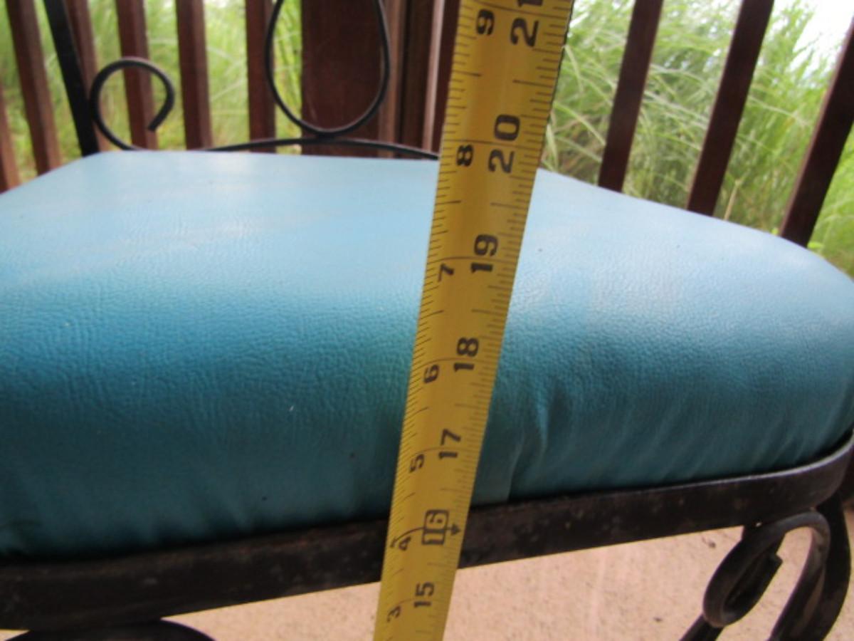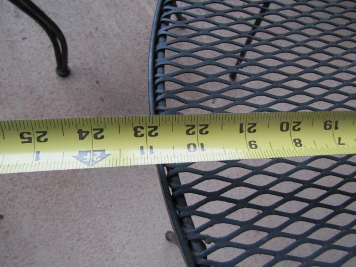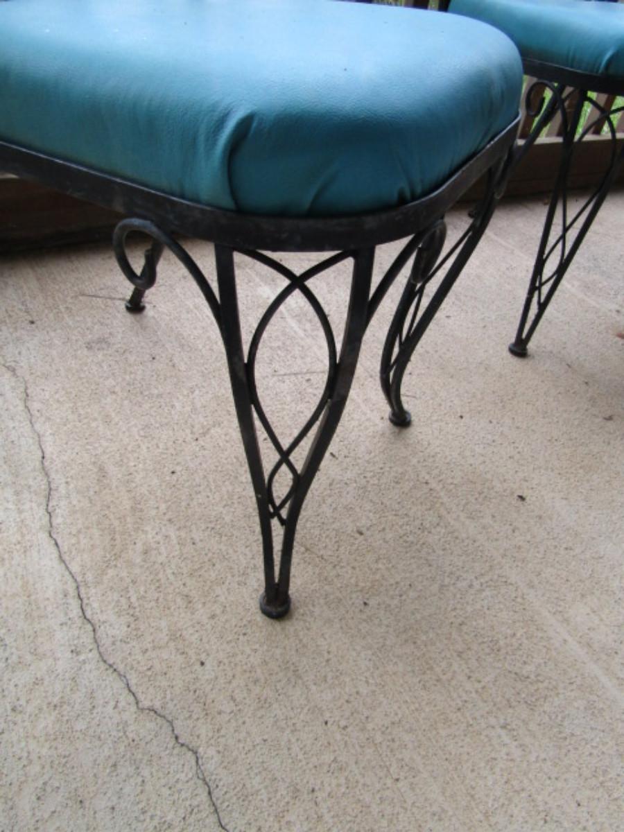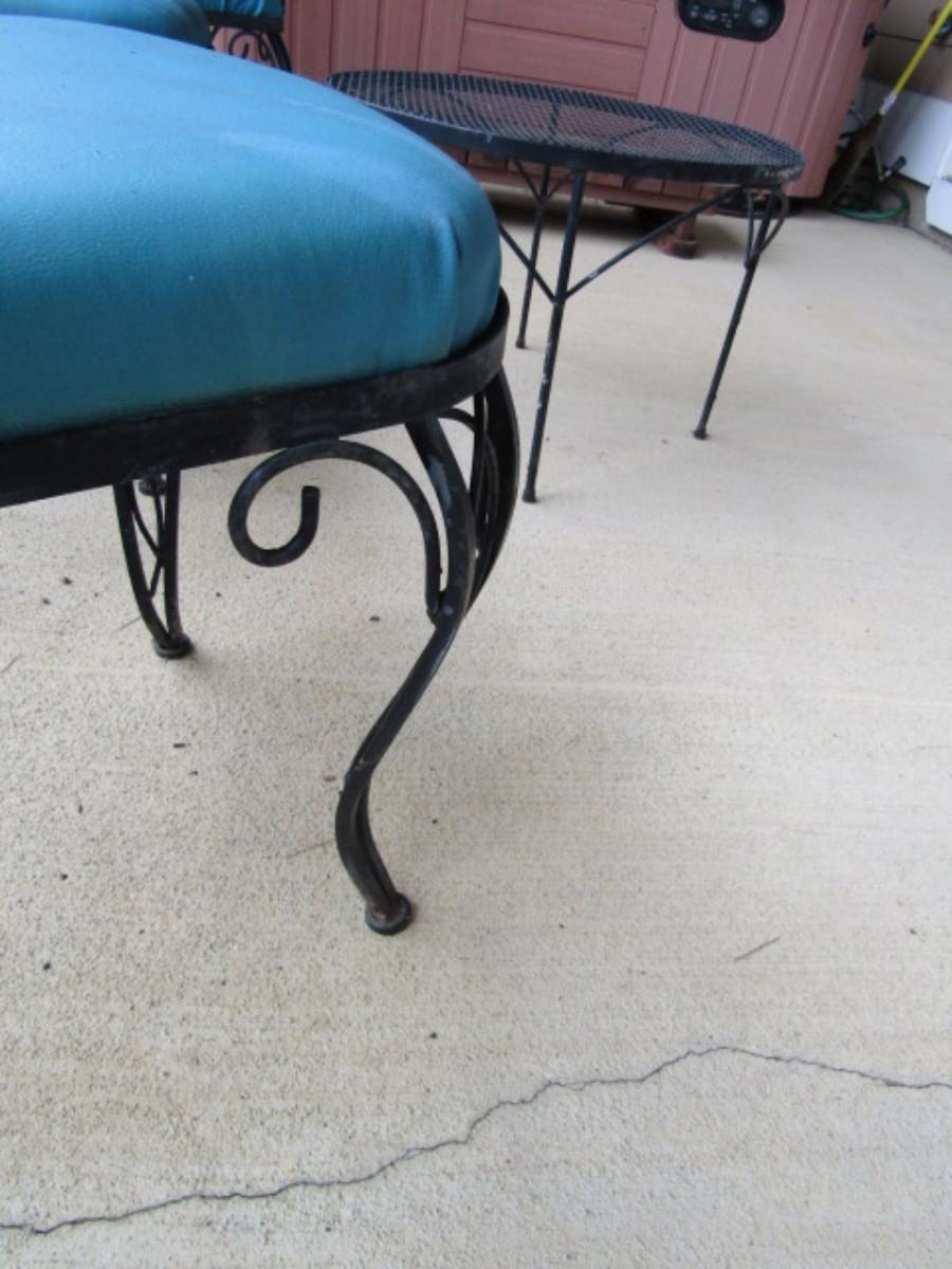 Patio Furniture- Three Wrought Metal Chairs and One Side Table. Chairs are approx 15 1/2" wide. Table is 23" in diameter and 15 1/2" tall.