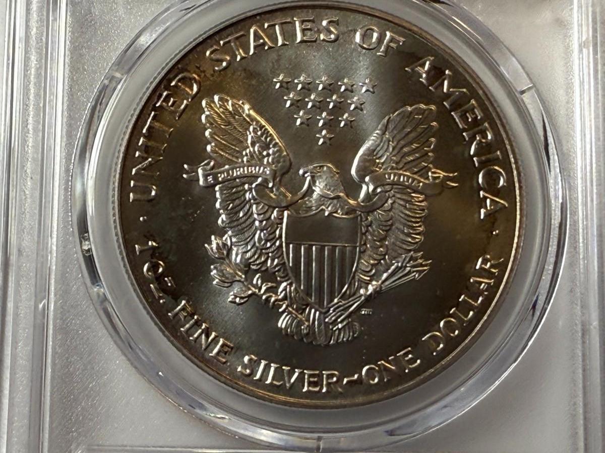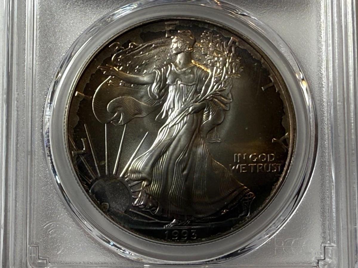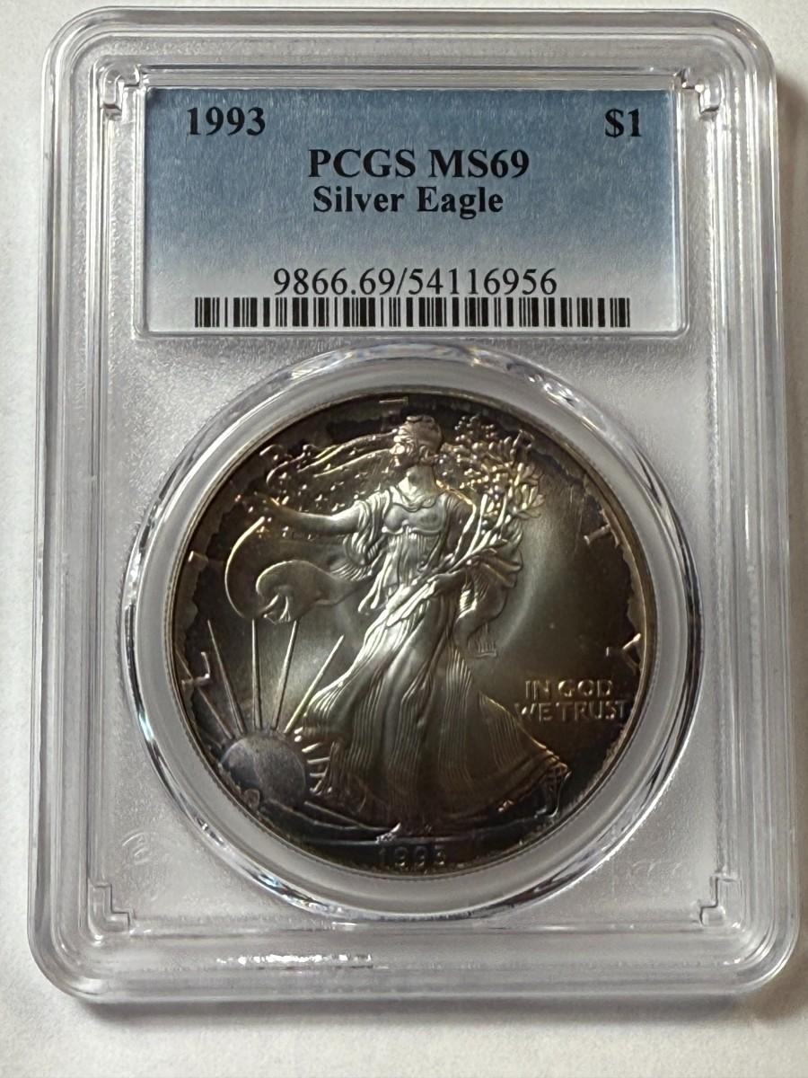 PCGS CERTIFIED 1993 MS69 NICELY TONED RIMS OBV. SILVER EAGLE DOLLAR AS PICTURED. $5 DOMESTIC SHIPPING.