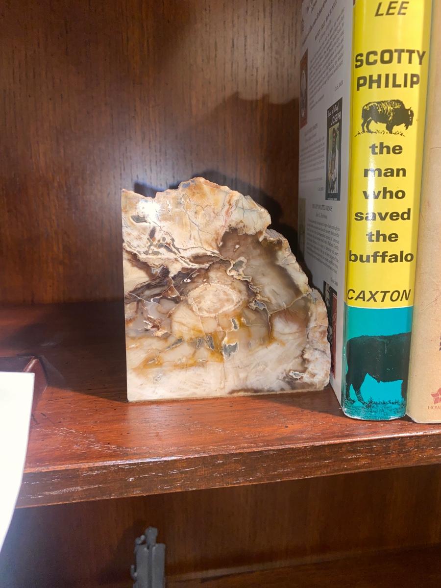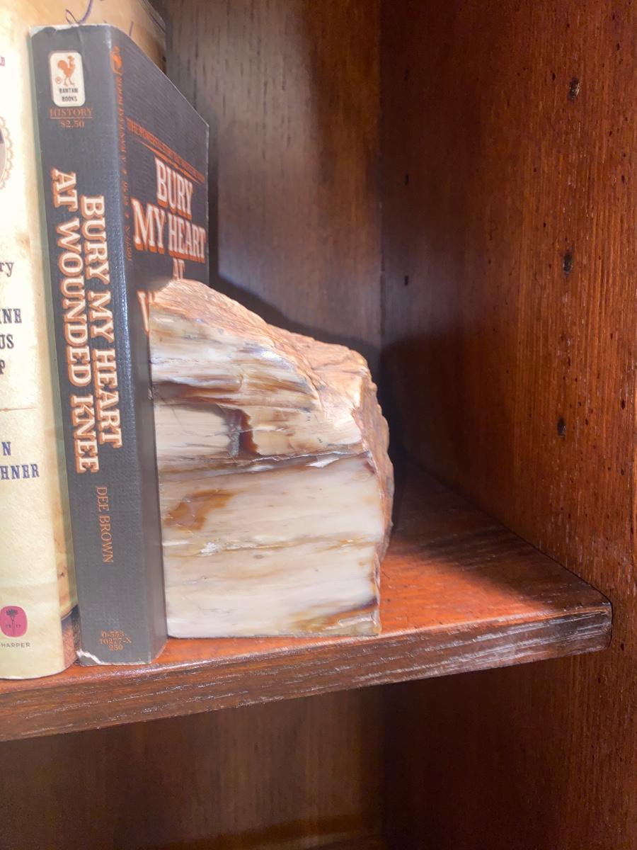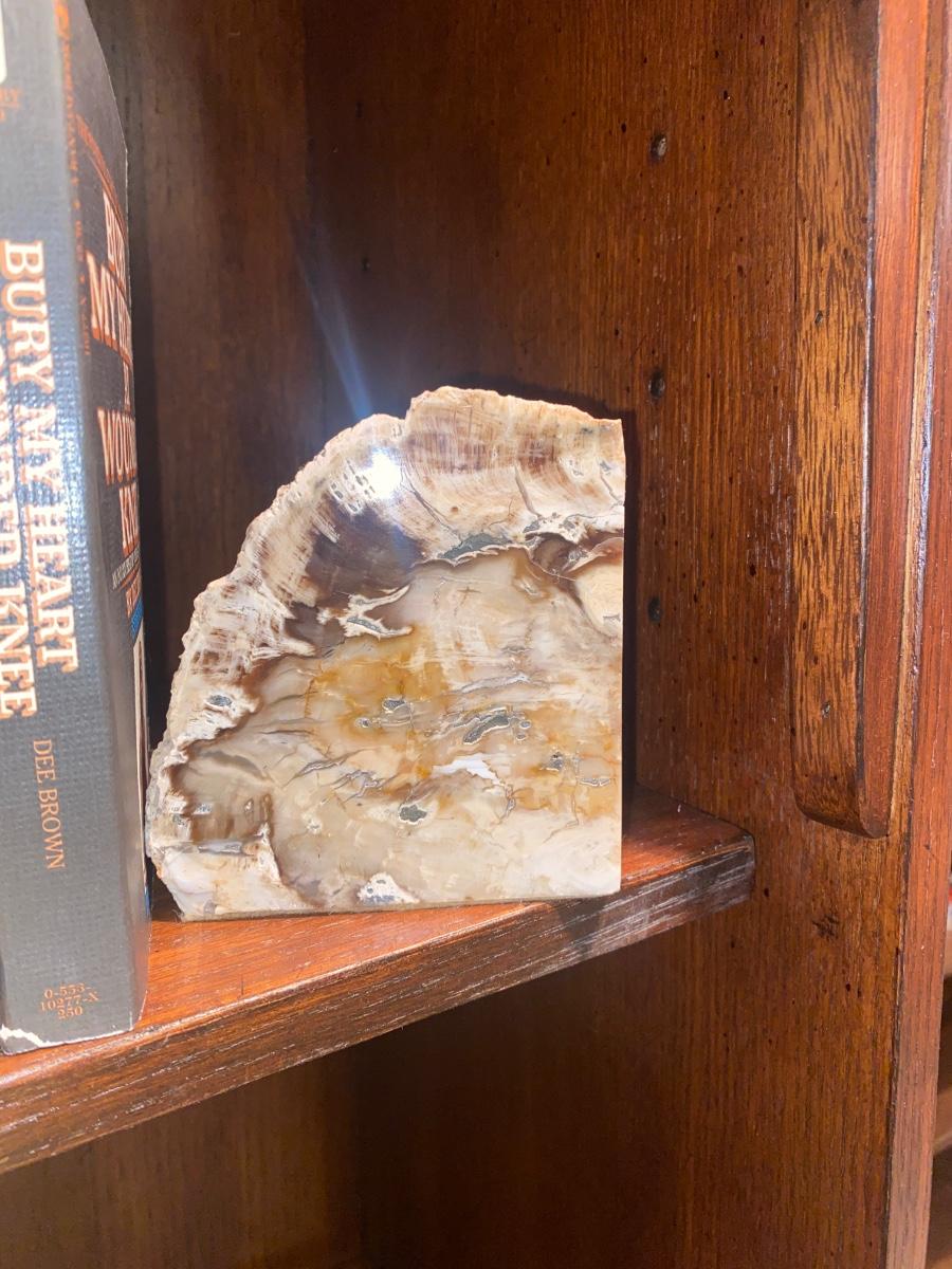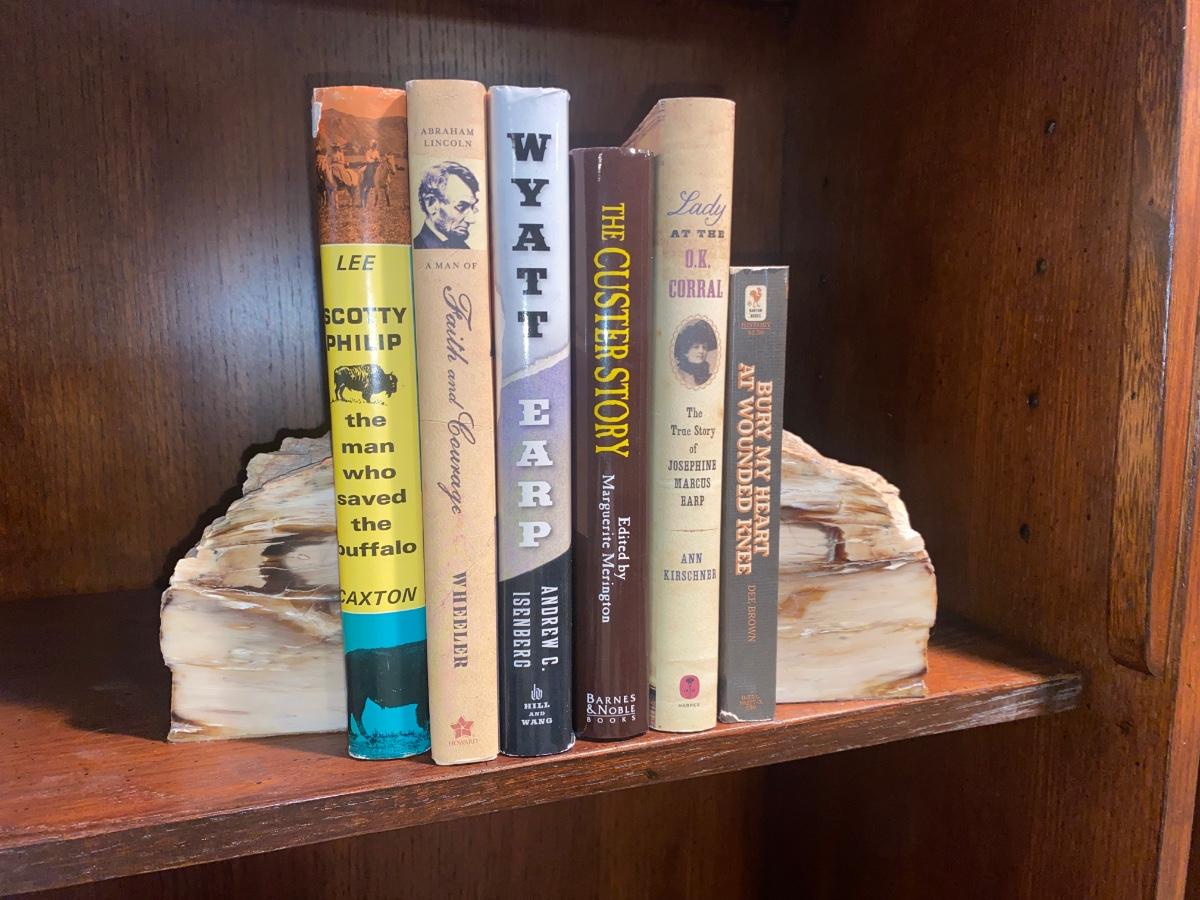 PETRIFIED WOOD BOOKENDS AND A SELECTION OF BOOKS