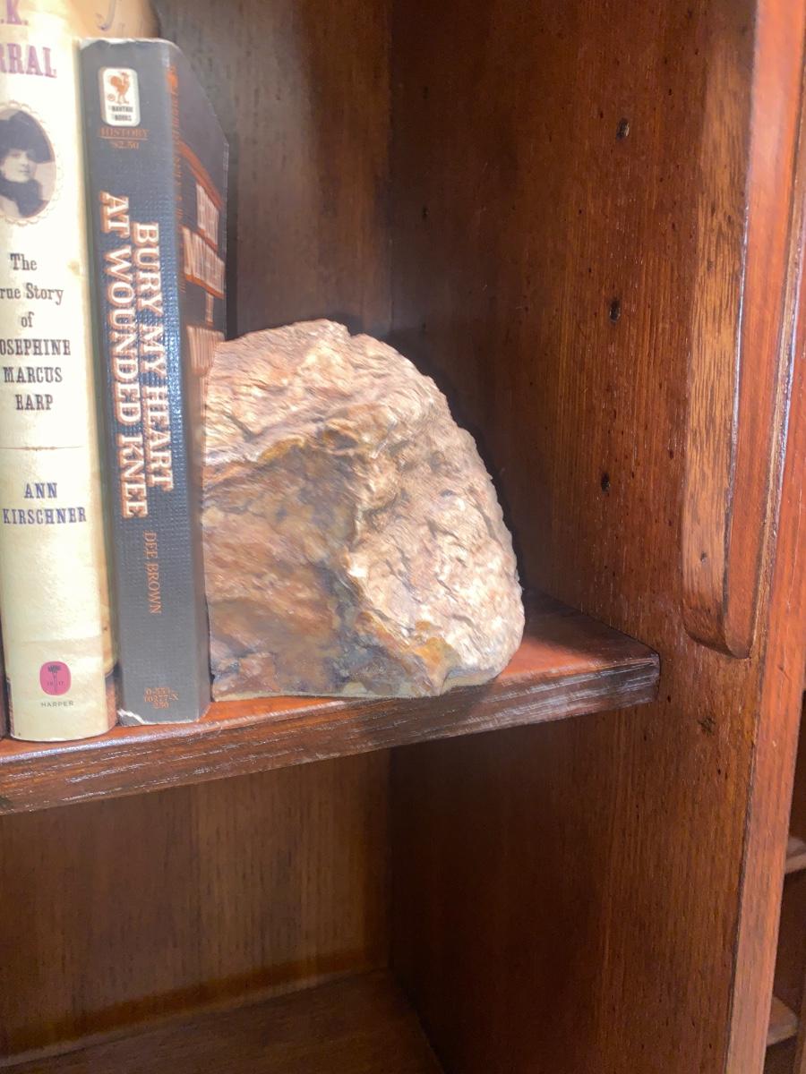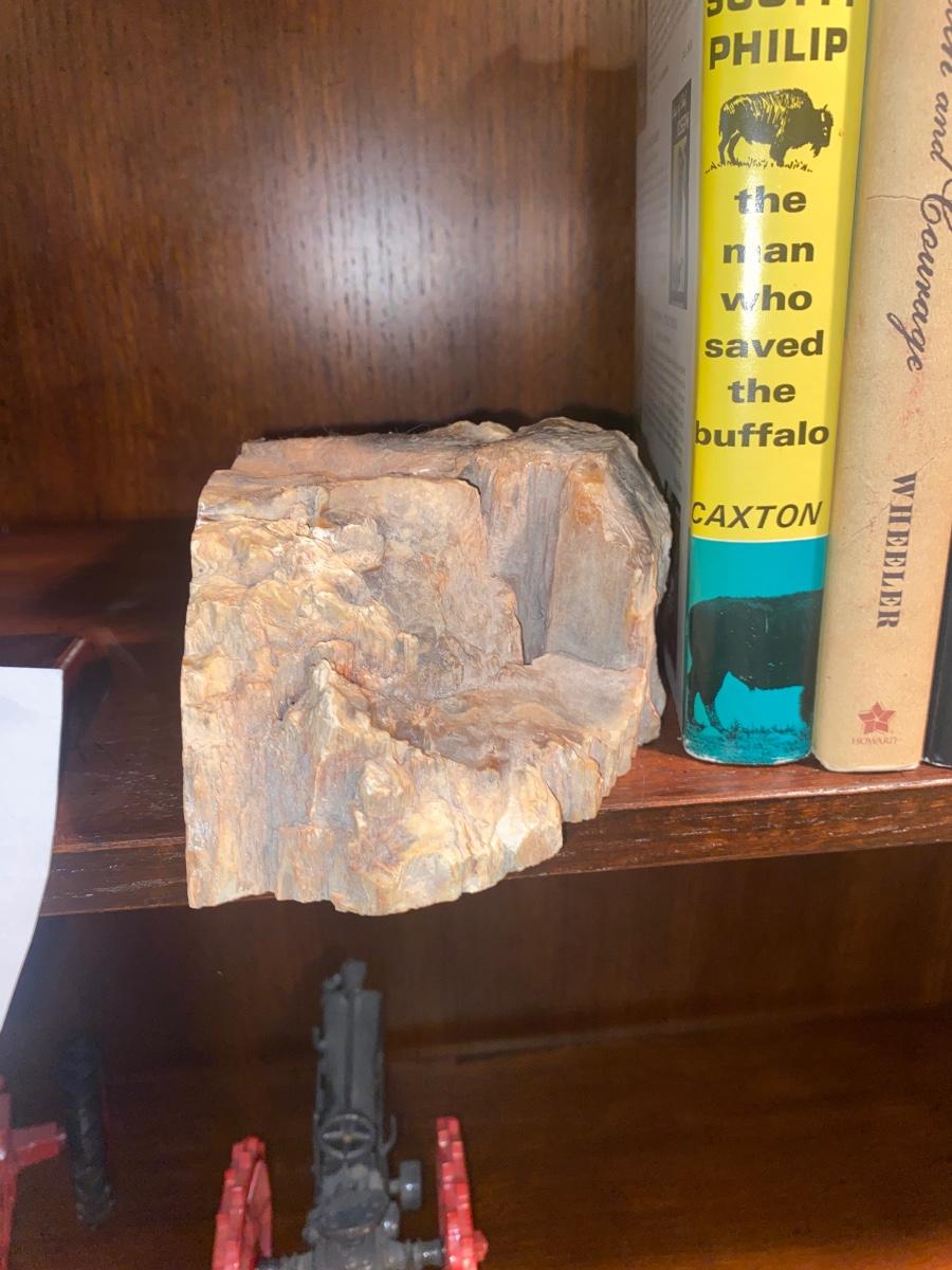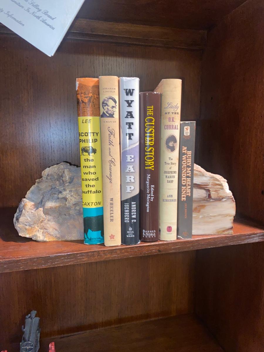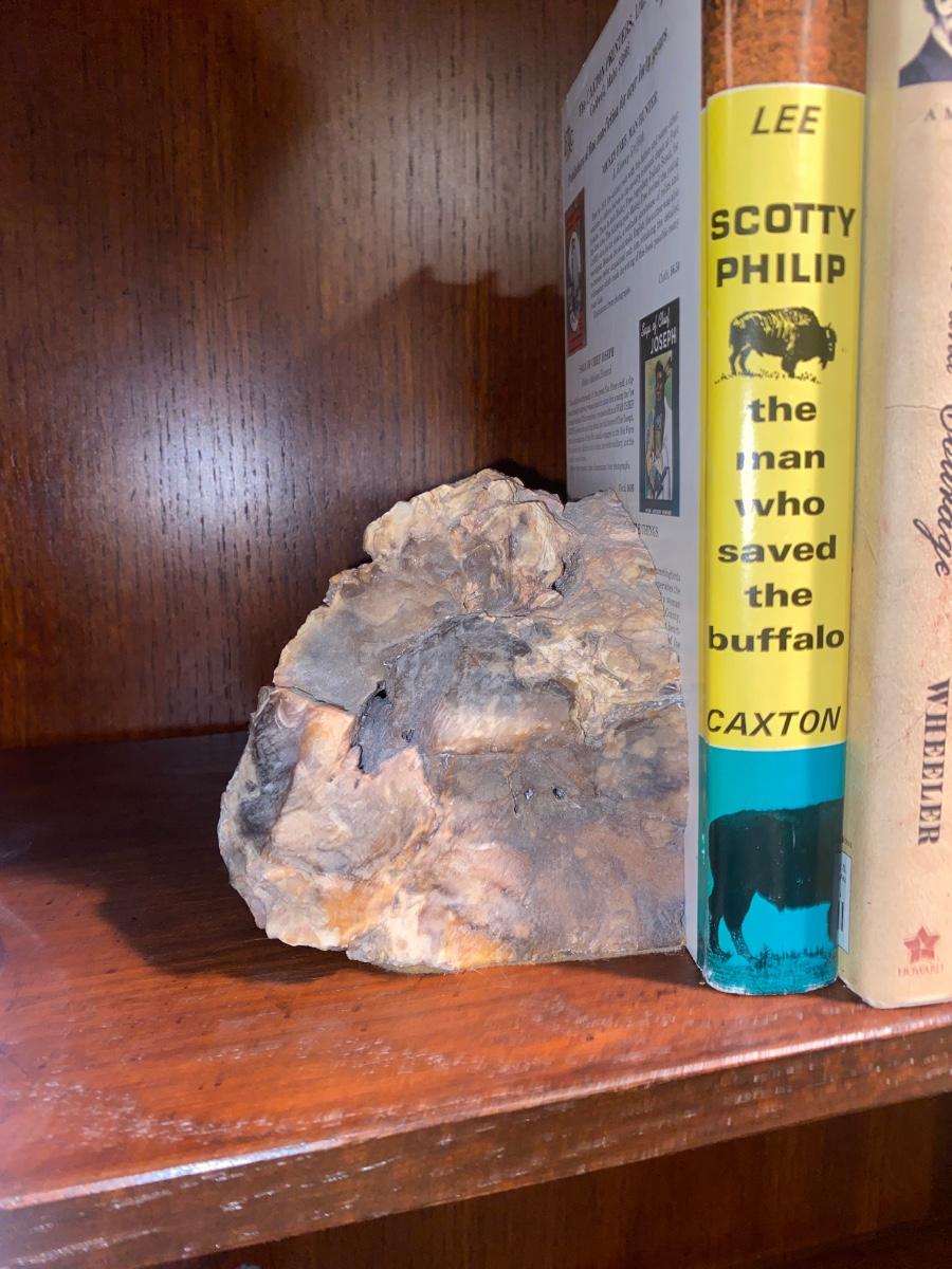 PETRIFIED WOOD BOOKENDS AND A SELECTION OF BOOKS