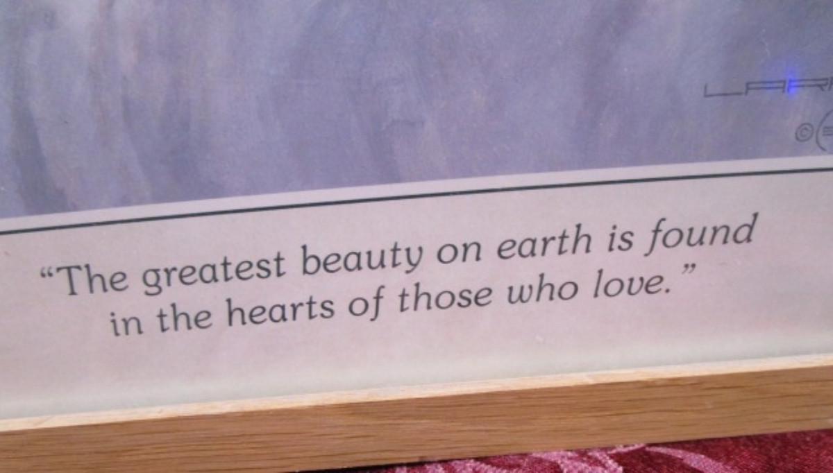 Caption: "The Greatest Beauty on Earth is Found in the Hearts of Those Who Love", 20-3/4" tall x 16-5/8" wide