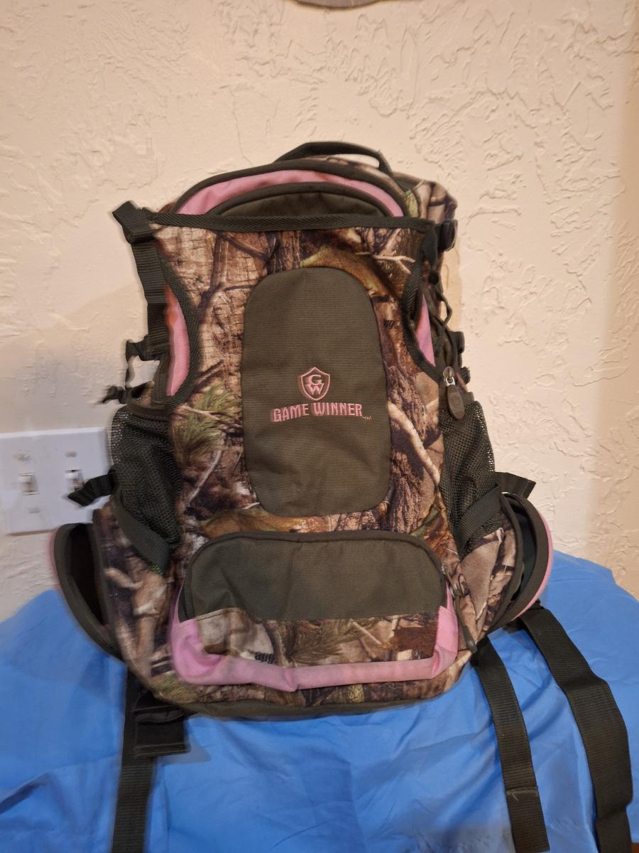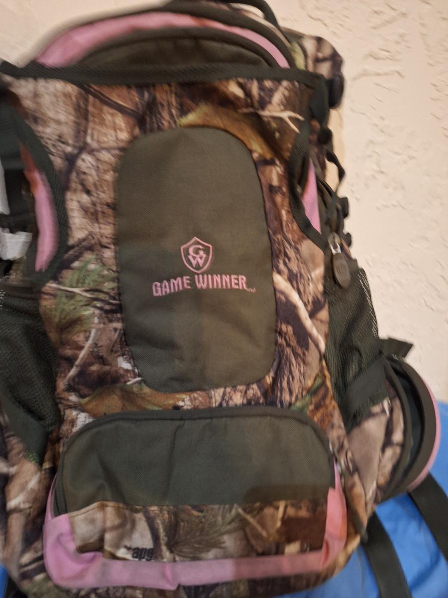 Pink and Camo Game winner backpack