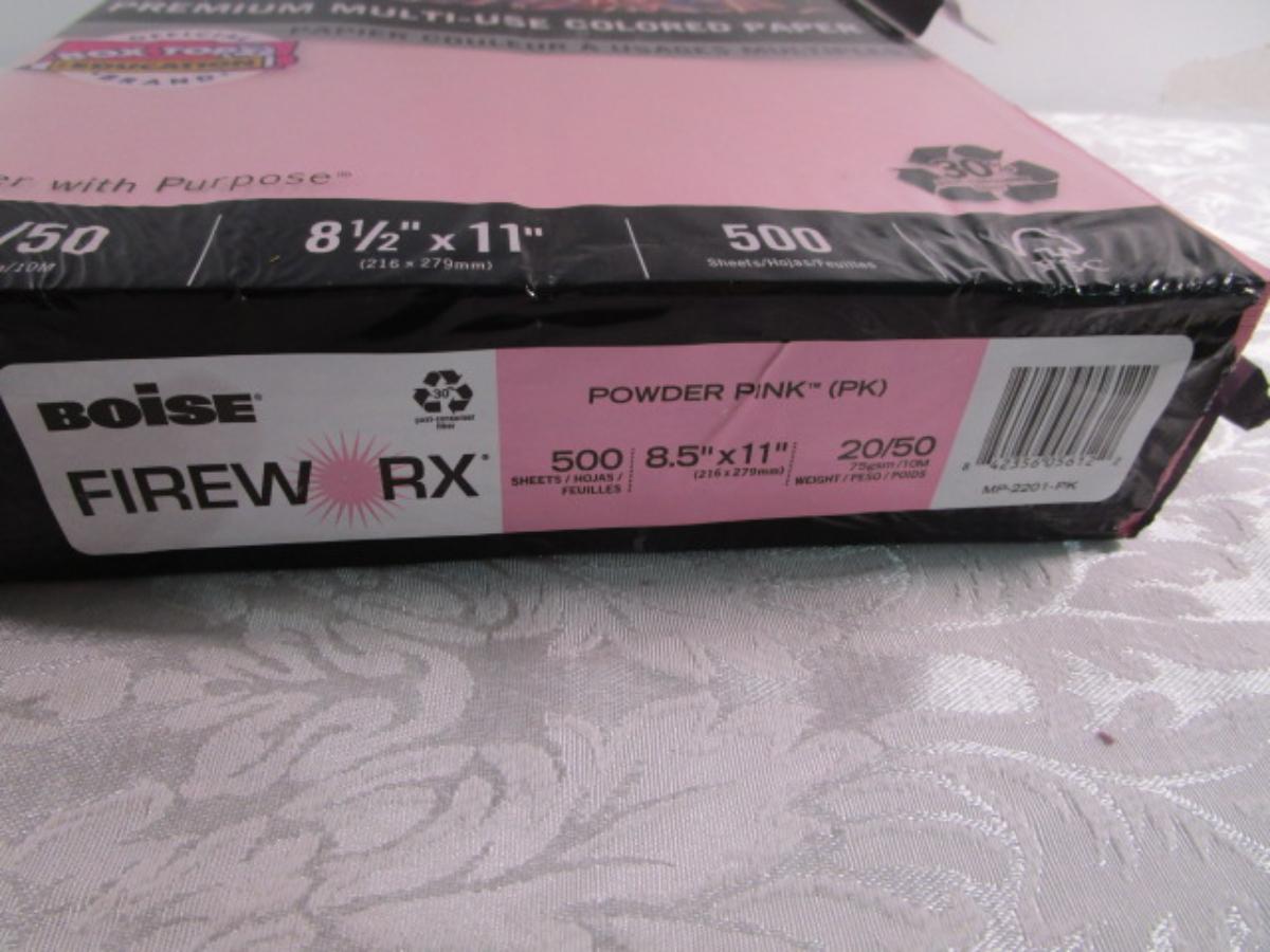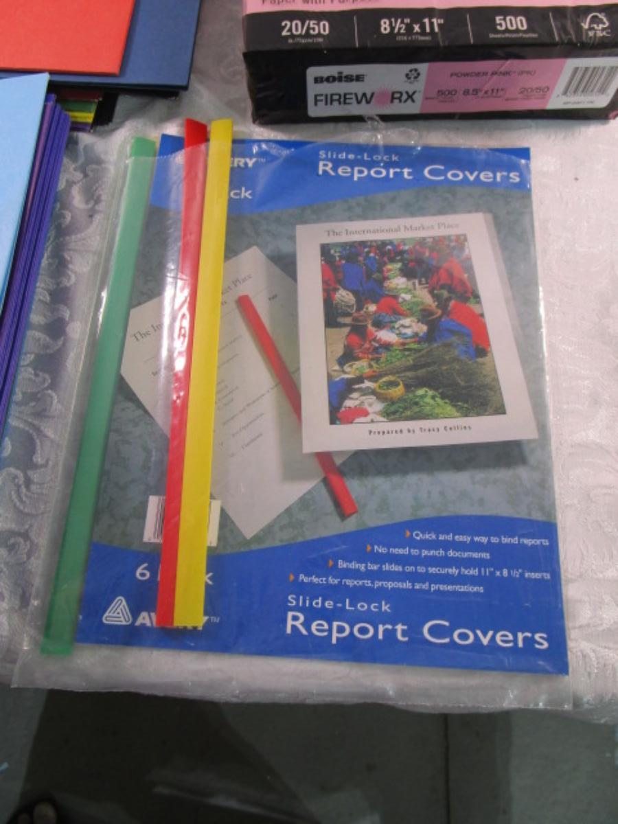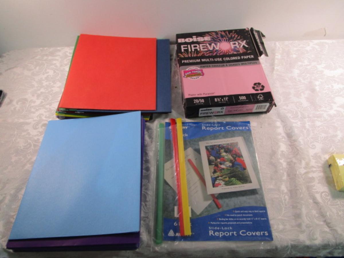 1 ream (500 sheets) powder pink paper, 3 clear report covers, 15 3-prong report covers, 21 2-pocket folders