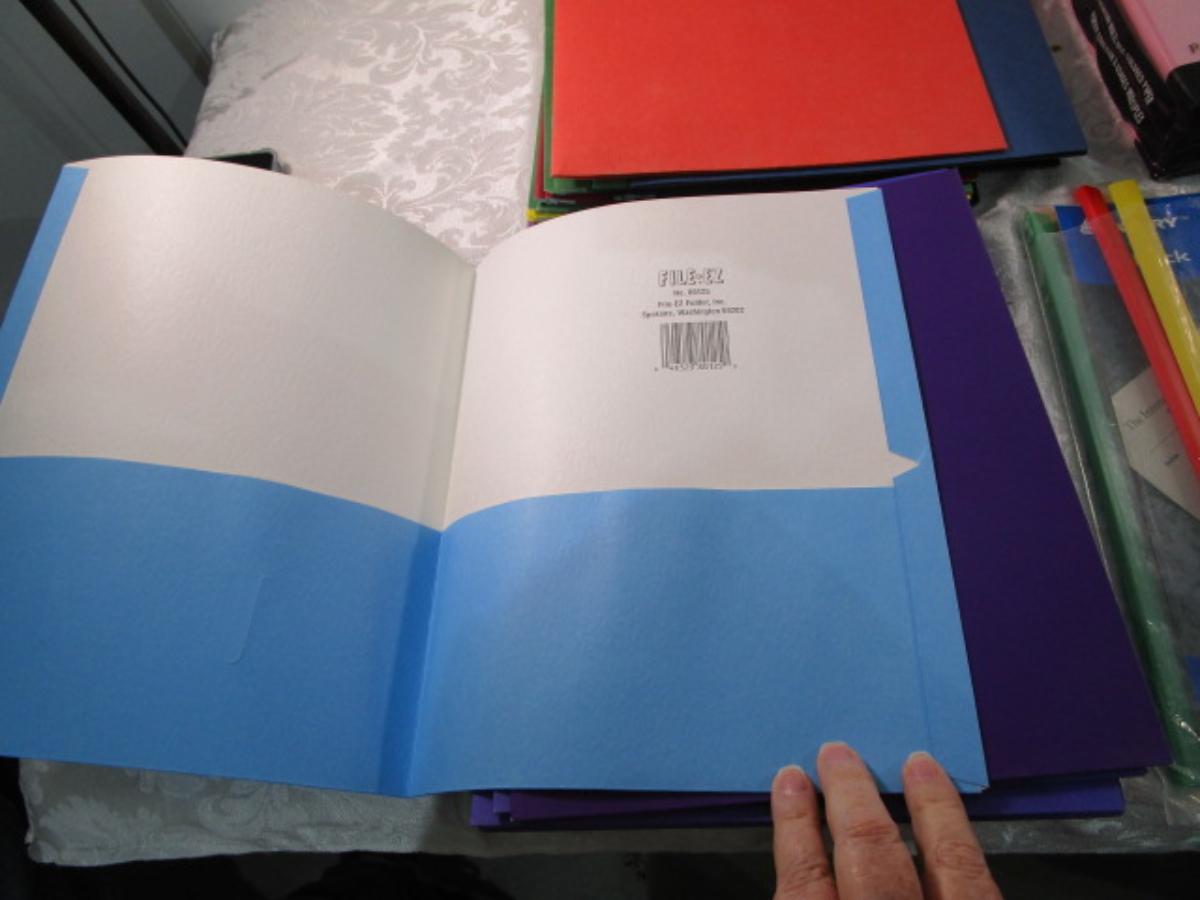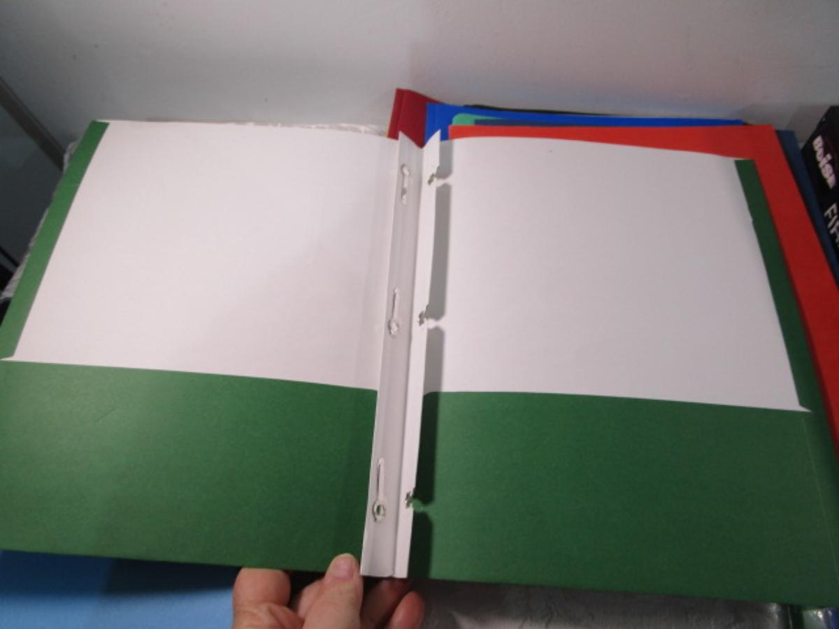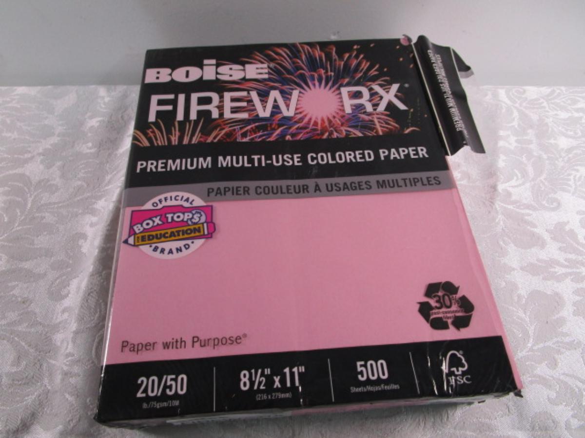 1 ream (500 sheets) powder pink paper, 3 clear report covers, 15 3-prong report covers, 21 2-pocket folders