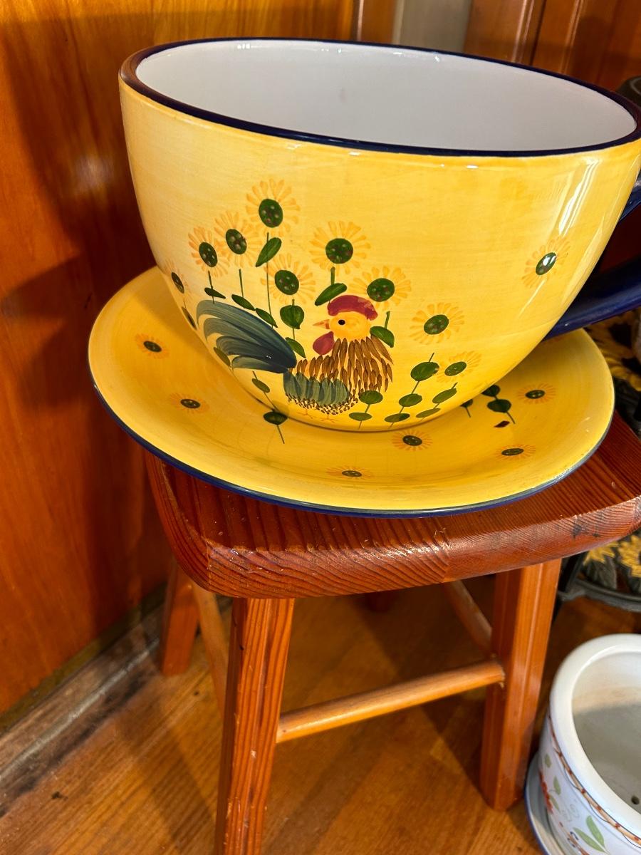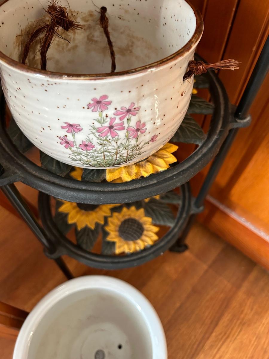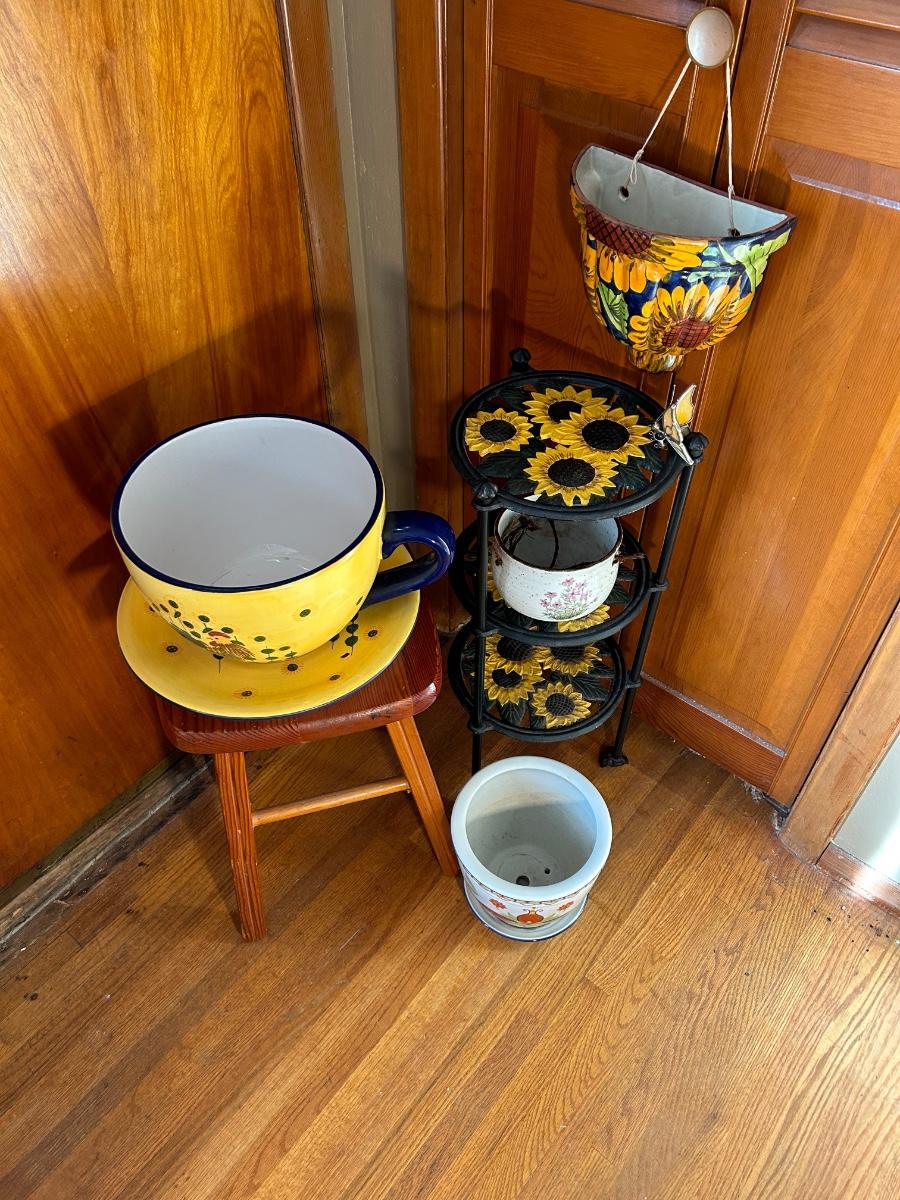 Rod iron 3tier shelf sunflower motif .2 ft high by 10 inches wide. Medium sized planter (on floor) has attached drainage plate. Small white planter has rope for hanging. The 1/2 circle planter with sunflowers on it. Large cup and saucer is 7 inches high by 11 inches wide opening. ** wood stool Not included* staging use only! Thanks for bidding.