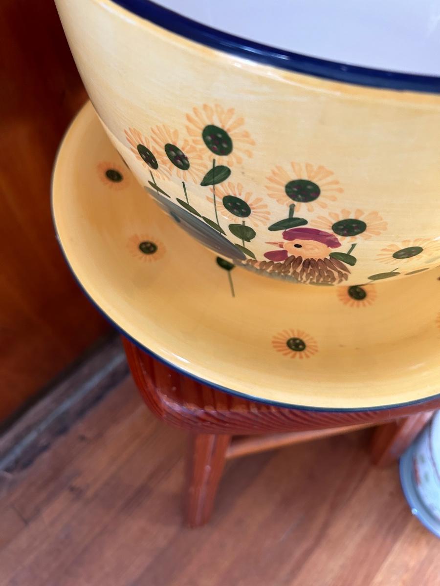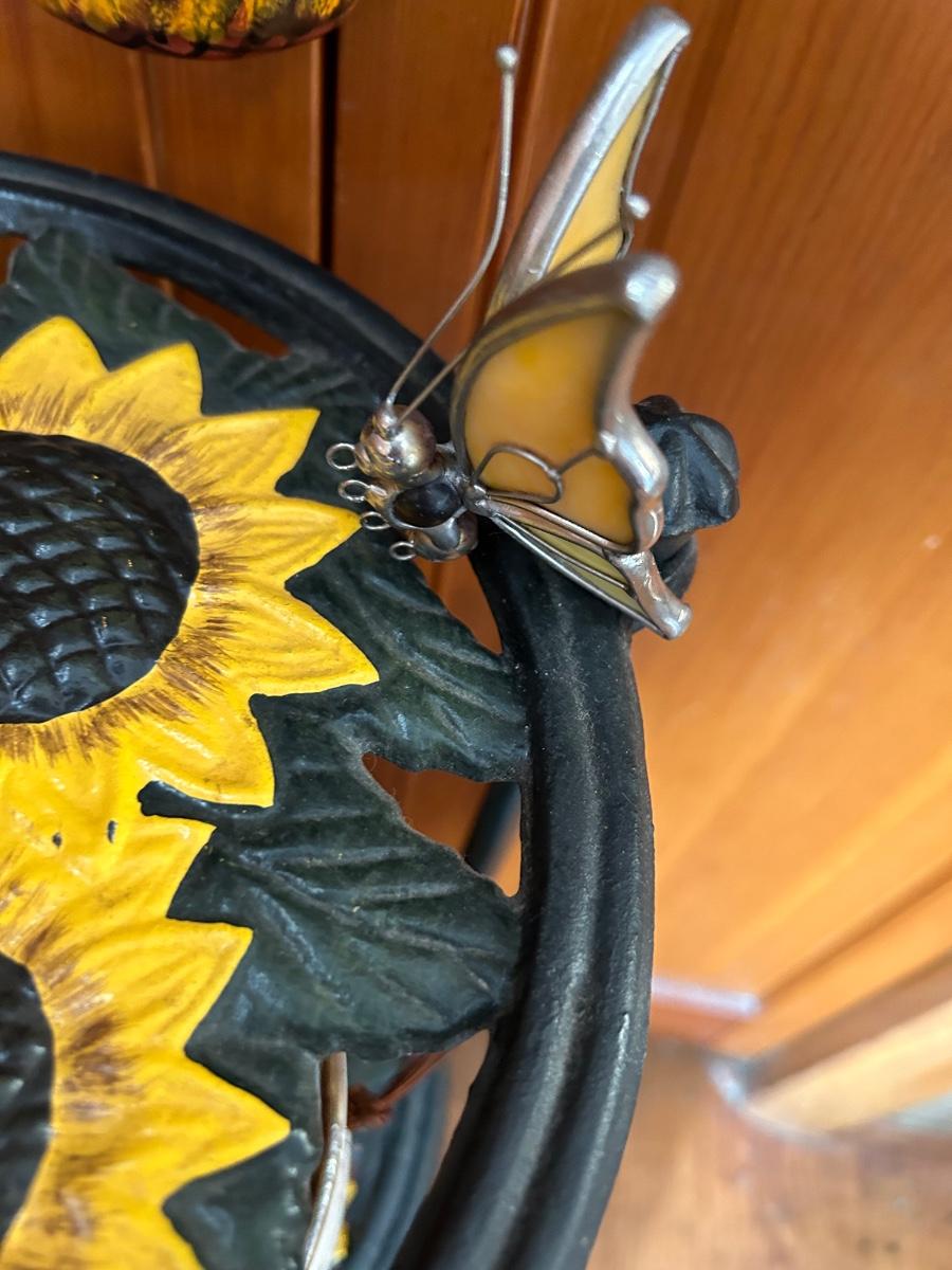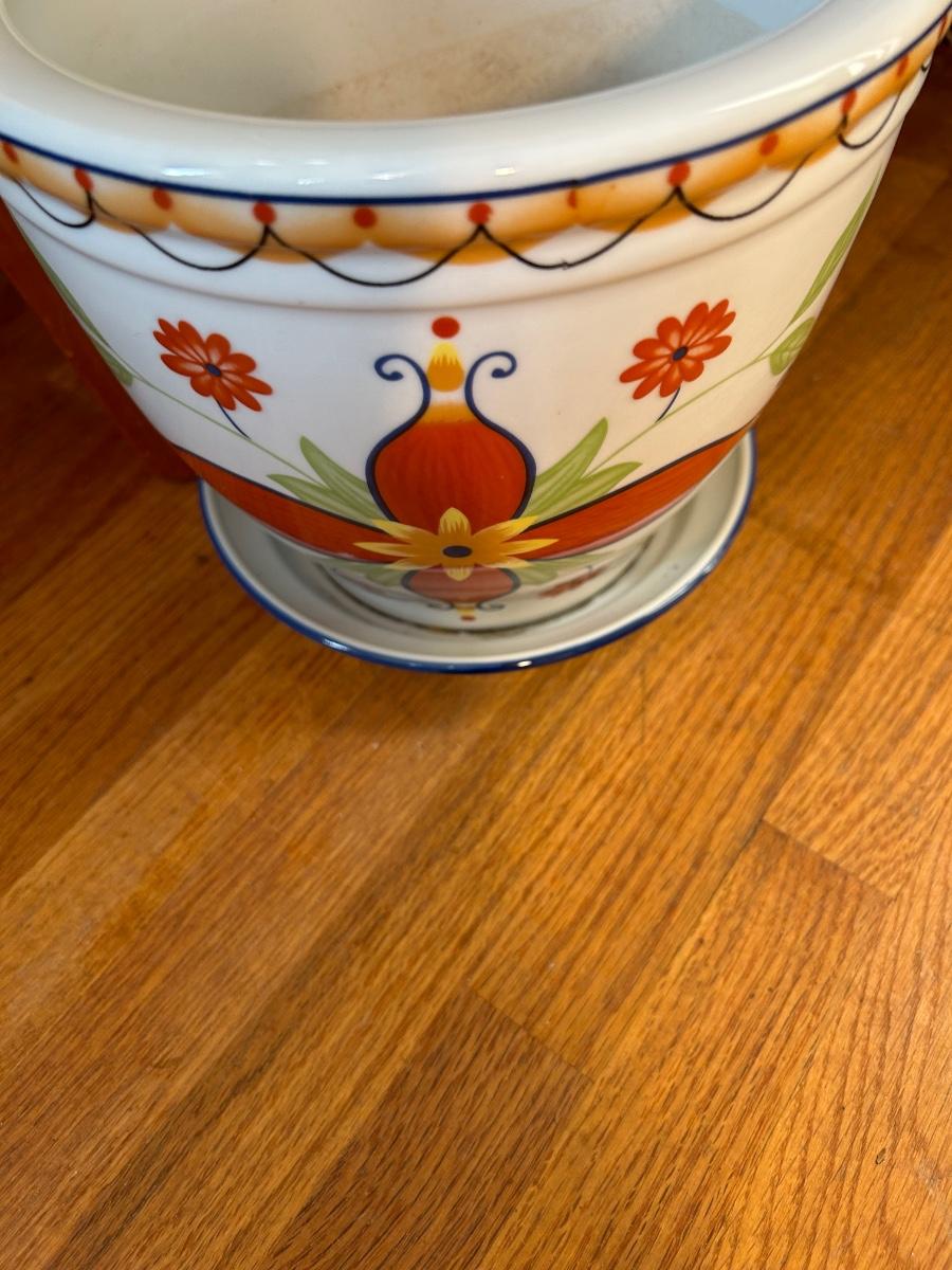 Rod iron 3tier shelf sunflower motif .2 ft high by 10 inches wide. Medium sized planter (on floor) has attached drainage plate. Small white planter has rope for hanging. The 1/2 circle planter with sunflowers on it. Large cup and saucer is 7 inches high by 11 inches wide opening. ** wood stool Not included* staging use only! Thanks for bidding.
