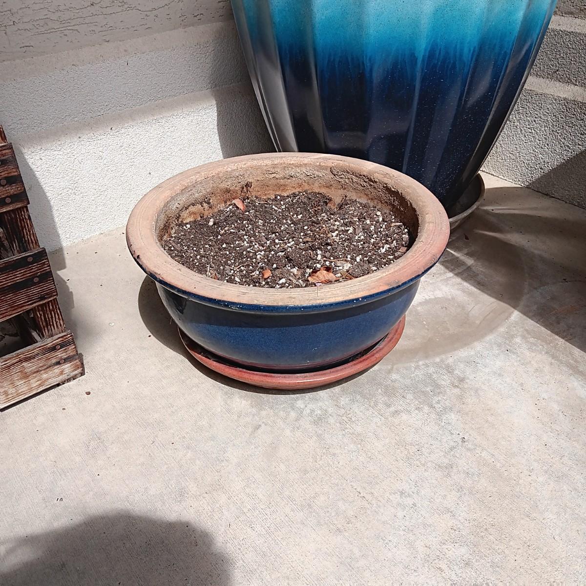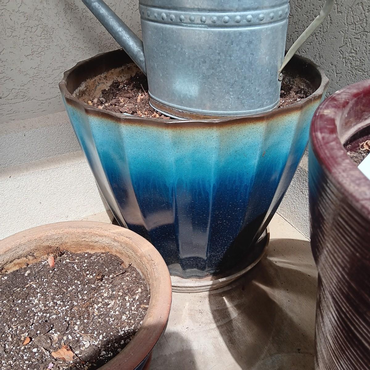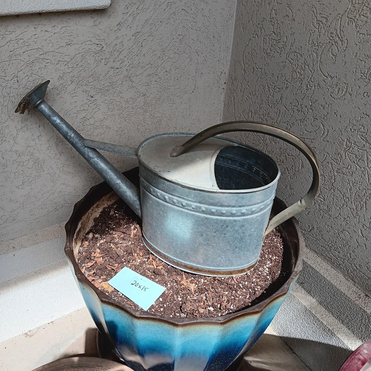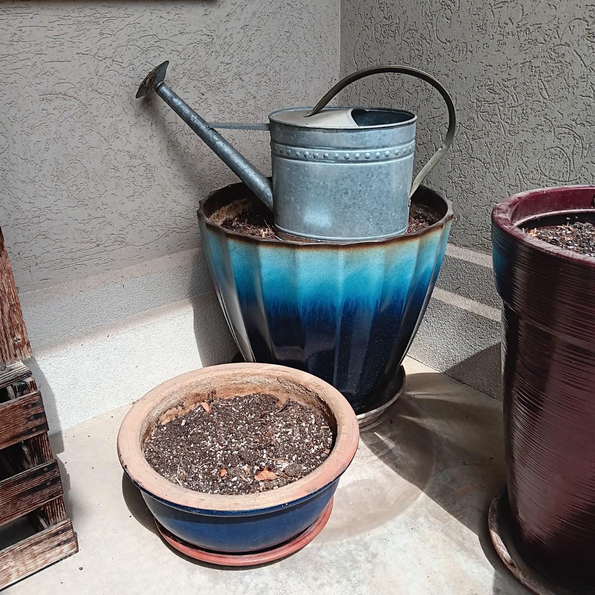 PLASTIC LARGER AND CLAY FLOWER POTS PLUS METAL WATERING CAN