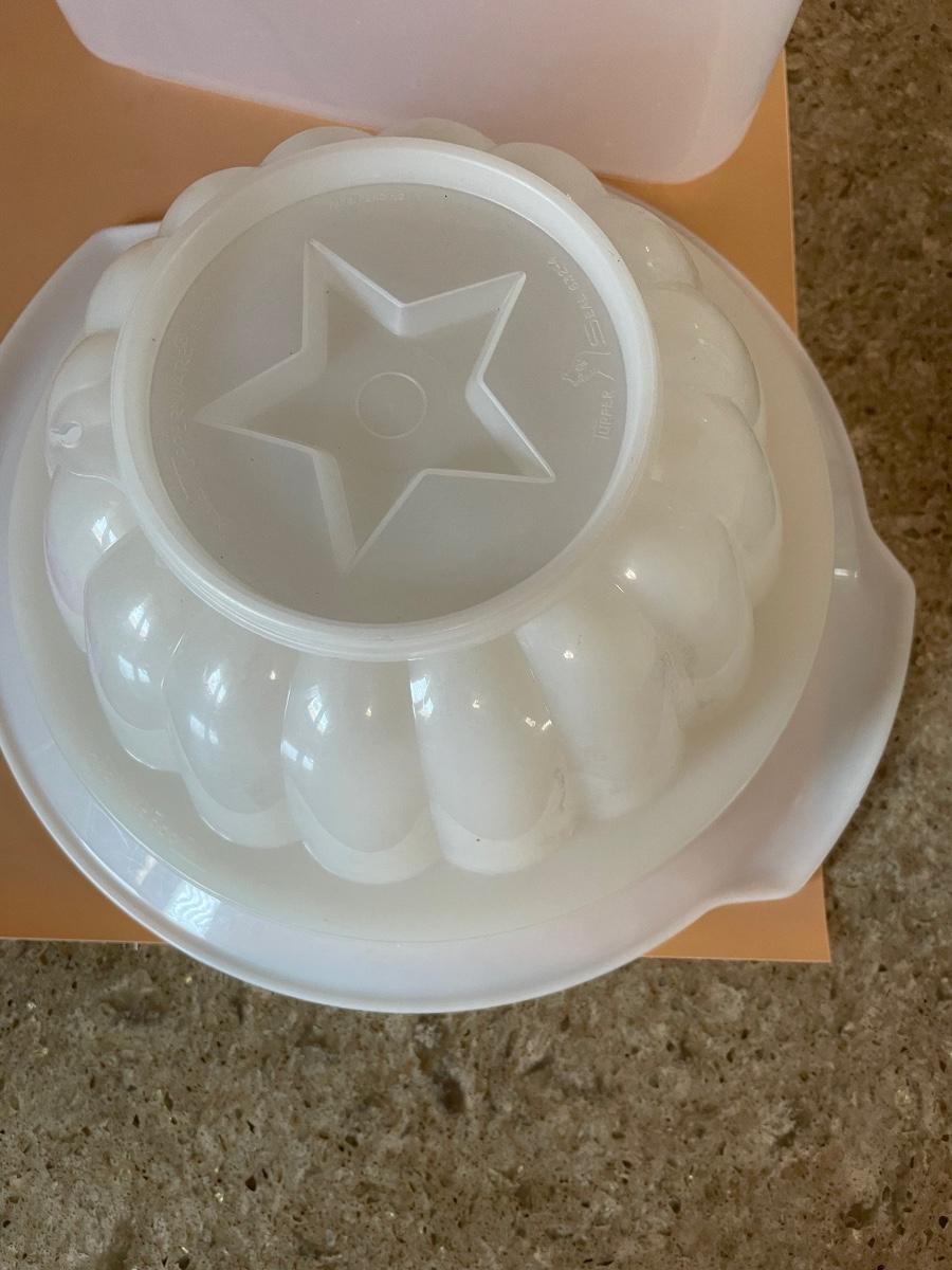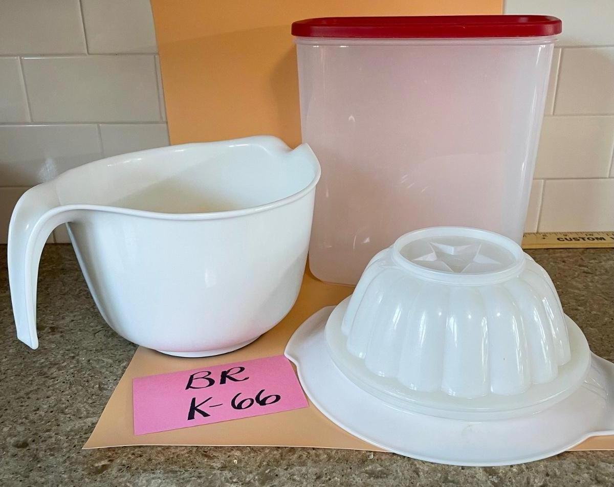 Great holiday Tupperware jello mold with different plates to change things up. Mixing bowl how some staining but lots of life and cereal holder.