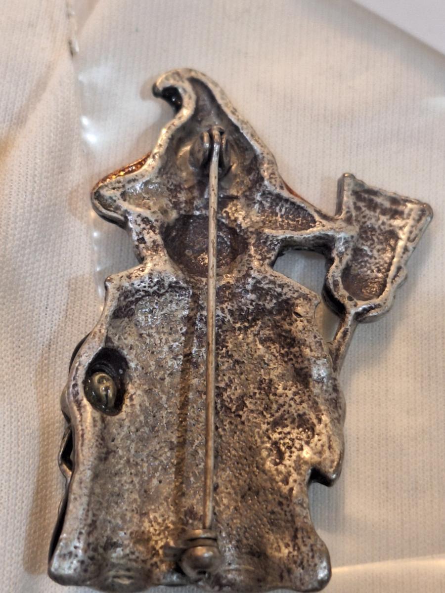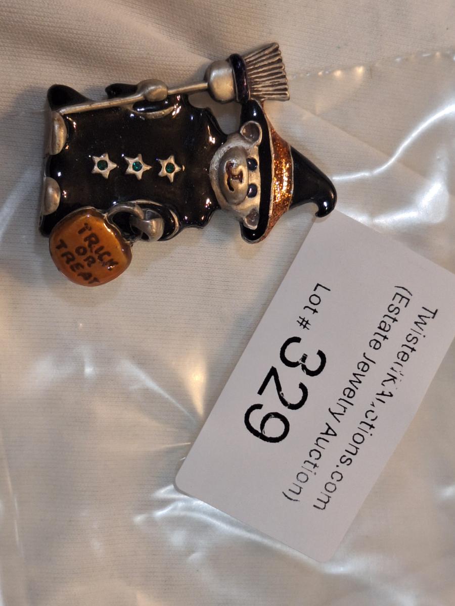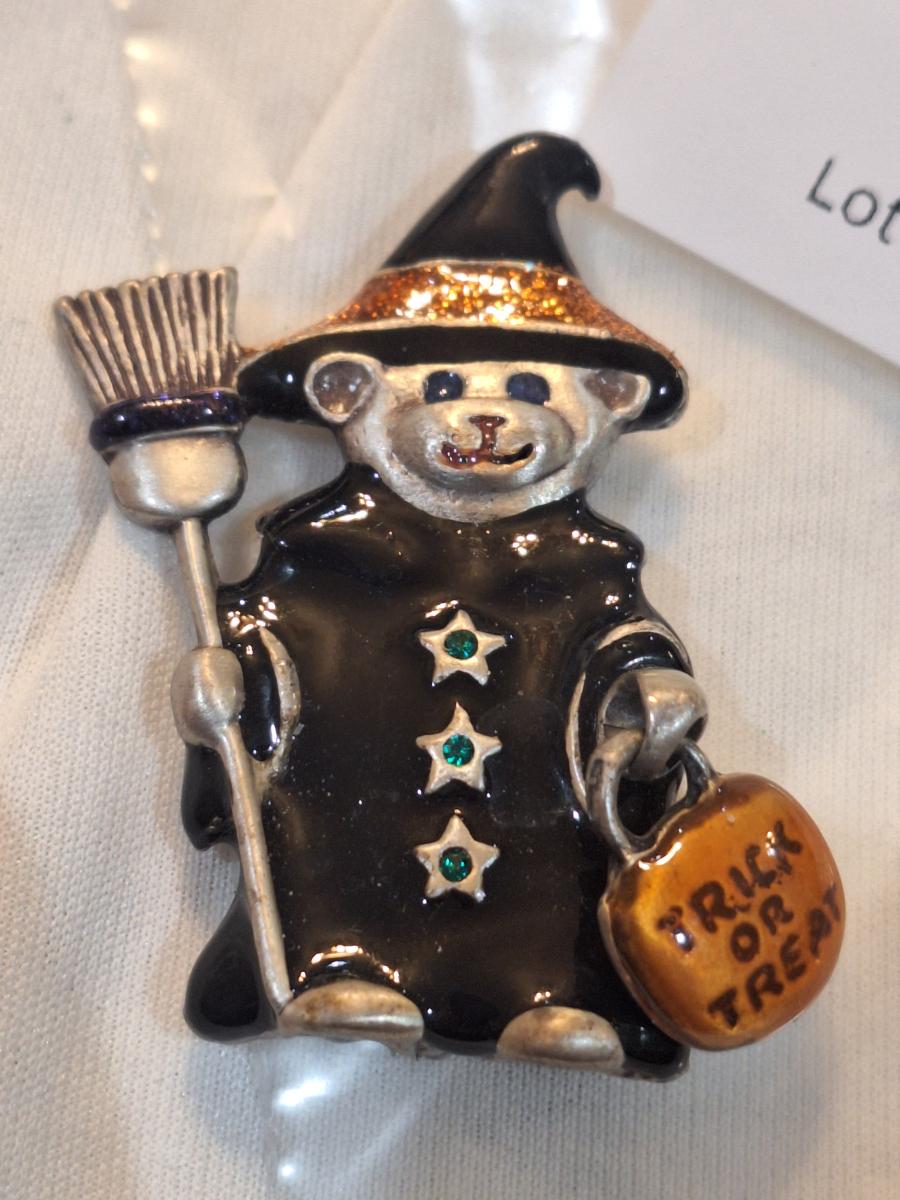 cute brooch of bear in witches outfit trick or treating for Halloween.