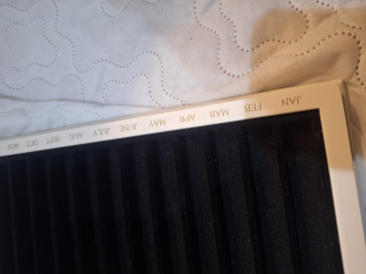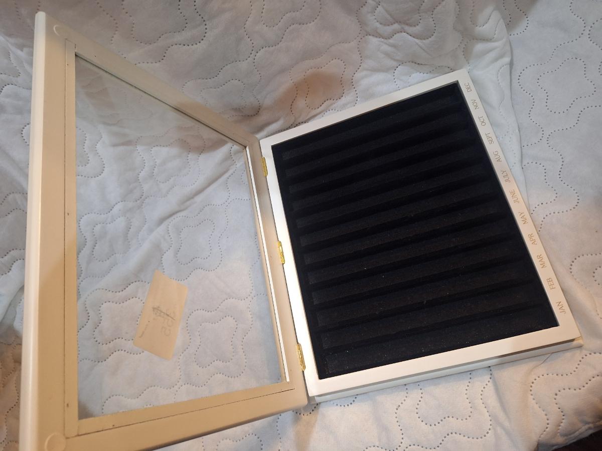 this is a display case from storyline that has rows labeled by the month for storyline jewelry.