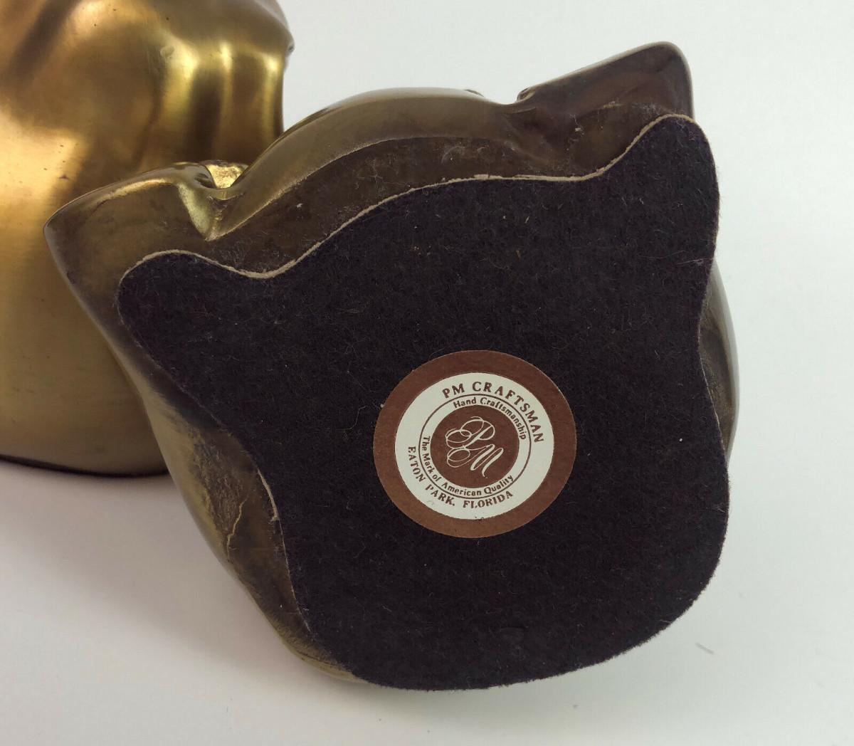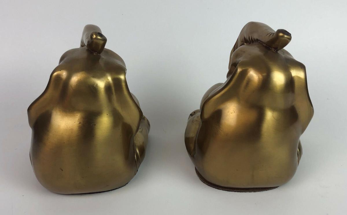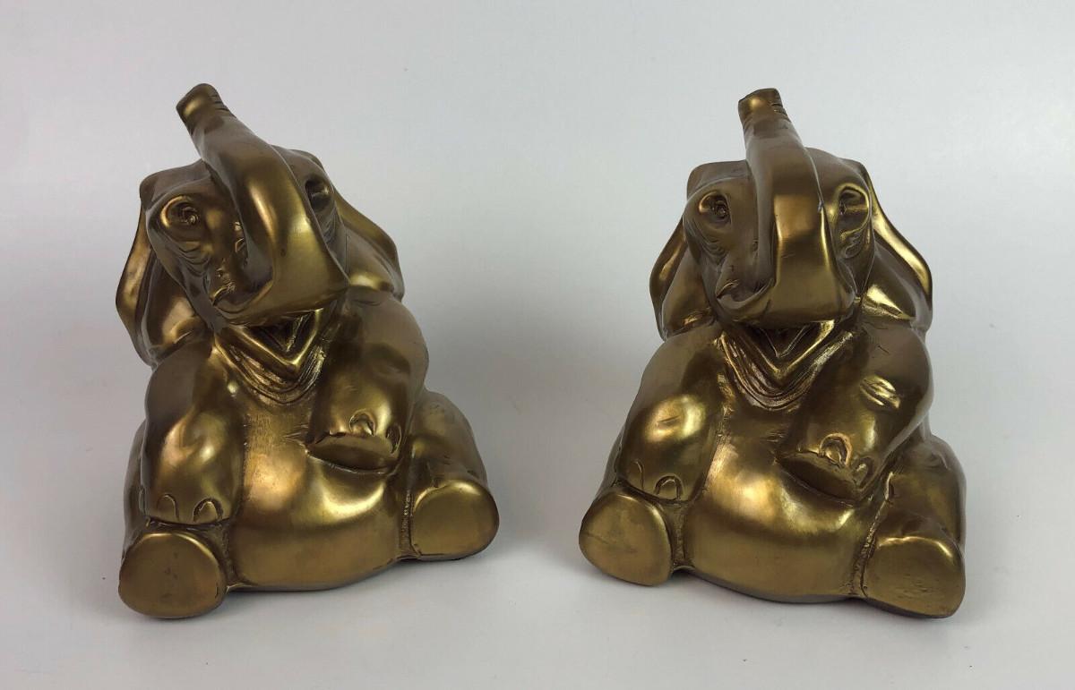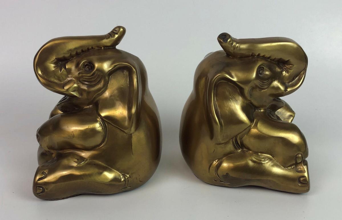 Excellent condition on this pair of Seated Elephant bookends...produced in bronze mold slush-metal castings...Handcrafted..from Philadelphia Mfg...now PM CRAFTSMAN...They are 5" high x 4" wide...Nicely weighted...No use wear to mention...Nice patina.