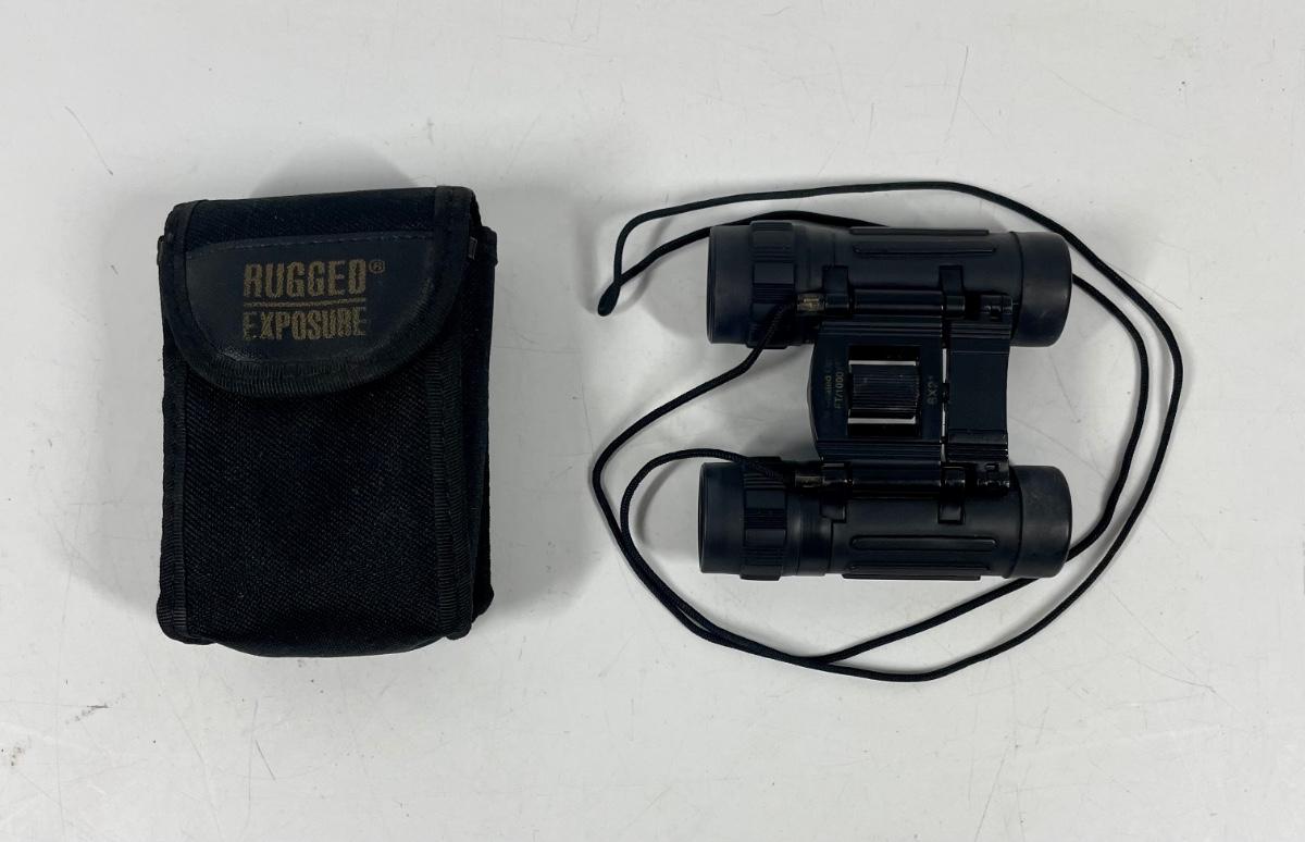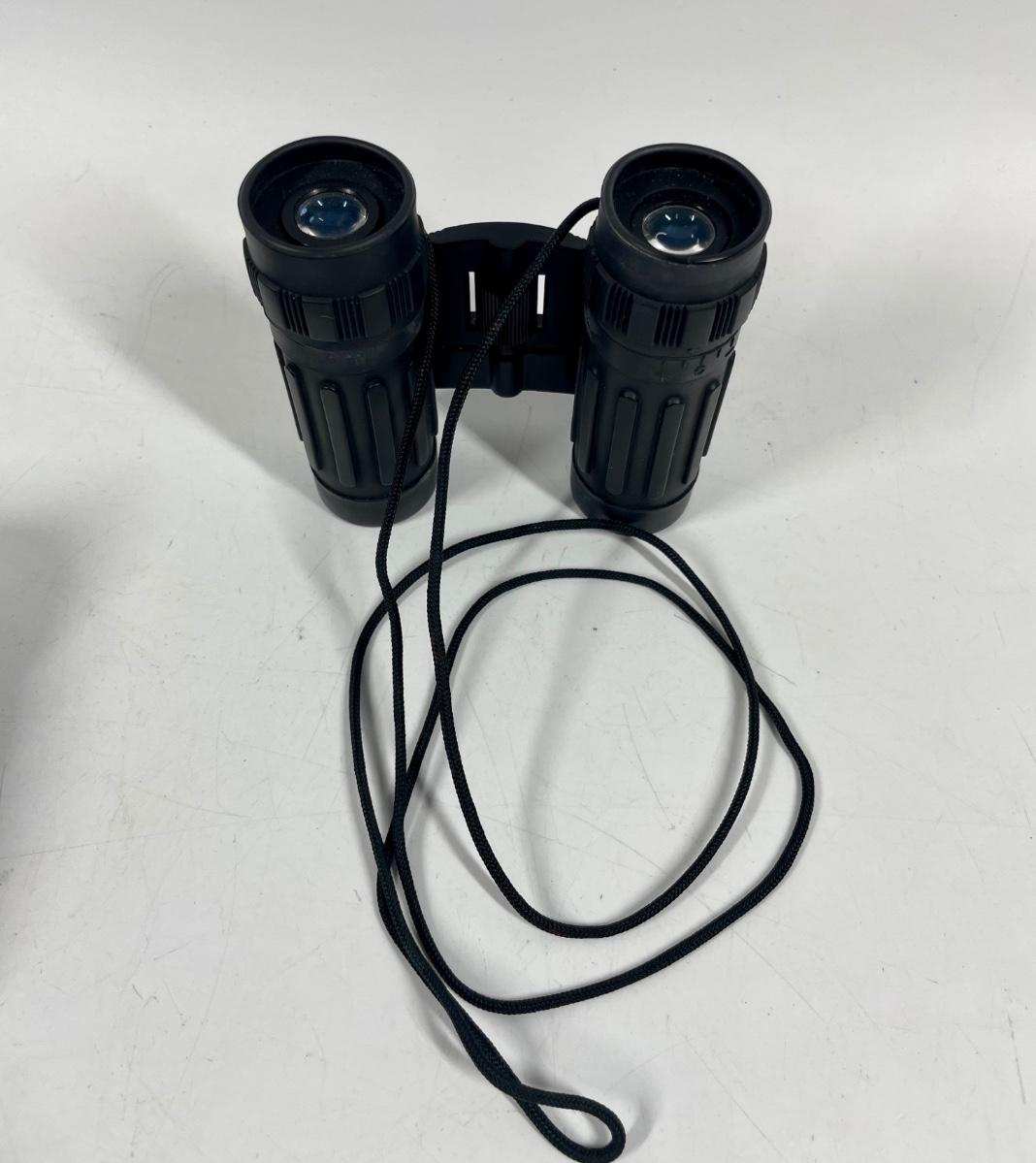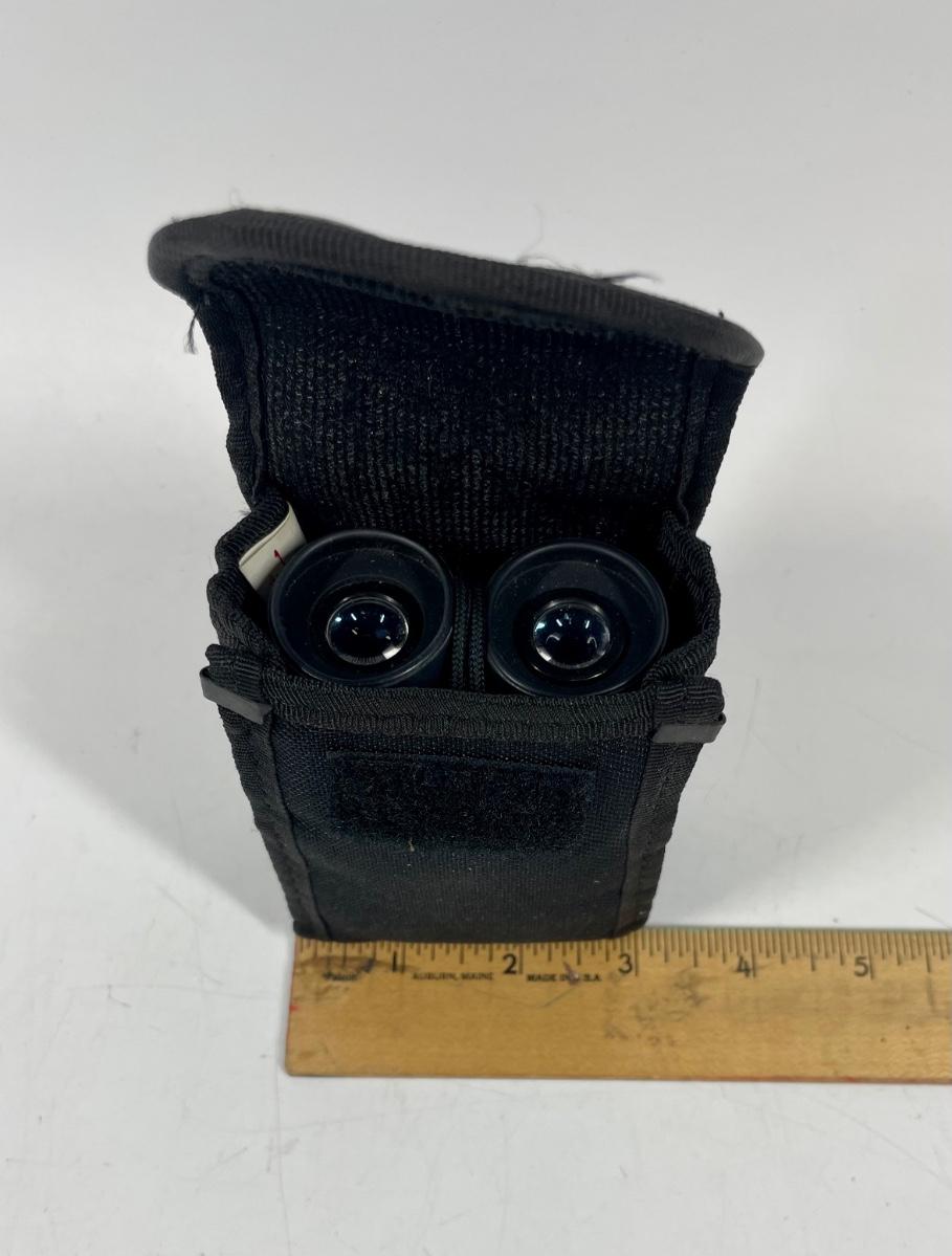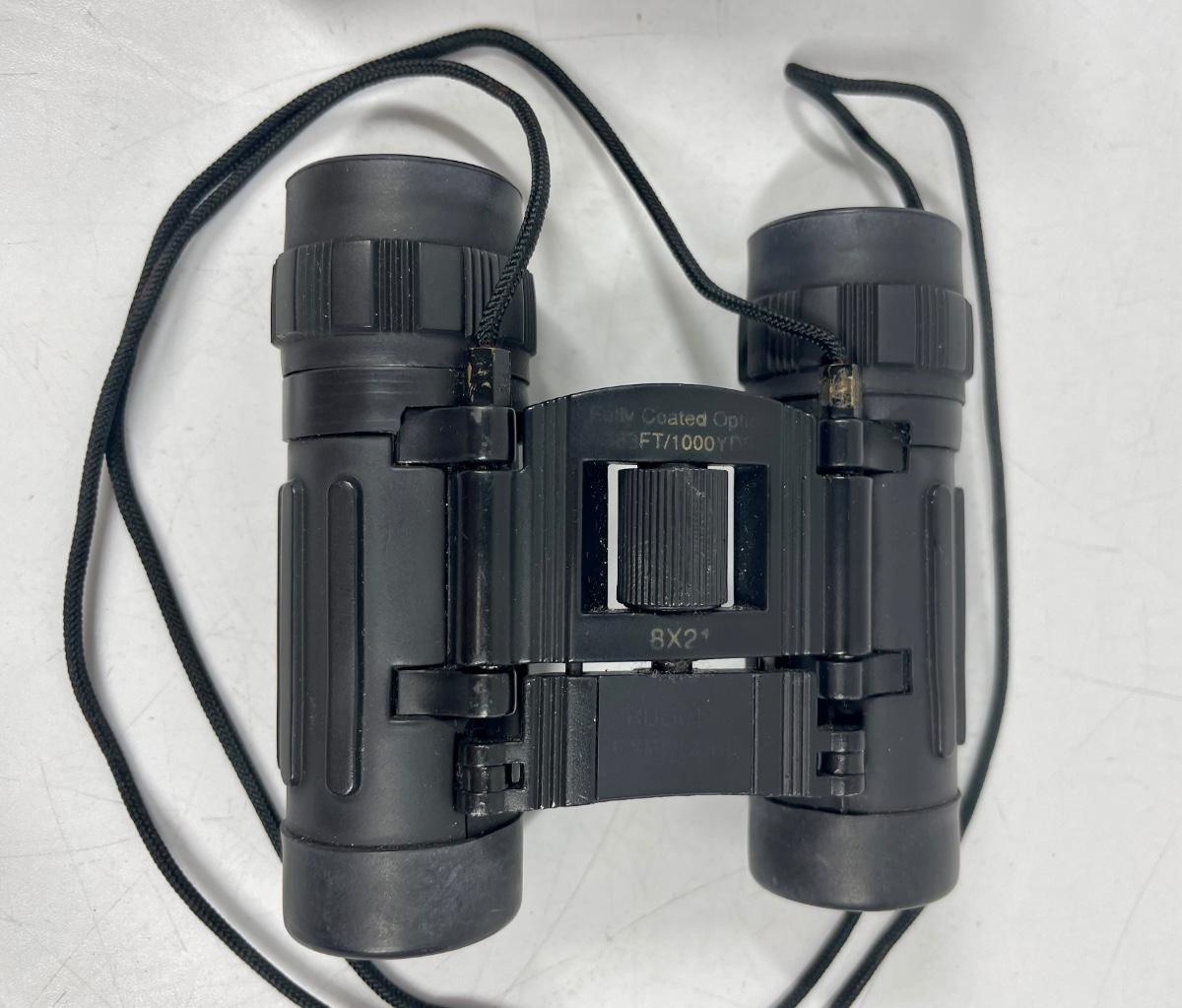 Pocket Binoculars with neck cord and case. Case can be worn attached to your belt. 8x21, fully coated optics, field of view 383 feet at 1000 yards.