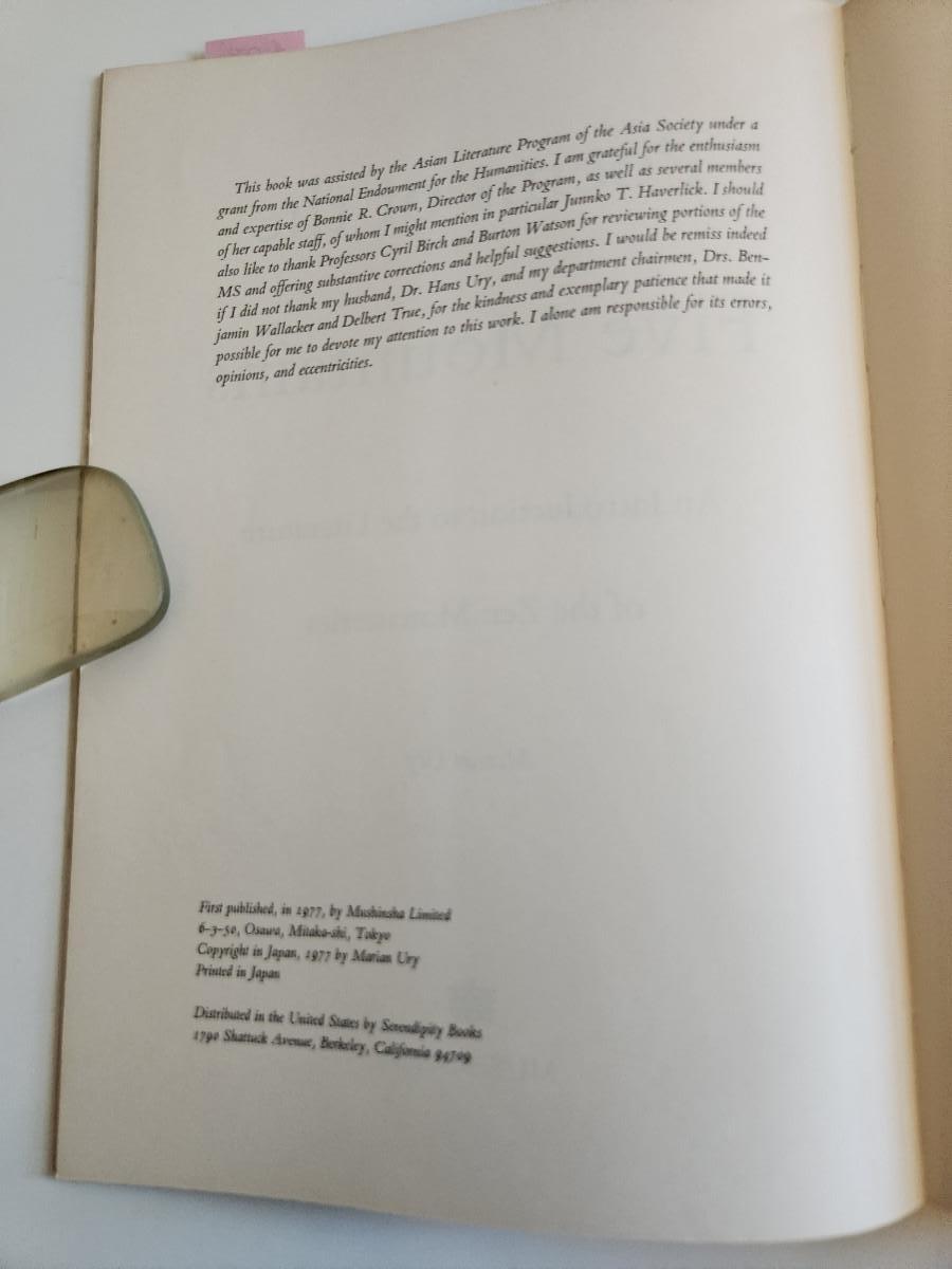 This auction lot is for a copy of the book Poems of the Five Mountains by Marian Ury. This book is soft bound and is in OK condition, as it has been read well and studied. The cover has some taping and nicks please see photos. The book is an Introduction to the Literature of the Zen Monasteries. Published in 1977 by a Japanese Publisher. 138 pages with many fold-out insert examples.