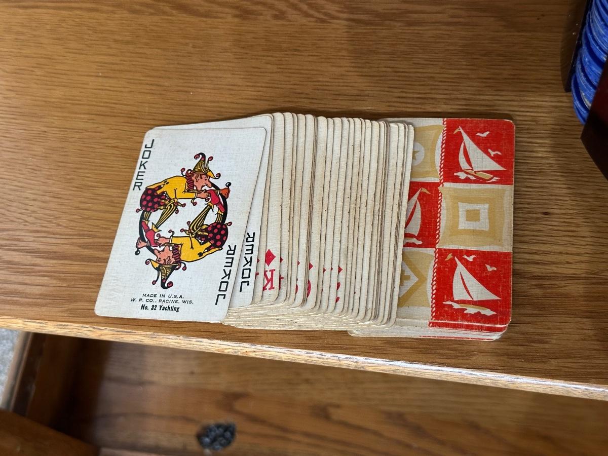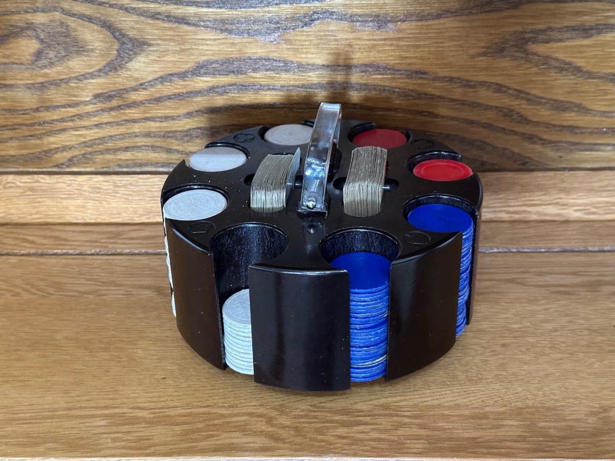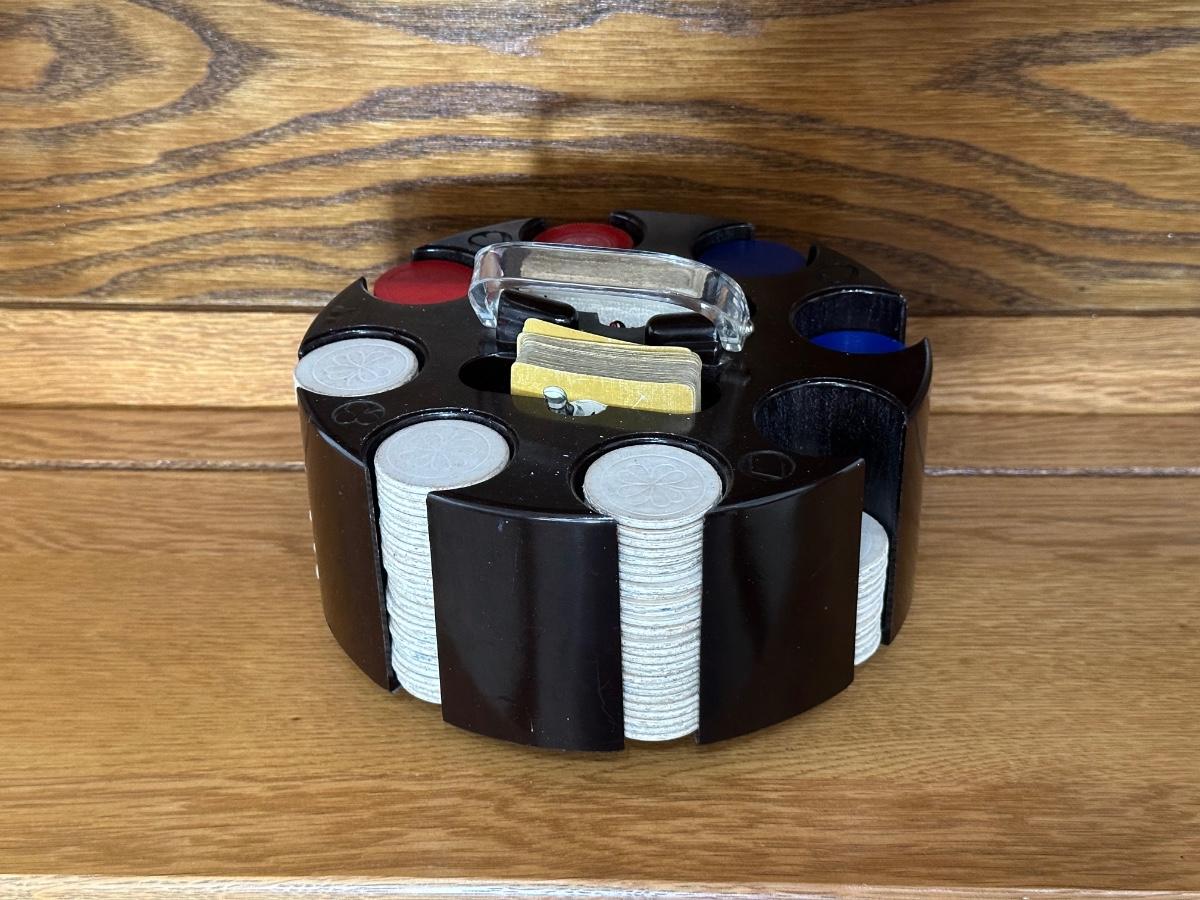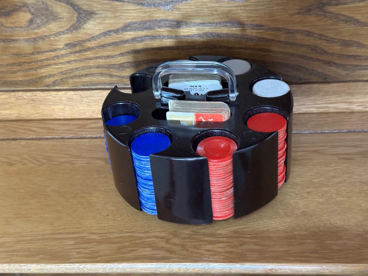 POKER CHIPS & CARDS IN A REVOLVING HOLDER