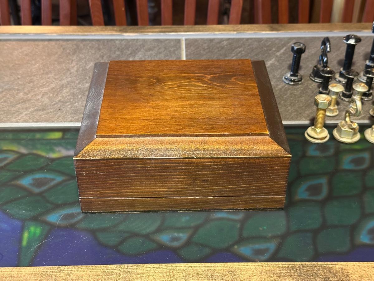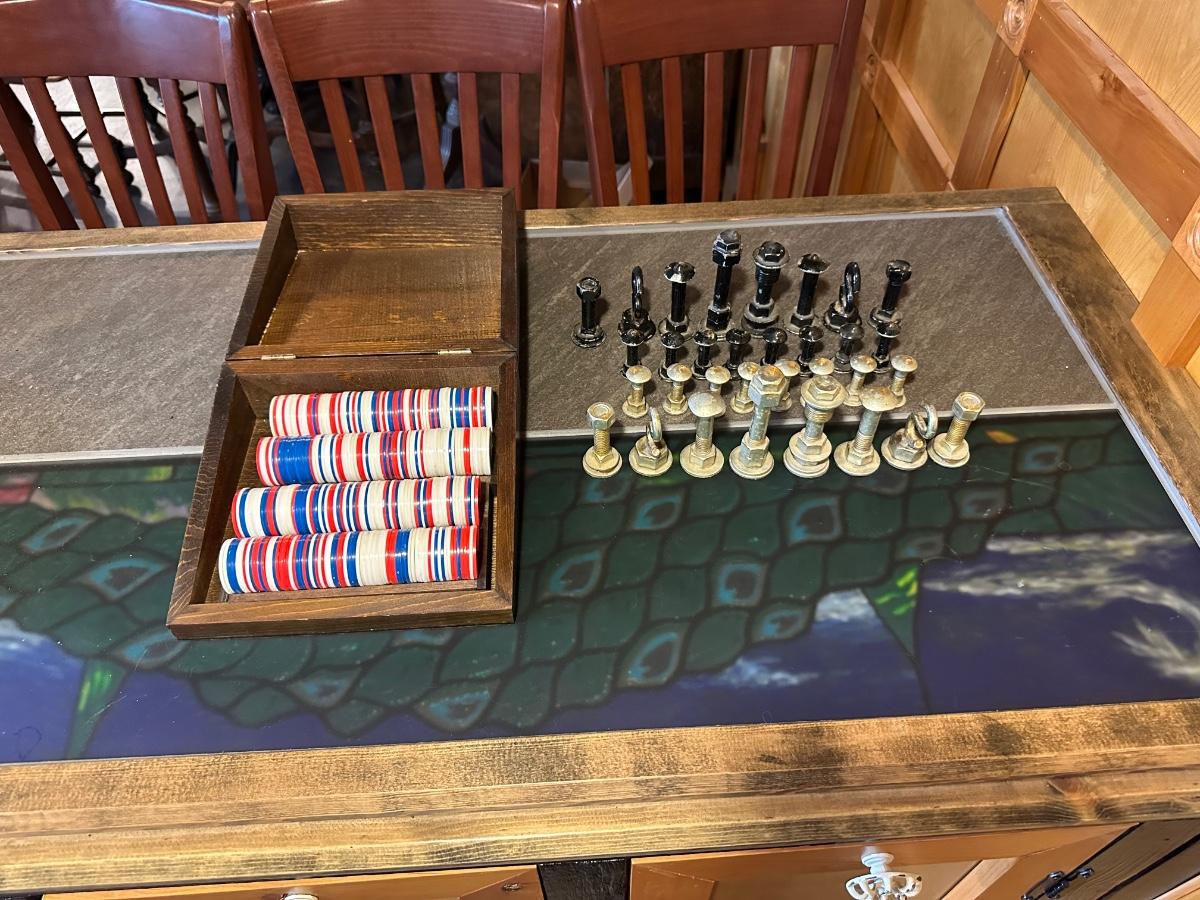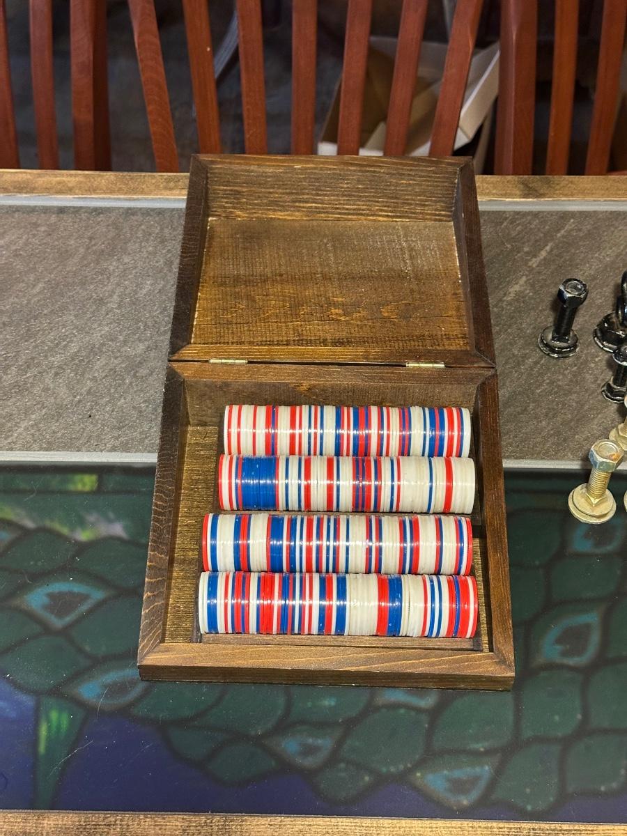 POKER CHIPS IN A WOODEN BOX AND UNIQUE CHESS PIECES