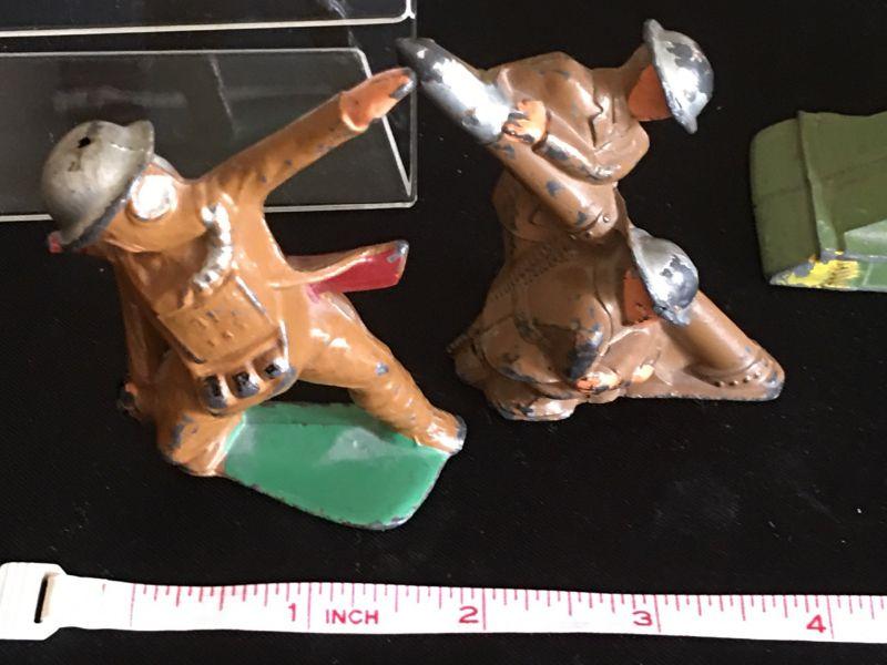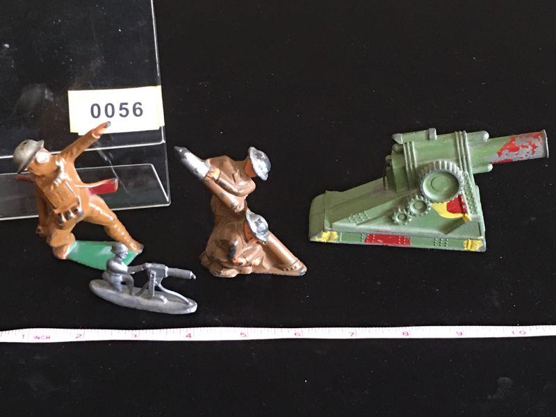 Collection of metal WWII toy soldiers, a little soldier and a canon as shown. See pics for ID