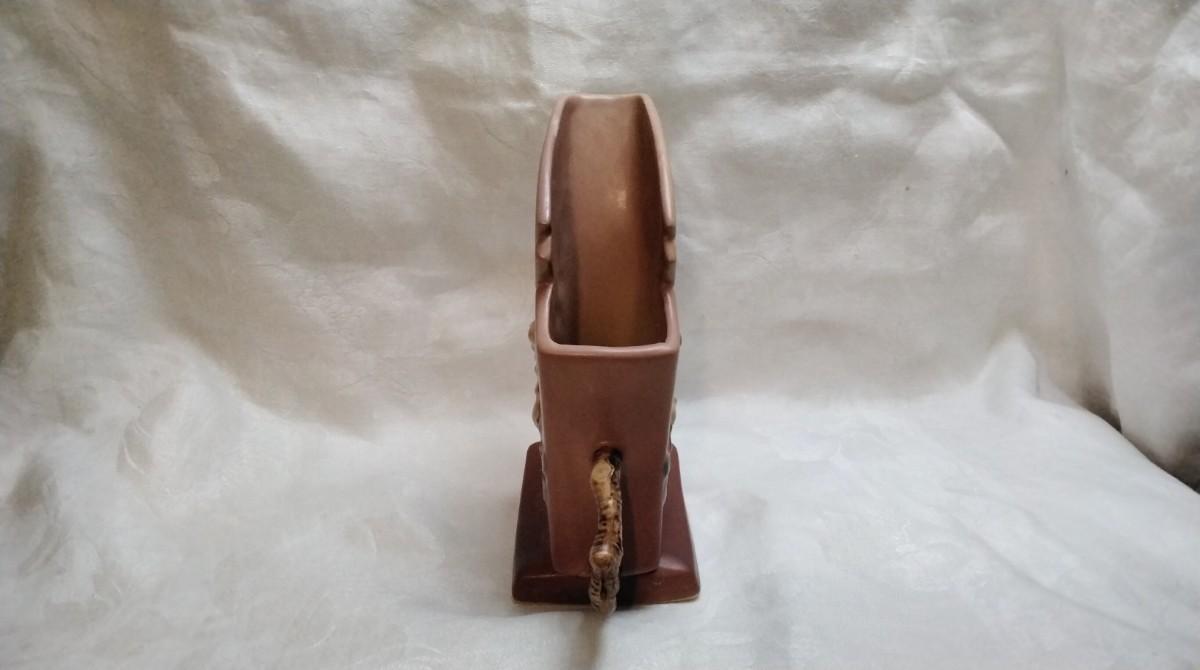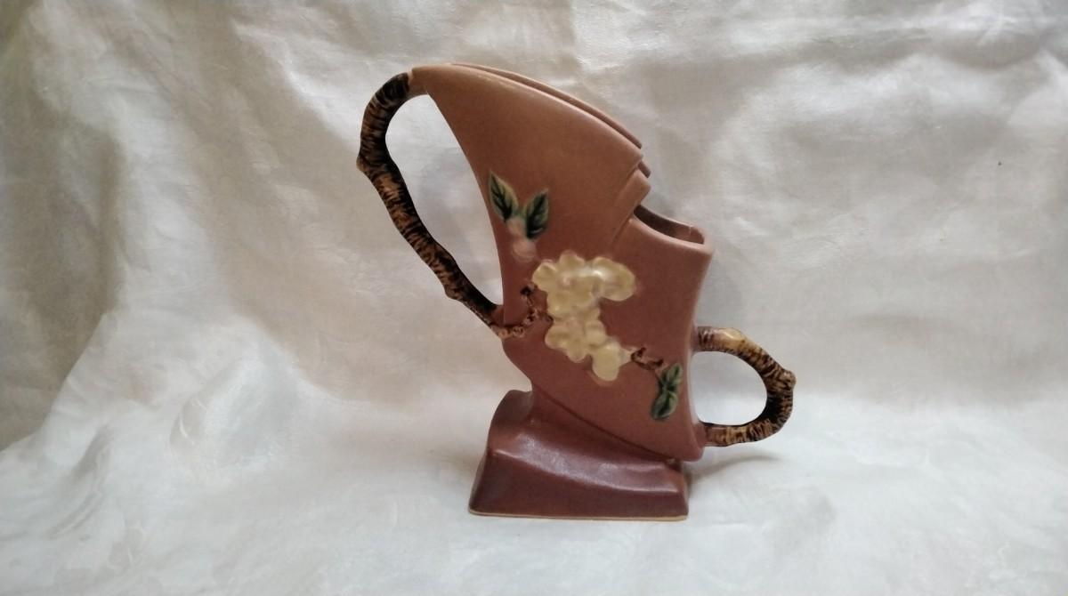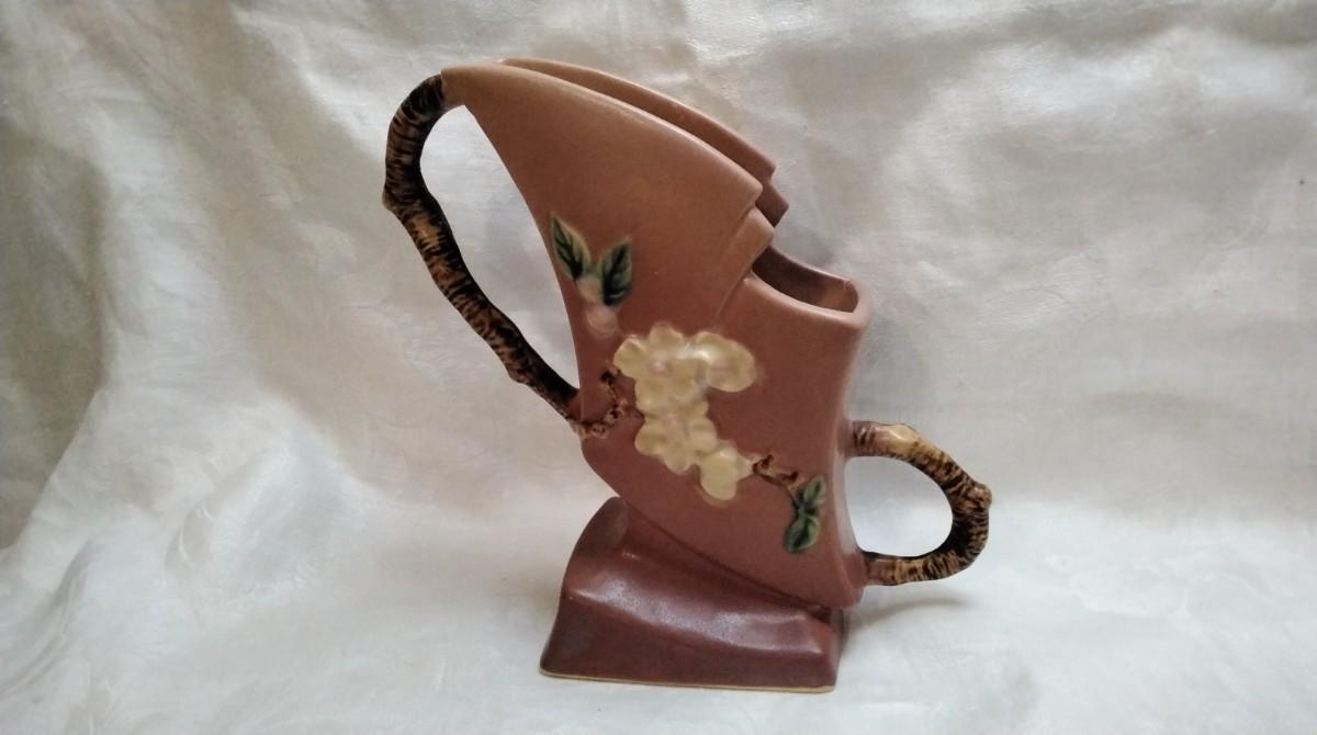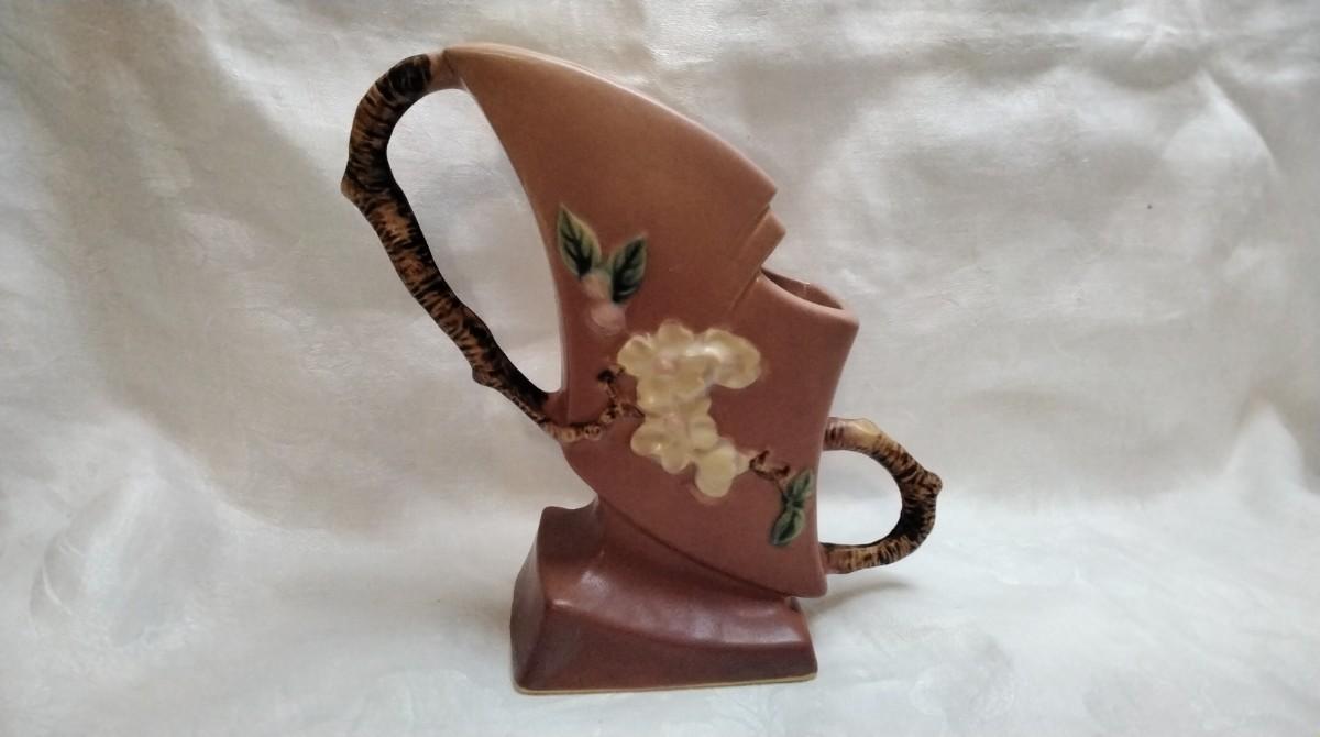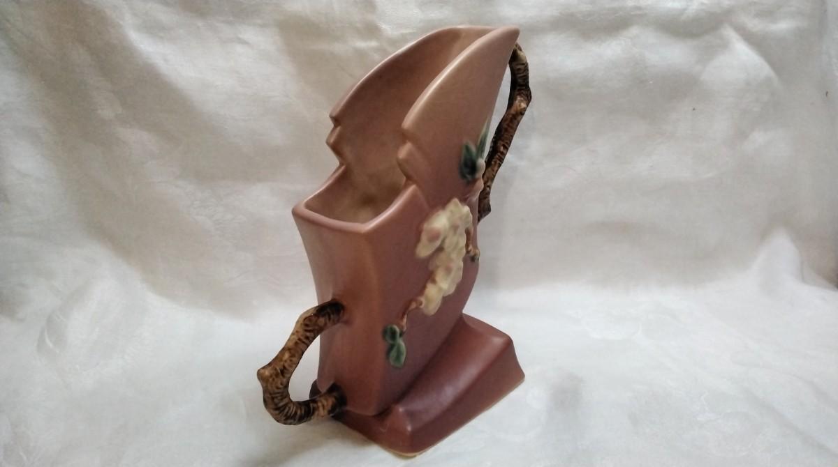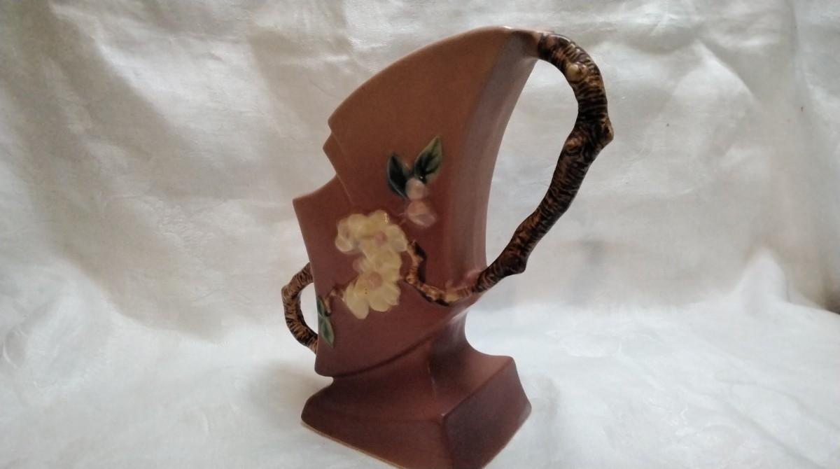 Roseville Pottery Apple Blossom pink handled vase. Good form and color. EXCELLENT ORIGINAL CONDITION. No chips, cracks, damage or repair of any kind. Bottom marked with Roseville, USA and 373-7. Vase is 7 1/2" tall and 7 1/2" wide from handle to handle.