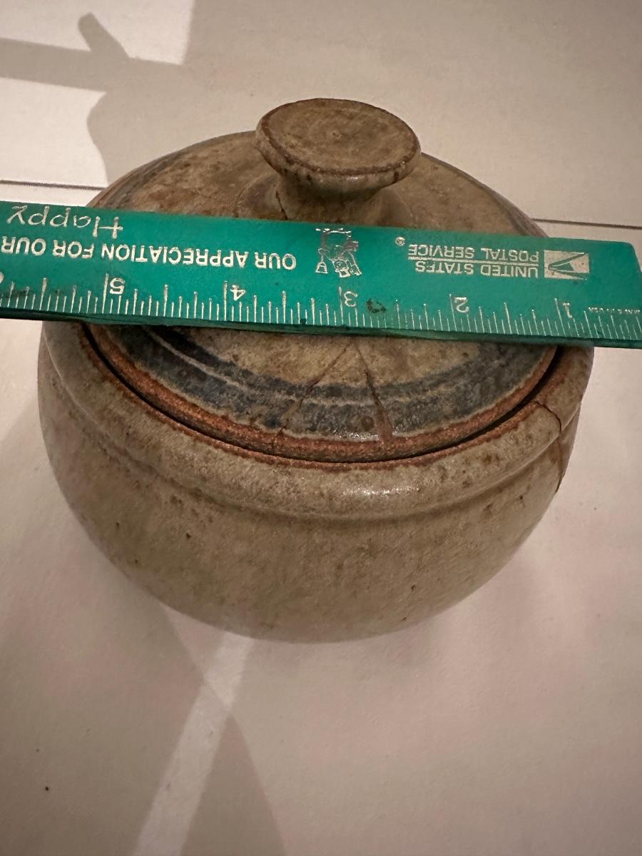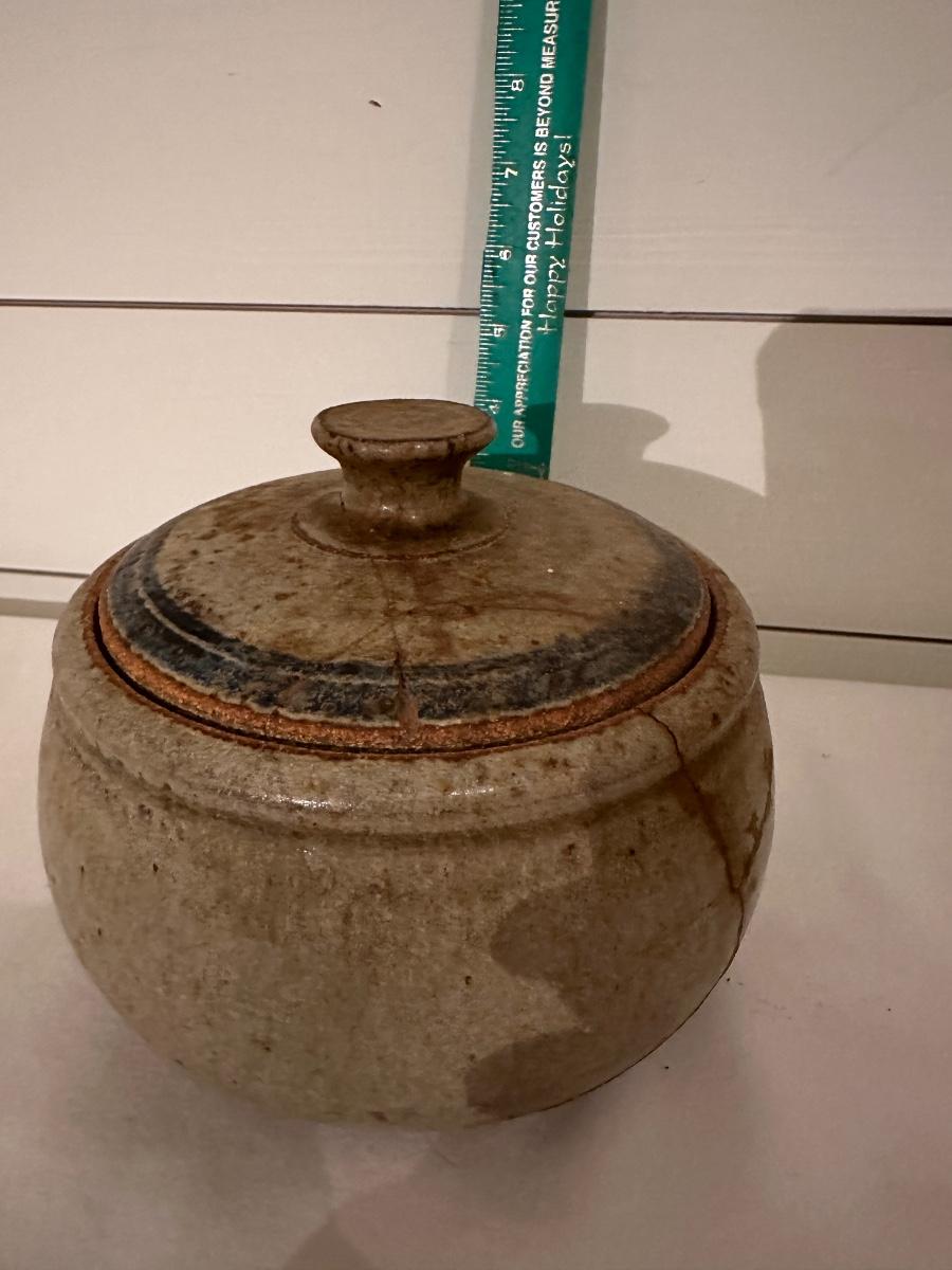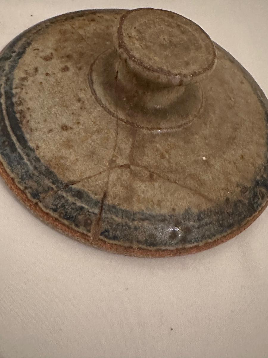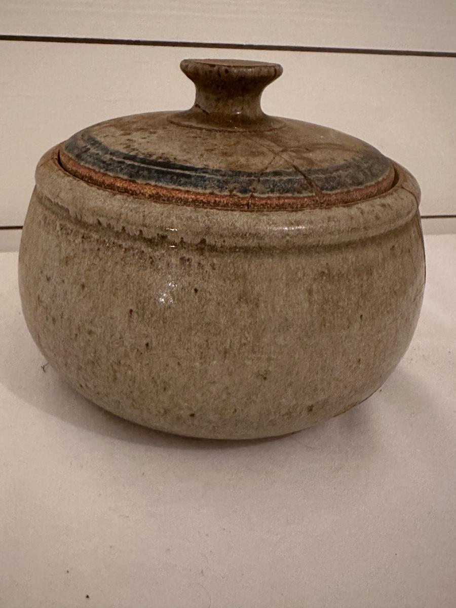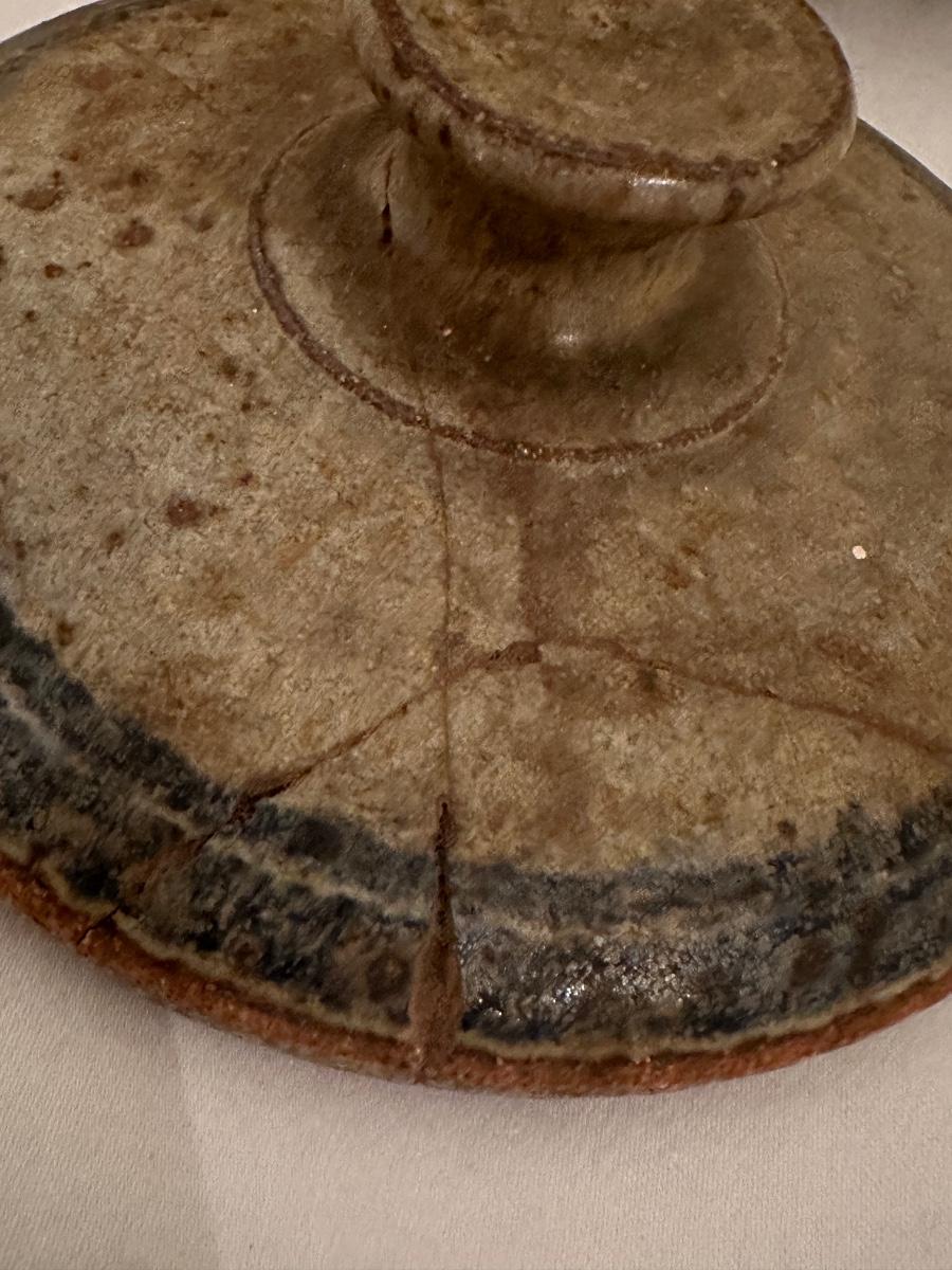 BEAUTIFUL POTTERY VESSEL WITH LID HAS BEEN REPAIRED (SEE PHOTOS)
