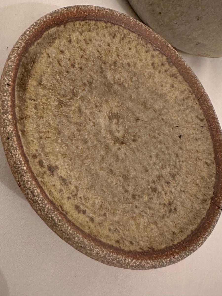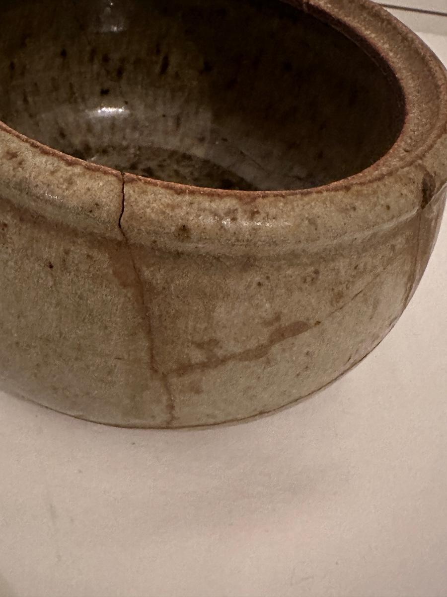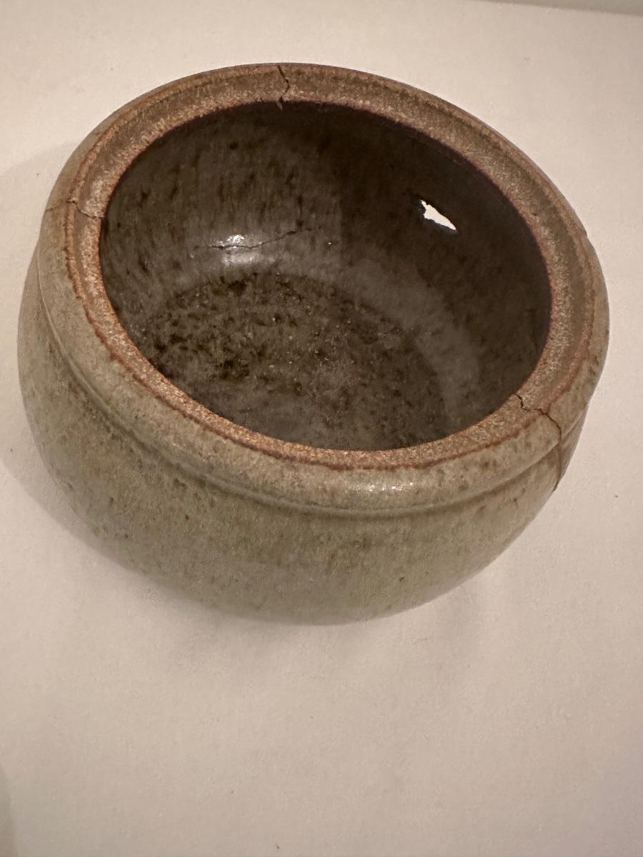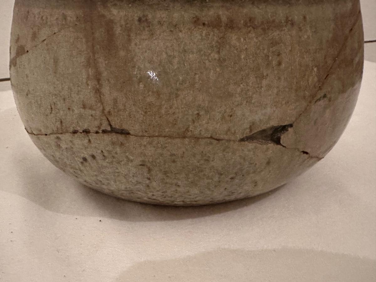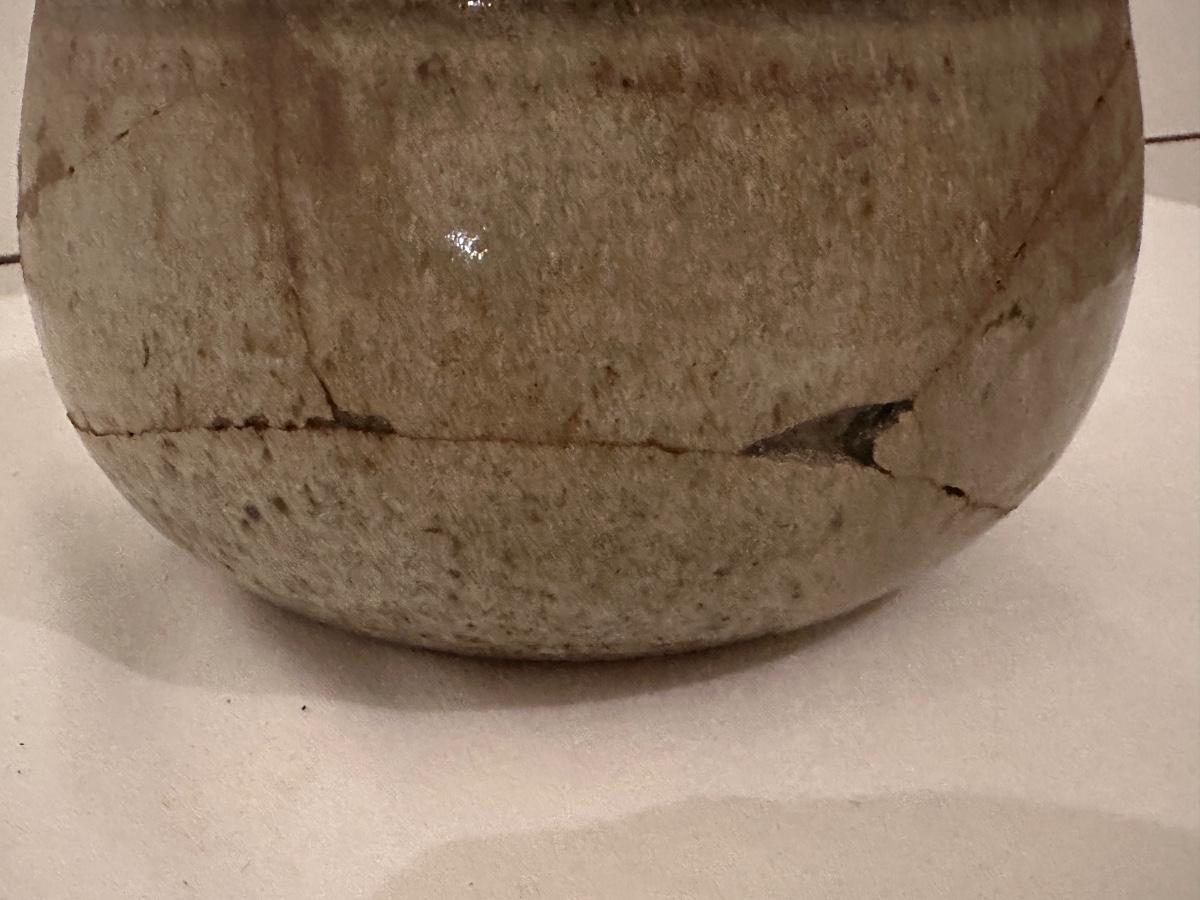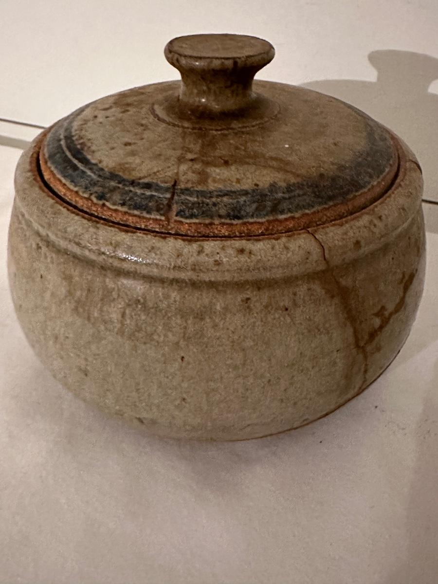 BEAUTIFUL POTTERY VESSEL WITH LID HAS BEEN REPAIRED (SEE PHOTOS)