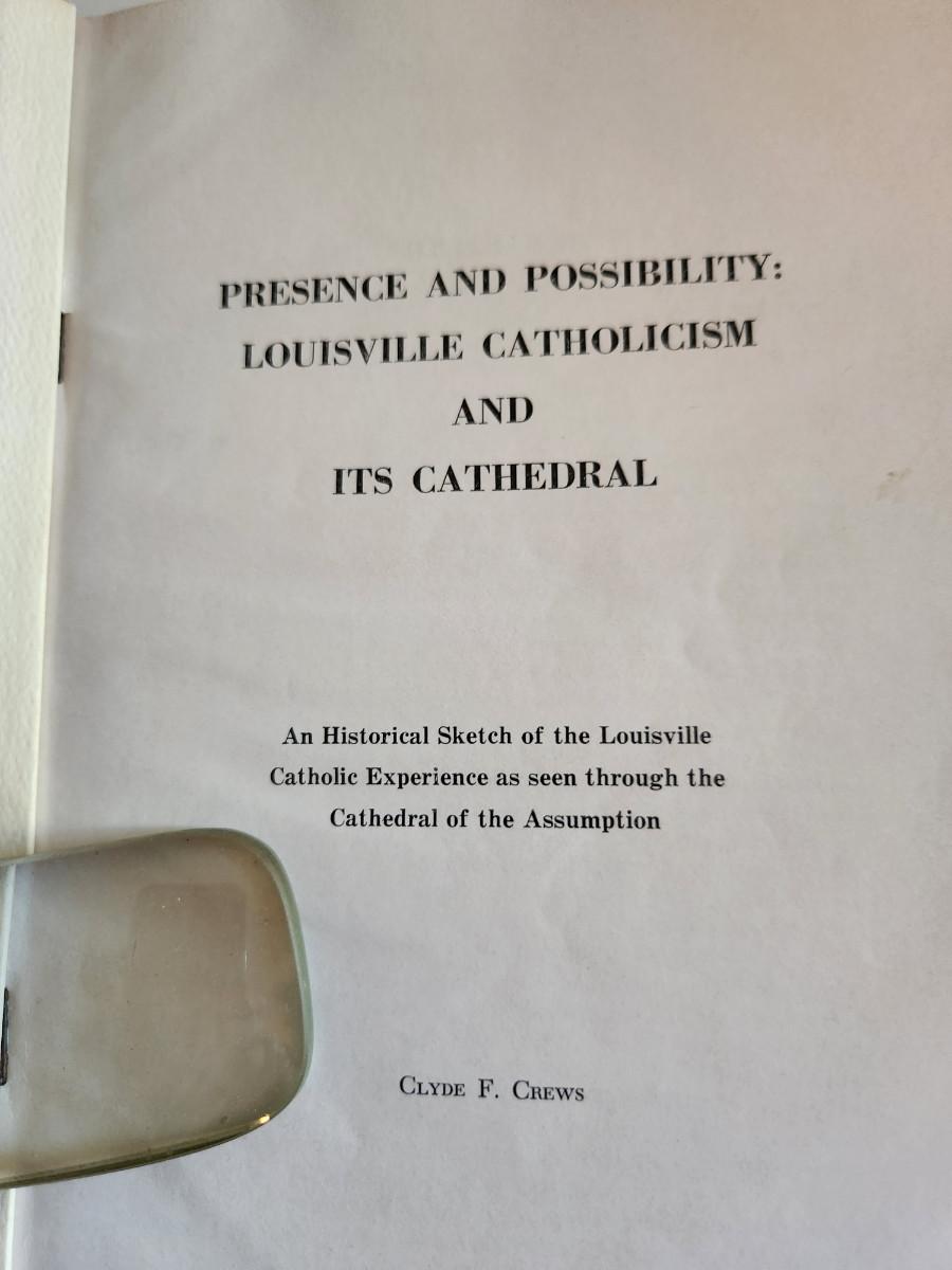 This auction lot is for a paper bound copy of the book Presence And Possibility: Louisville Catholicism and Its Cathedral by Clyde Crews - Autographed by the author. This copy is very shelf worn and has been read a few times. The book was published in 1973 and contains 96 pages of history regarding the Cathedral of the Assumption in Louisville and the Archdiocese of Louisville's founding.