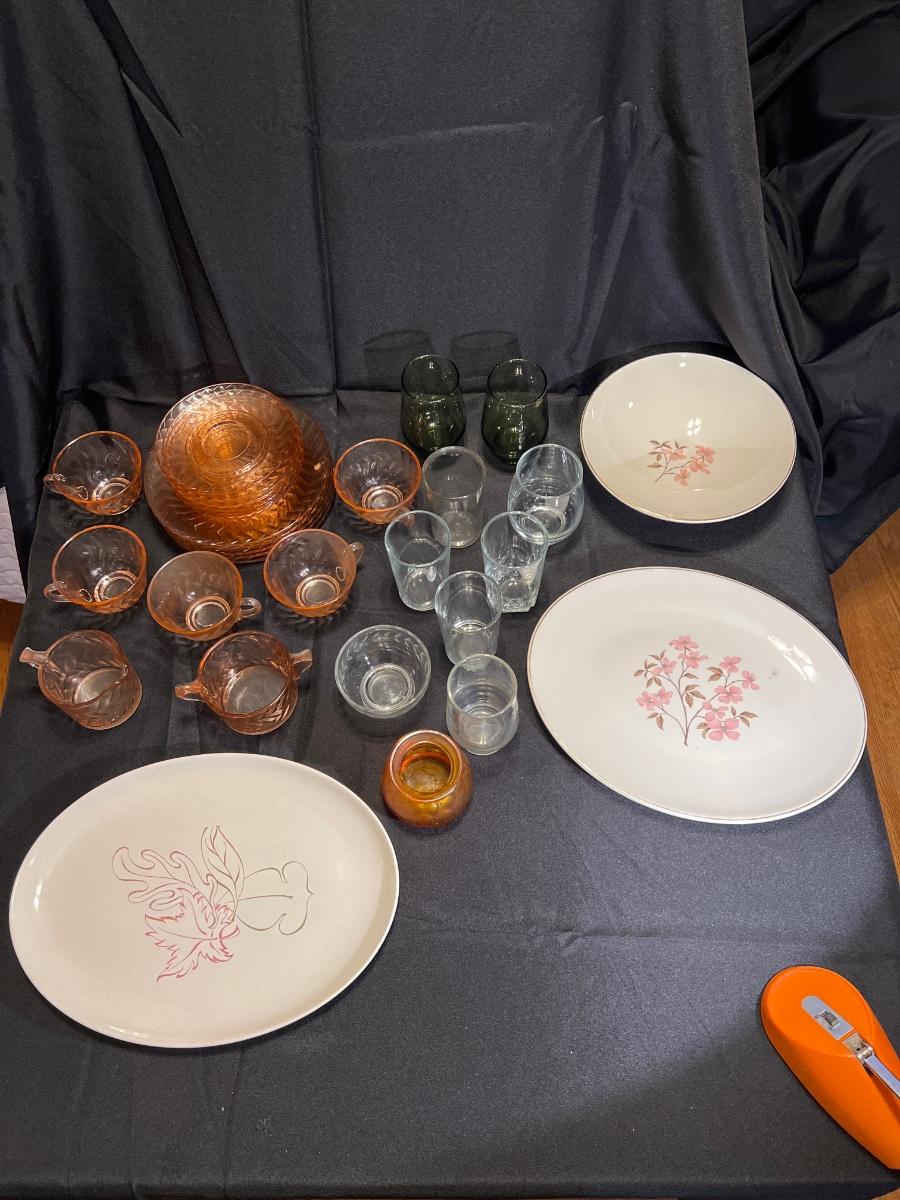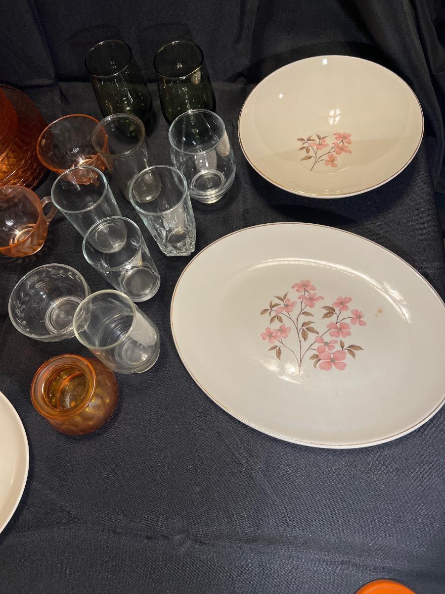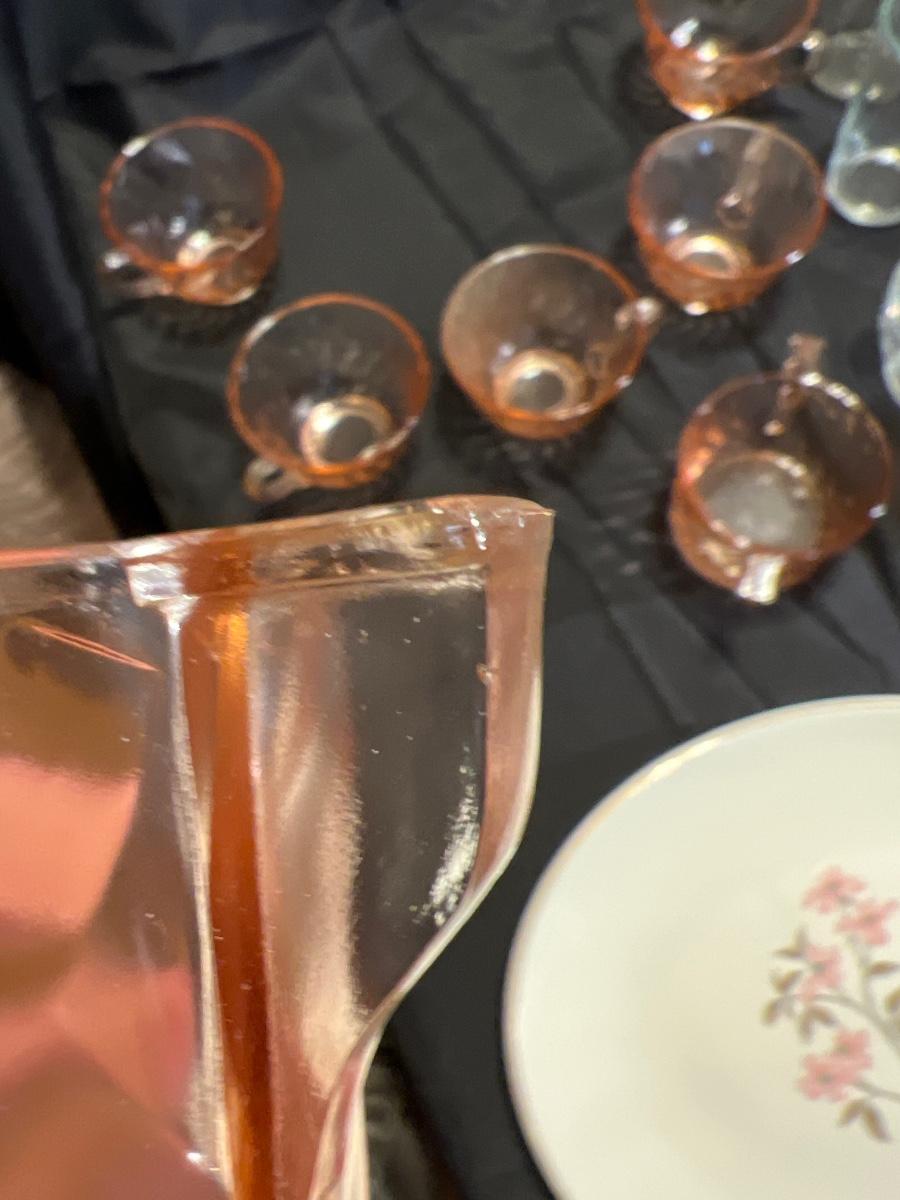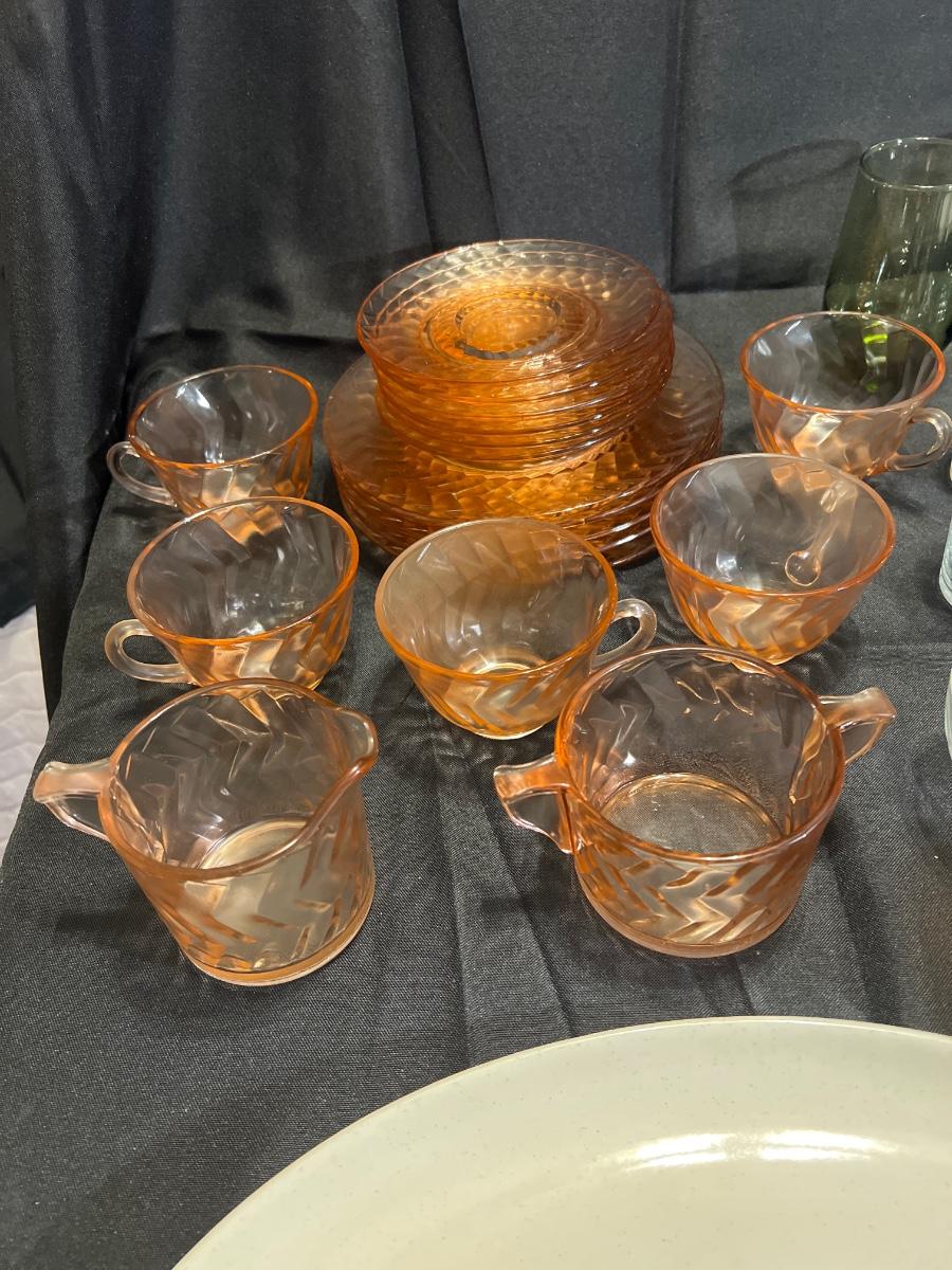 5 of the 8” pink plates, 6 of the 6” plates, 5 of the tea cups and a sugar and creamer. Small chip on creamer handle (see pic)