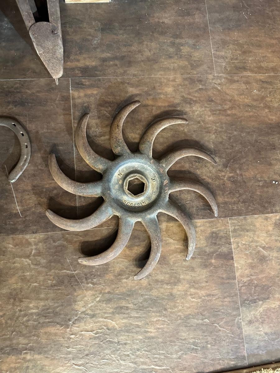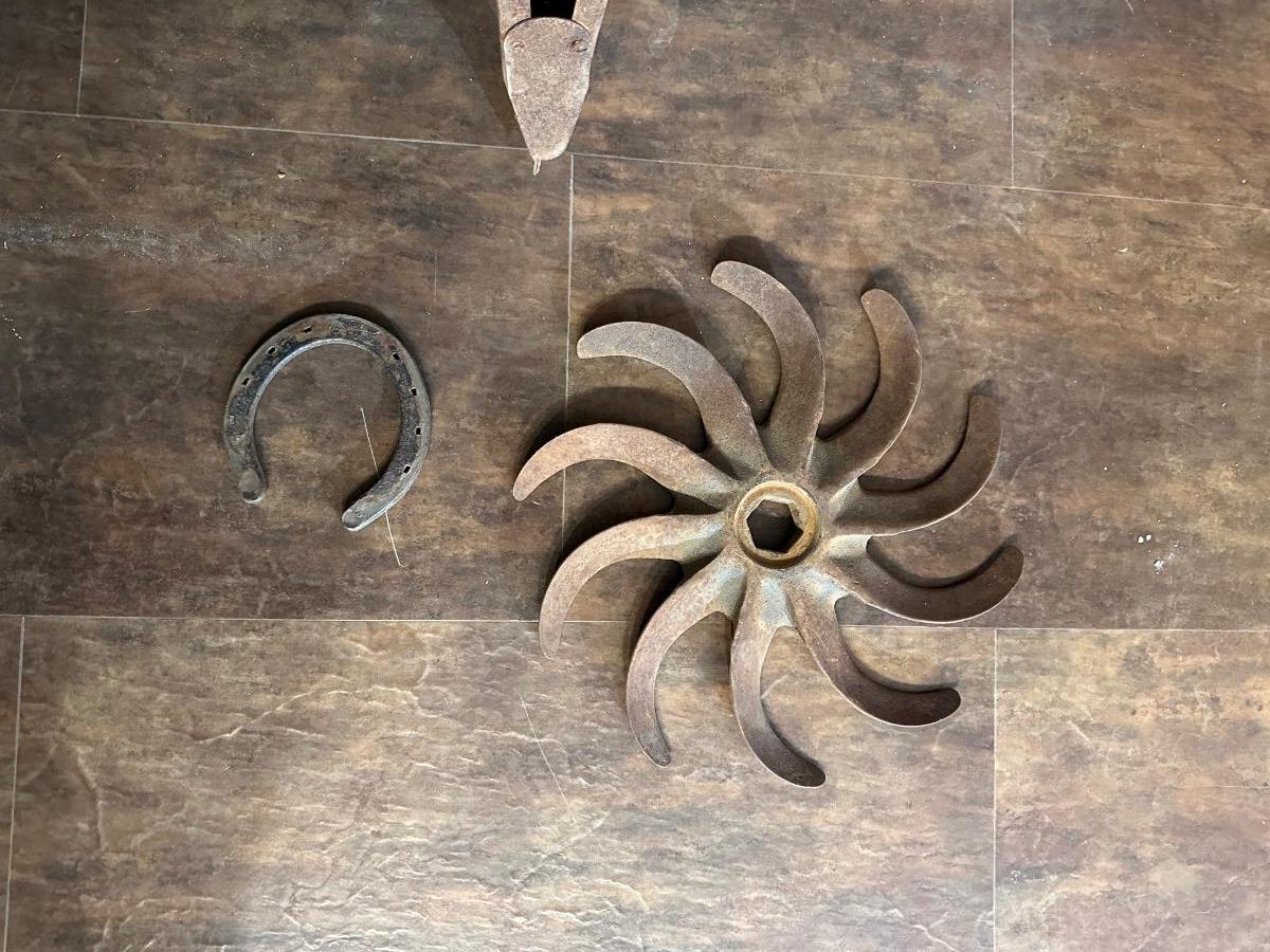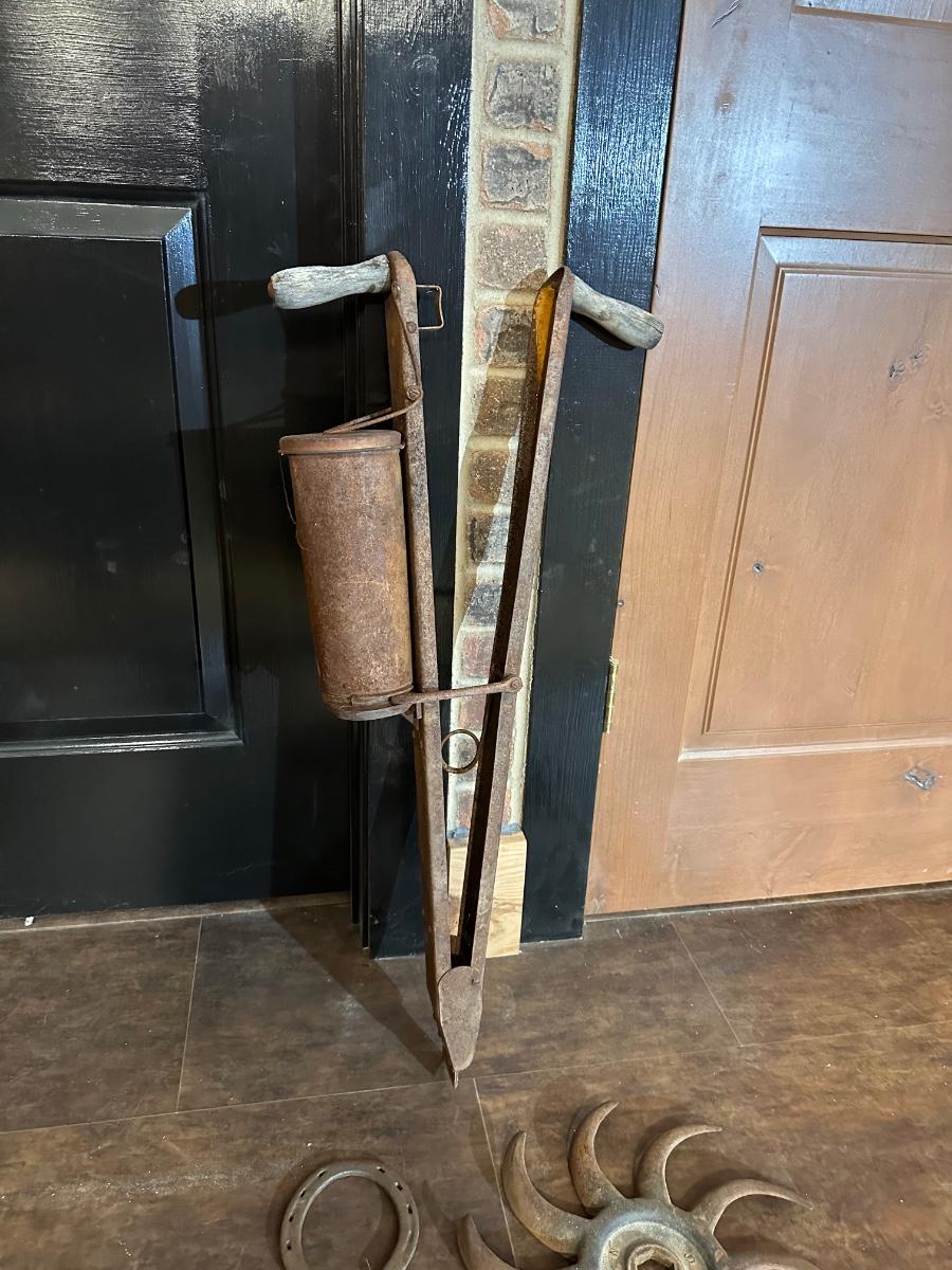 PRIMITIVE SEED PLANTER, STEEL GEAR AND A HORSE SHOE