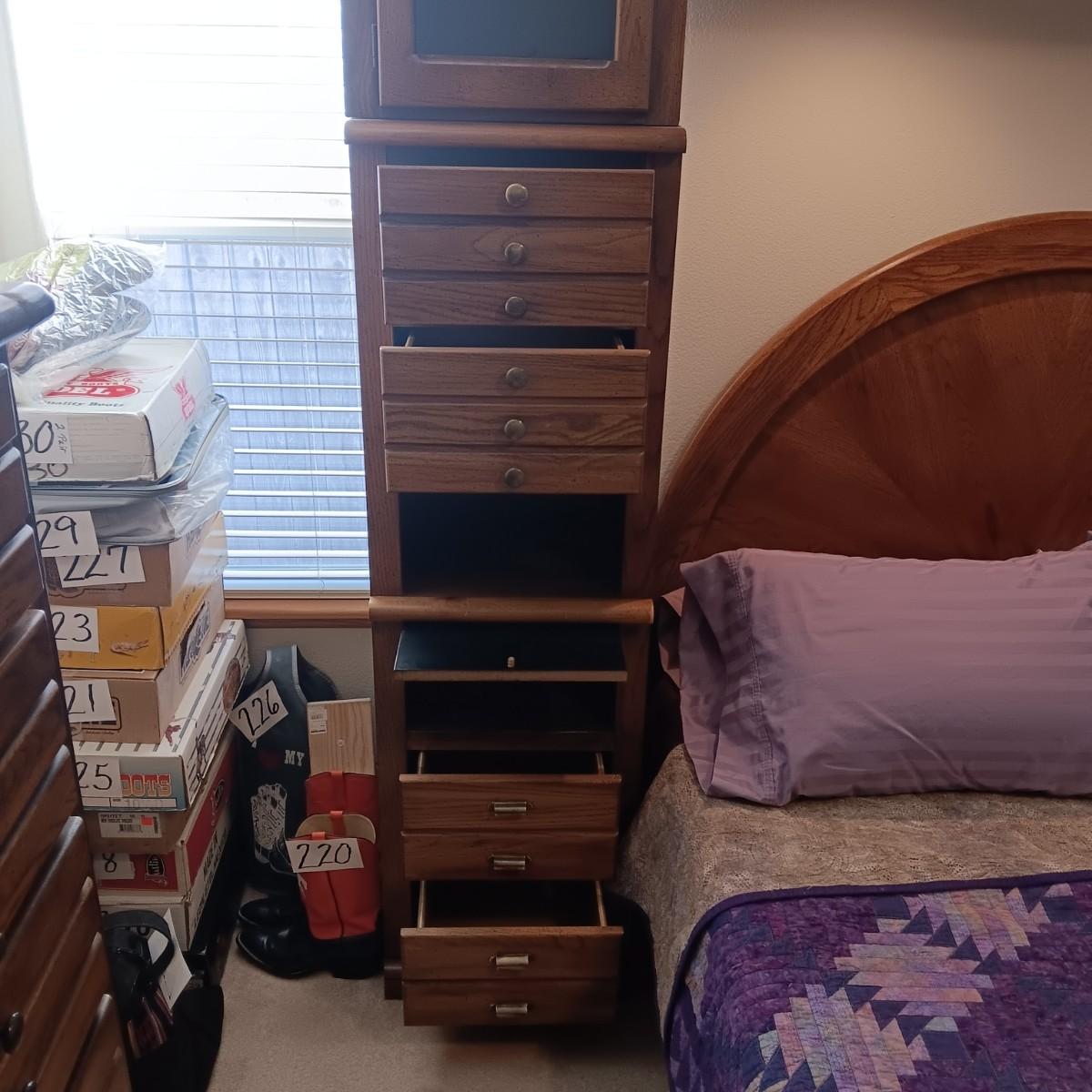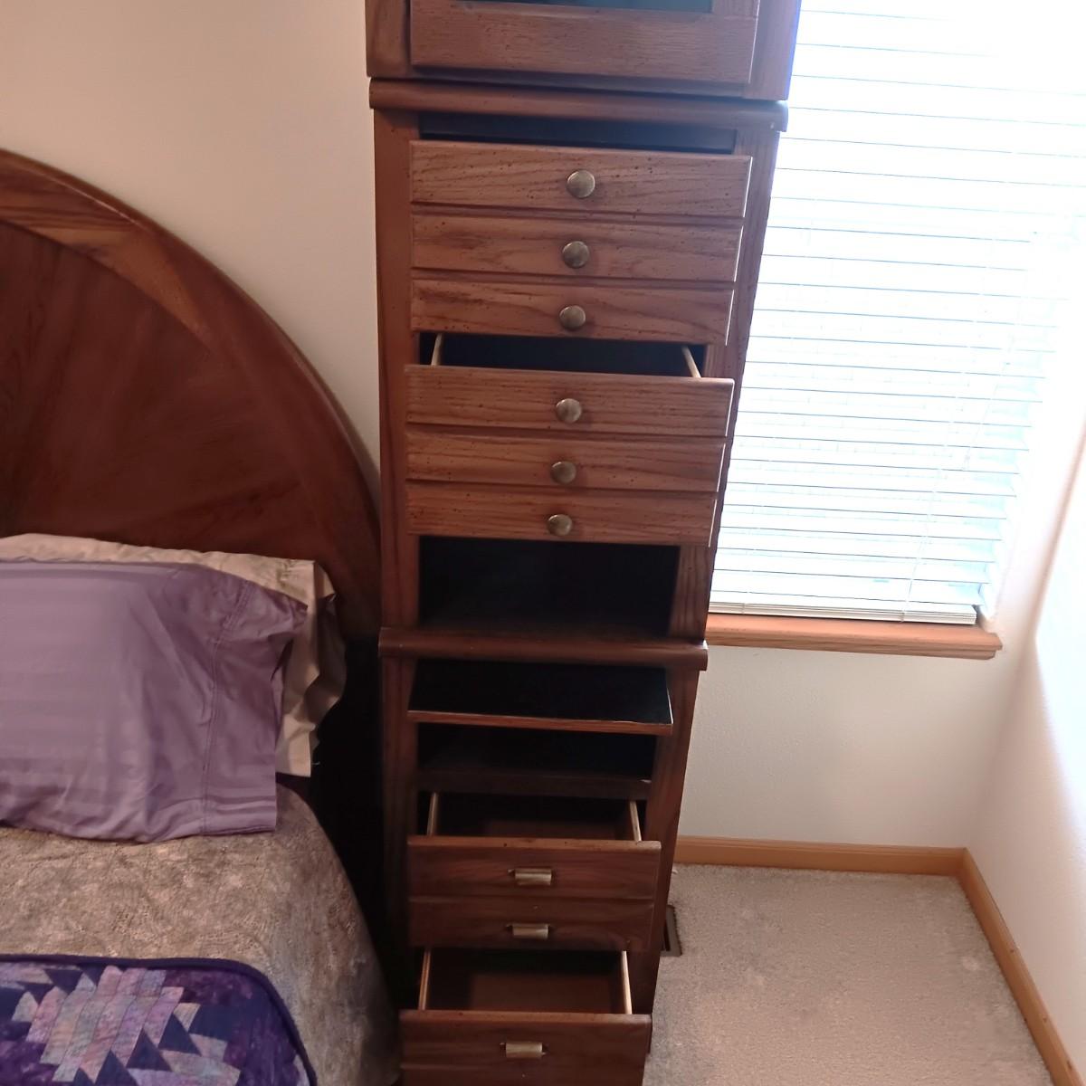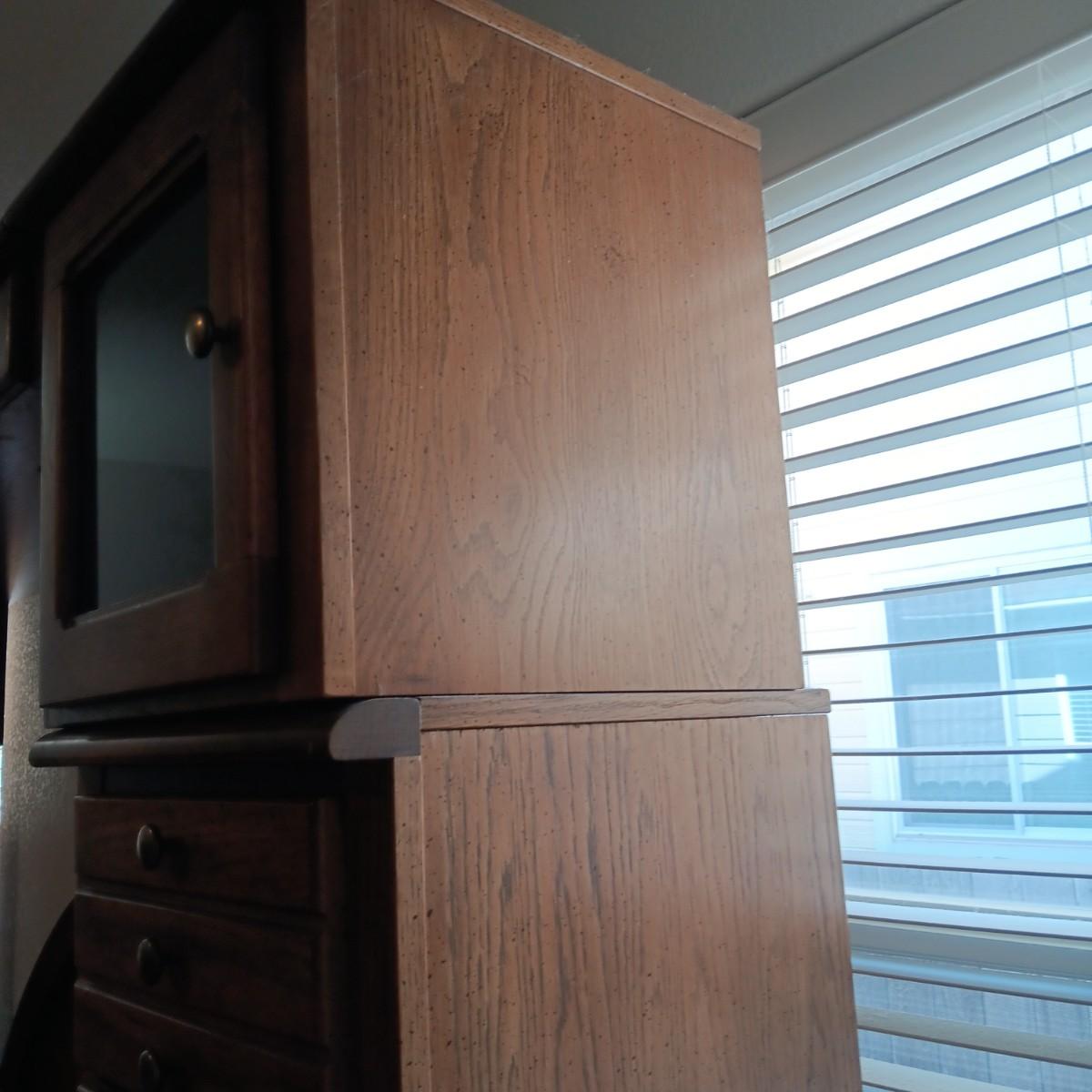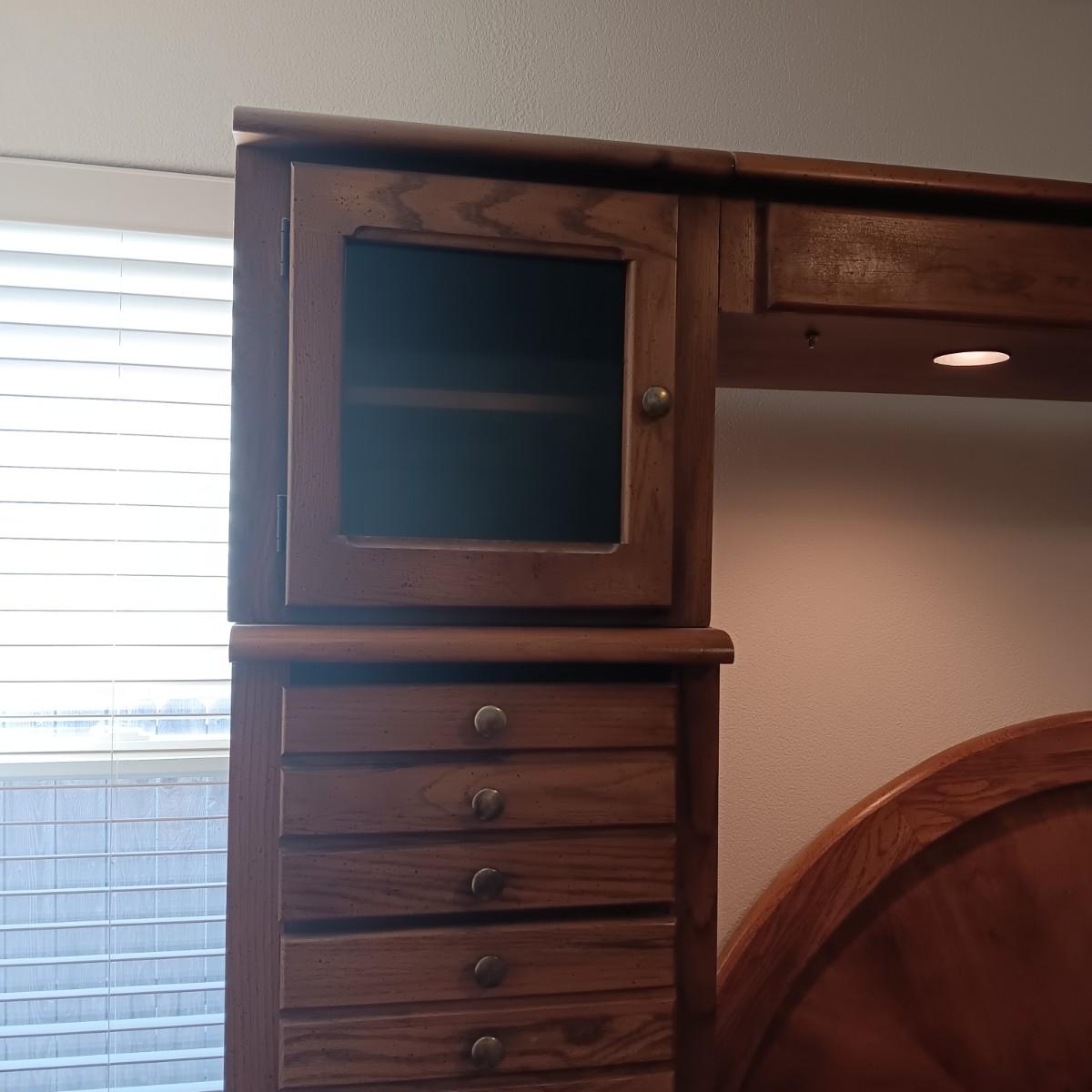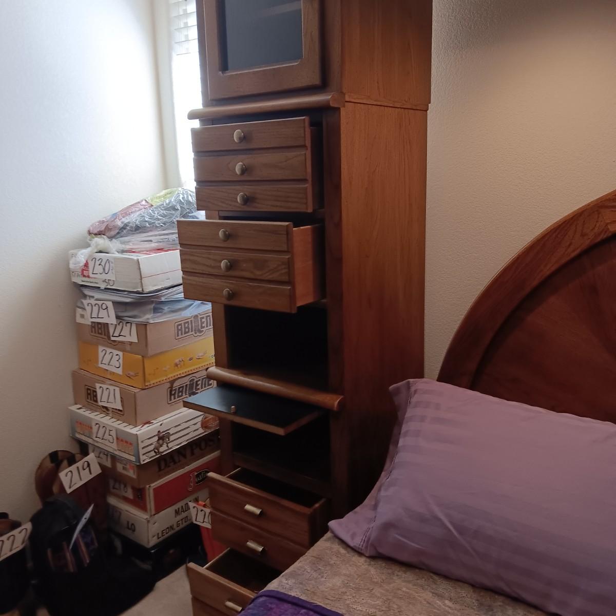 EACH SIDE UNIT IS IN 2 PIECES AND EACH HAS 4 DRAWERS, CABINET W/SHELF, PULL OUT SHELF AND 2 CUBBIES