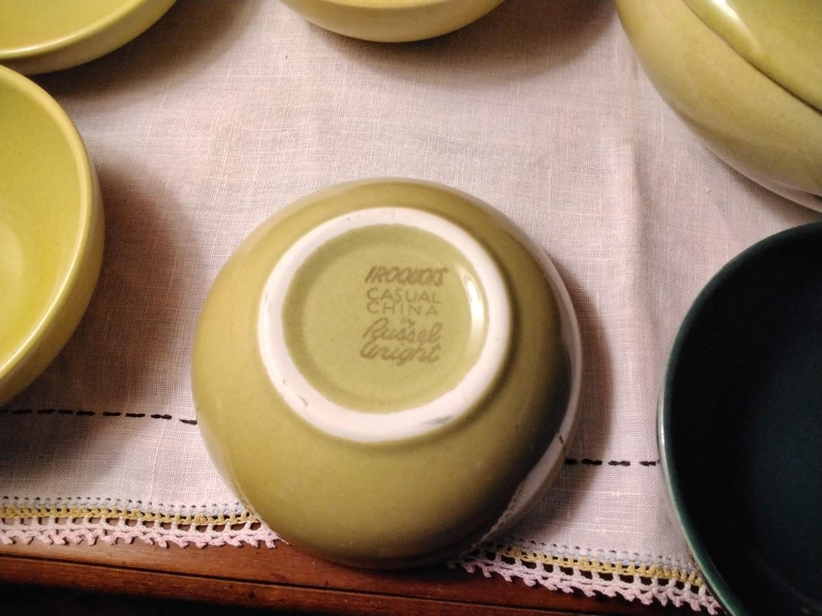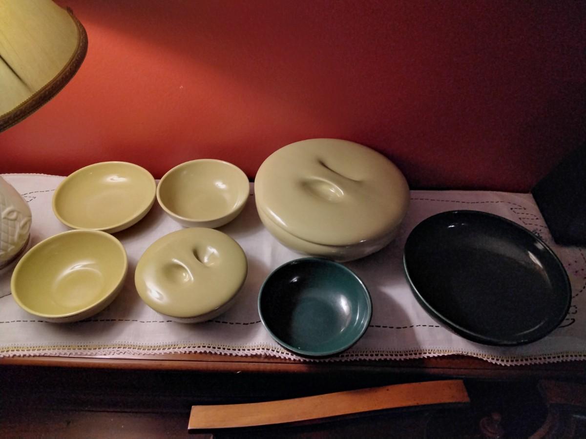 All the light green lids are not pictured. There are no chips, cracks or crazing. Beautiful china pieces. Designed in the 1940s, would look amazing in any display because of the beautiful forms and colors. Excellent condition! Light green big bowl with lid 8.25"× 3.5"/ 3 small light green bowl with ;lids 5"× 2"/ single small light green bowl 5.5"× 1.5"/ big dark green bowl 8"× 2"/ small dark green bowl with lid 5"× 2"