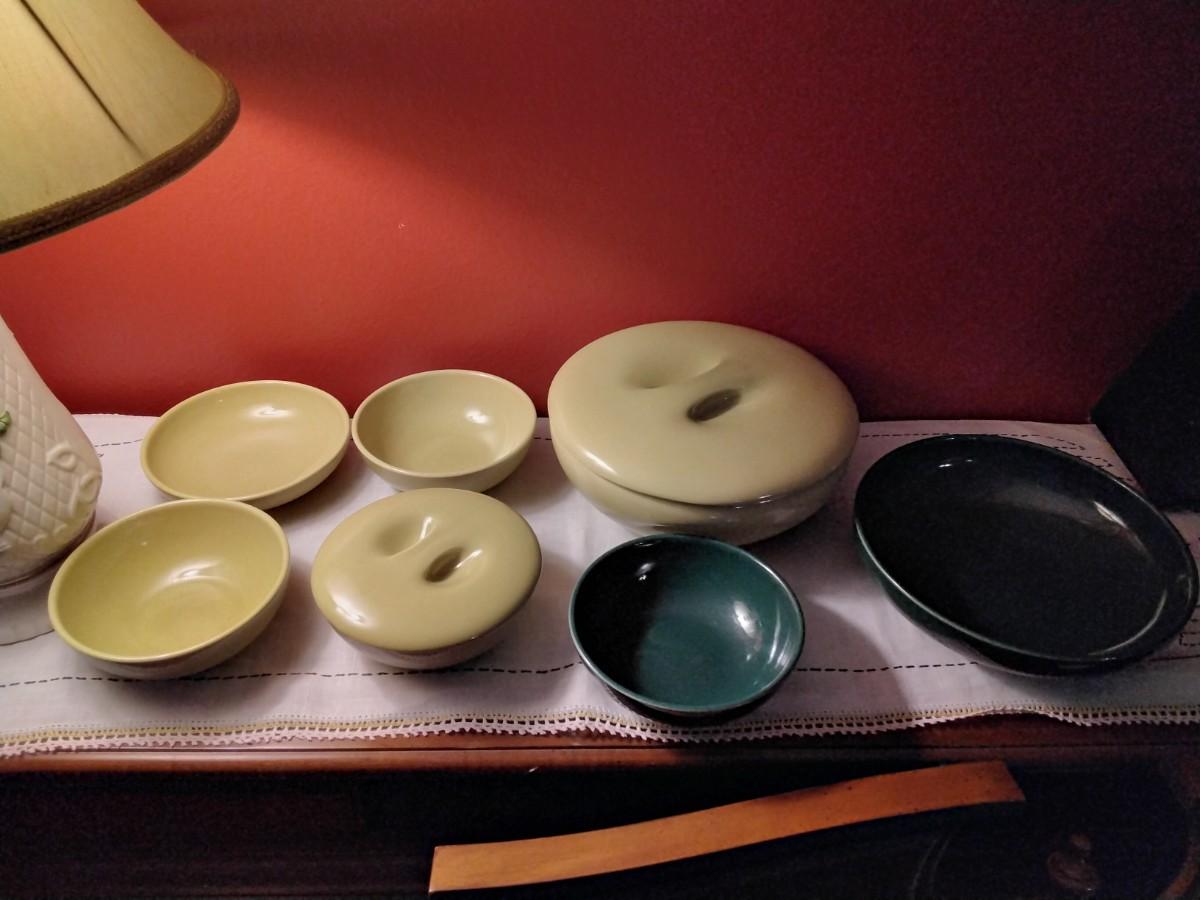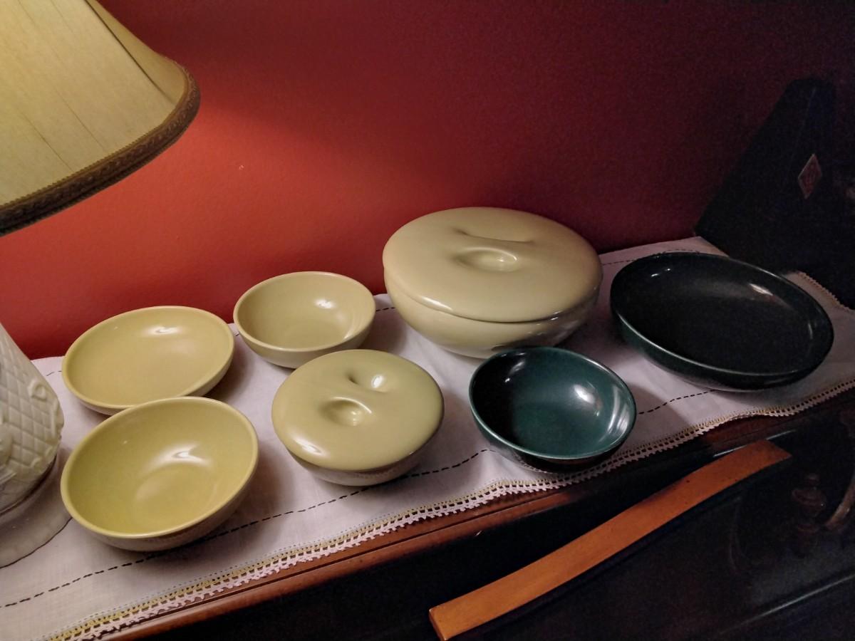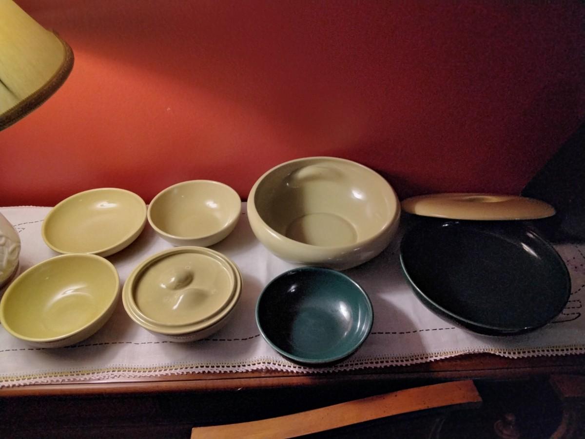 All the light green lids are not pictured. There are no chips, cracks or crazing. Beautiful china pieces. Designed in the 1940s, would look amazing in any display because of the beautiful forms and colors. Excellent condition! Light green big bowl with lid 8.25"× 3.5"/ 3 small light green bowl with ;lids 5"× 2"/ single small light green bowl 5.5"× 1.5"/ big dark green bowl 8"× 2"/ small dark green bowl with lid 5"× 2"