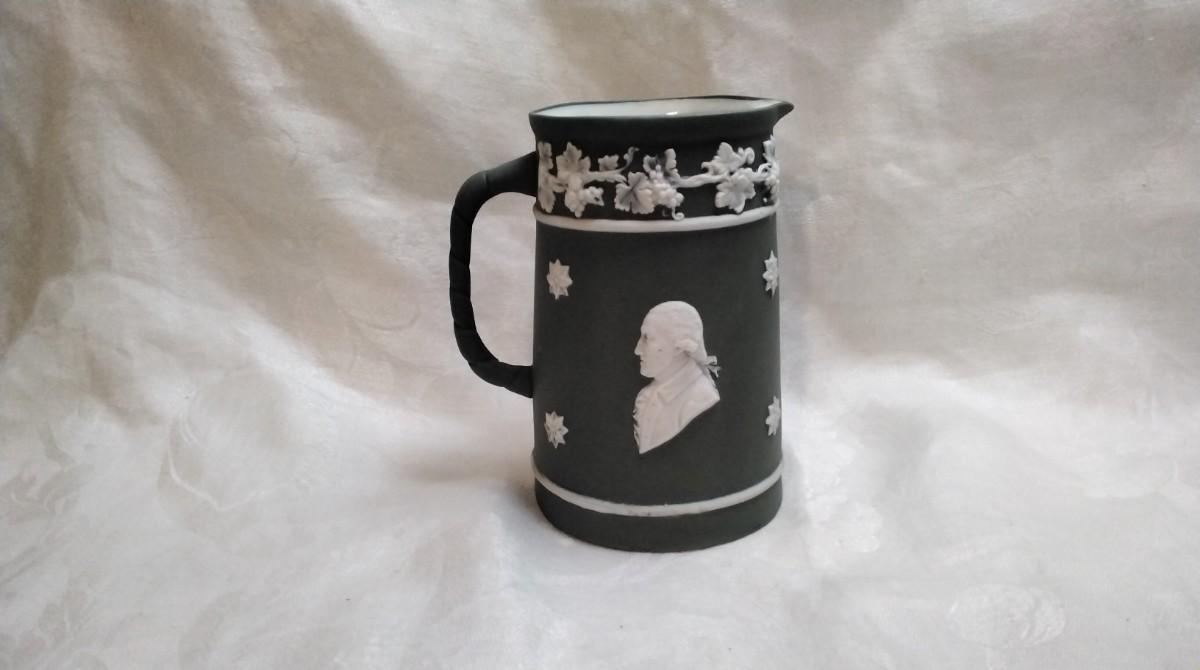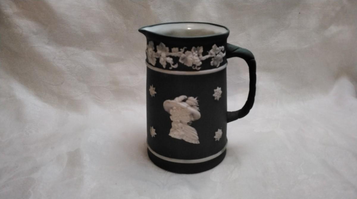 I understand why many people think this style of work is from Wedgwood! This green Jasperware creamer (small pitcher or jug) with raised white designs is from Schafer & Vater (founded 1890 in Volkstedt Rudolstad, Thuringa, Germany, closed c. 1960). It has a matte velvety green finish with hard gloss white decoration, with grape vines around the rim, embossed flowers, and two 18th century portraits (the lady looks a bit like Mrs. Siddons, the great tragic actress). The handle is incised, so it looks twisted or like a rope.