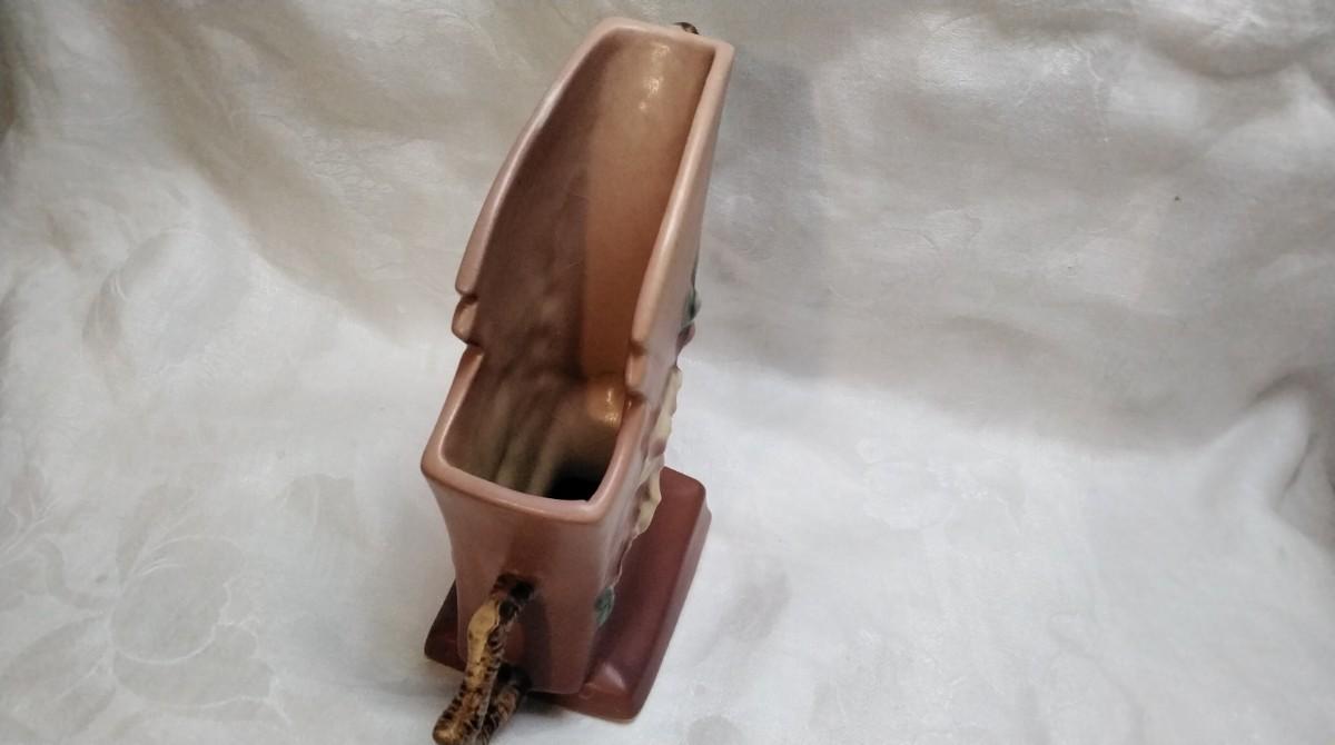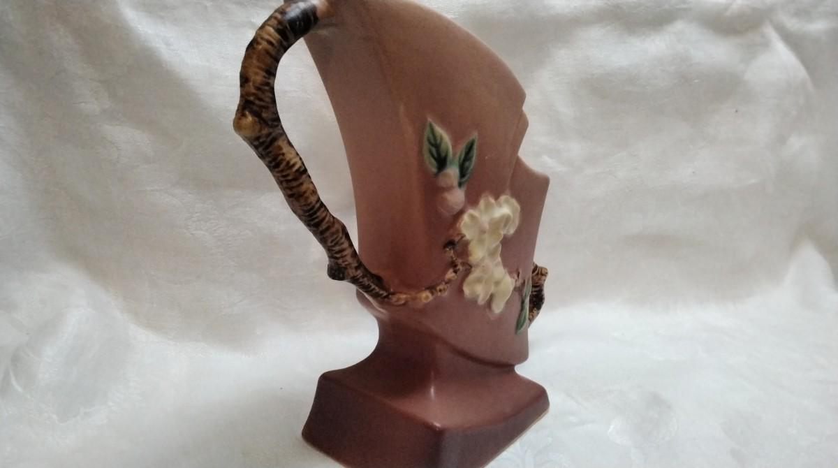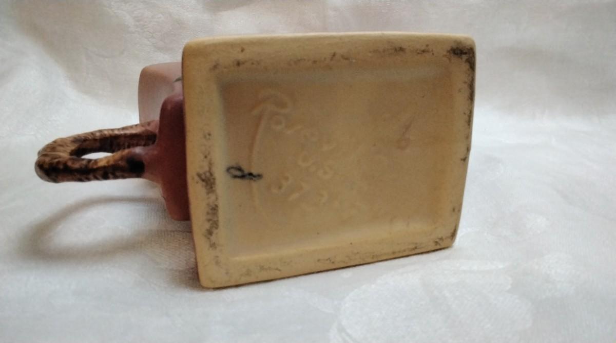 Roseville Pottery Apple Blossom pink handled vase. Good form and color. EXCELLENT ORIGINAL CONDITION. No chips, cracks, damage or repair of any kind. Bottom marked with Roseville, USA and 373-7. Vase is 7 1/2" tall and 7 1/2" wide from handle to handle.