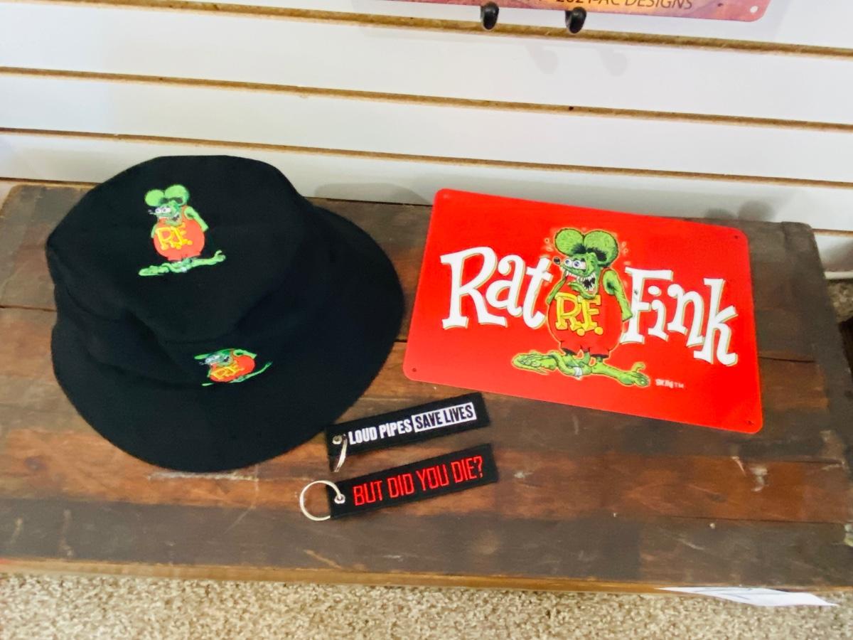 RAT FINK BUCKET HAT, SIGN AND KEYCHAINS
