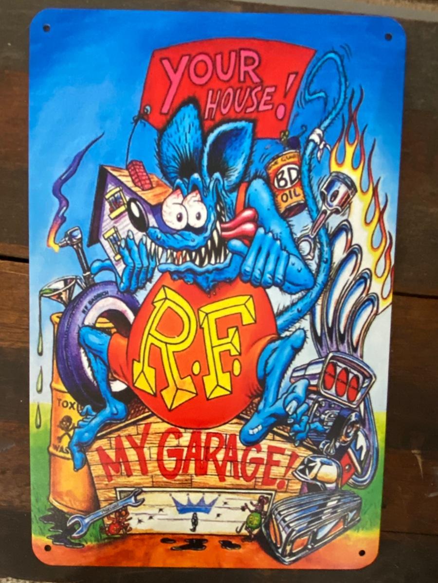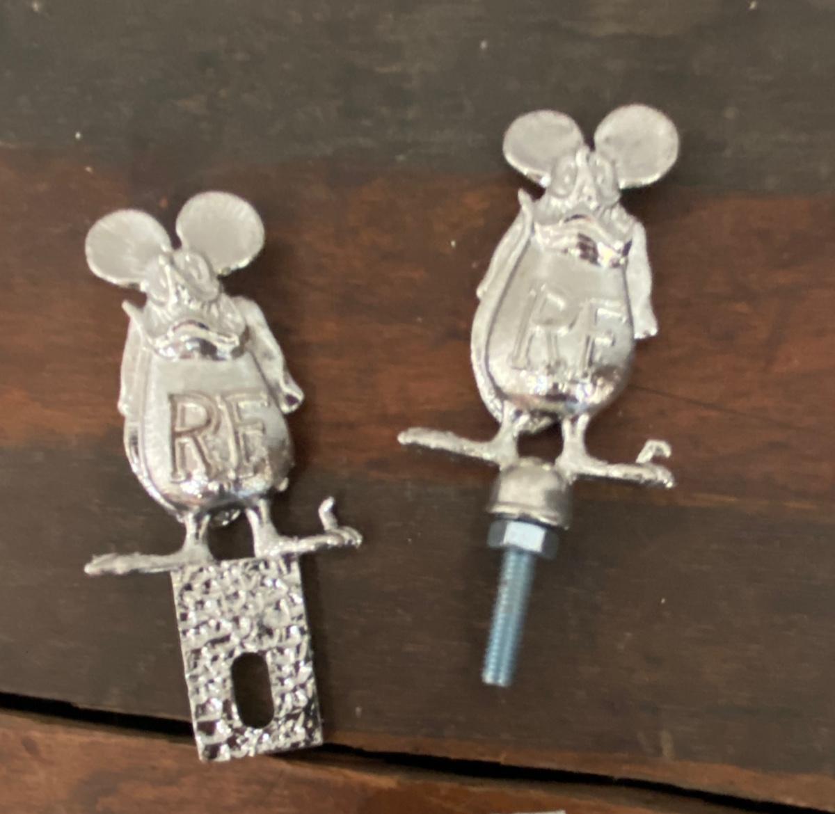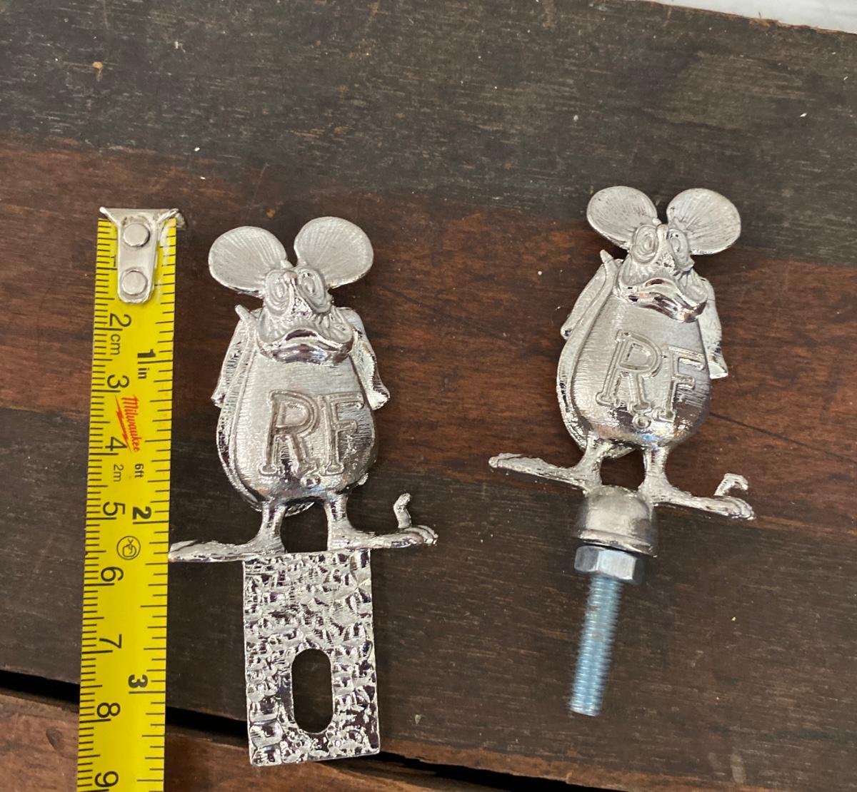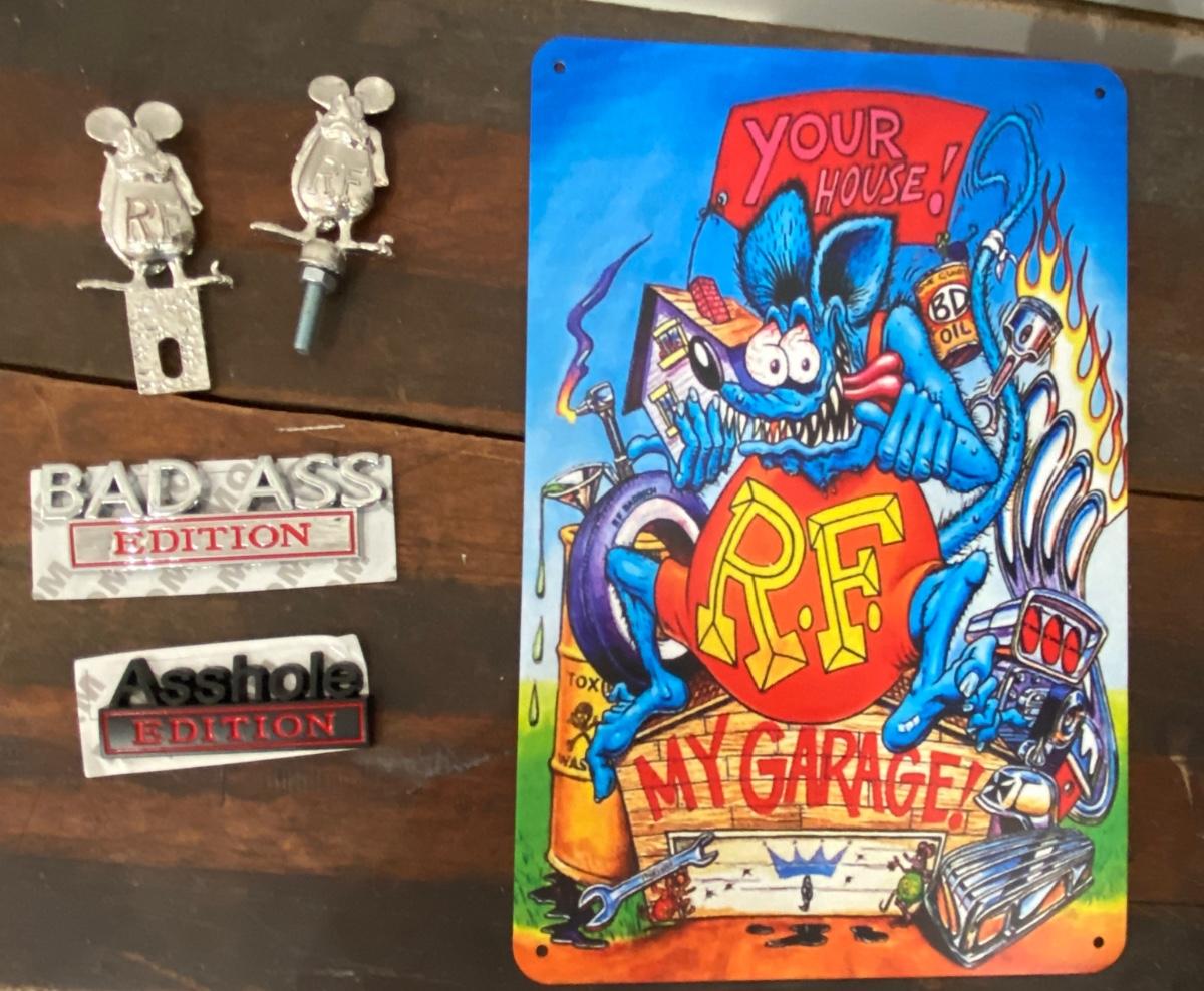 RAT FINK SIGNAGE HOOD ORNAMENT, LICENSE PLATE ACCESSORY, AND CUSTOM METAL DECALS