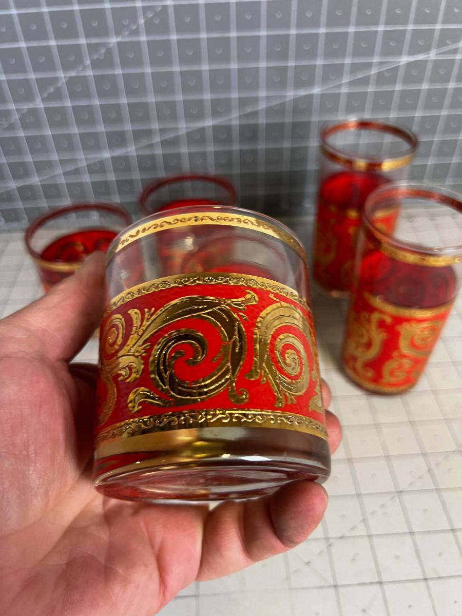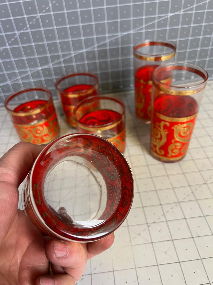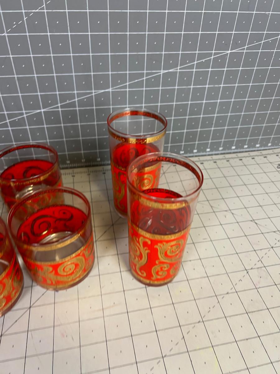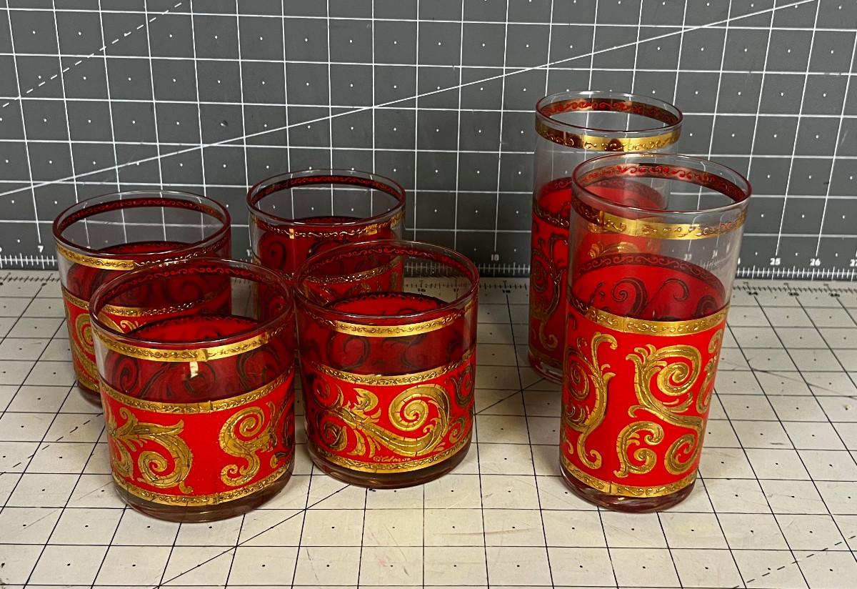 Red and GOLD Bar Glasses; 2 Tumblers and 4 Whiskey
