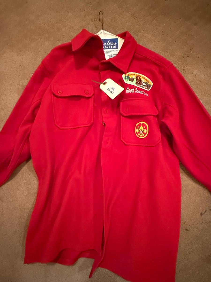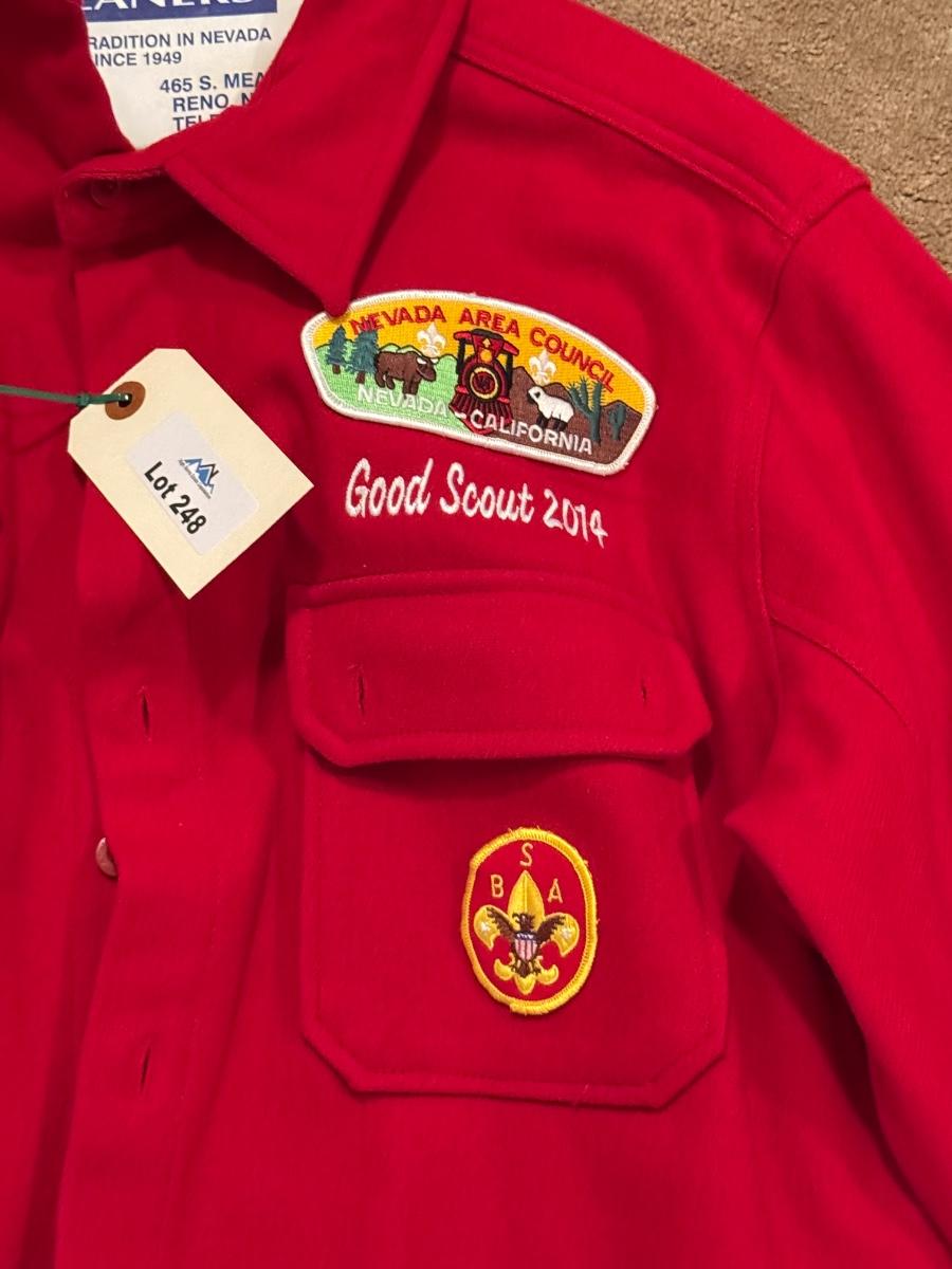 Red Nevada Area Council Boy Scouts button up coat/jacket w/2 patches