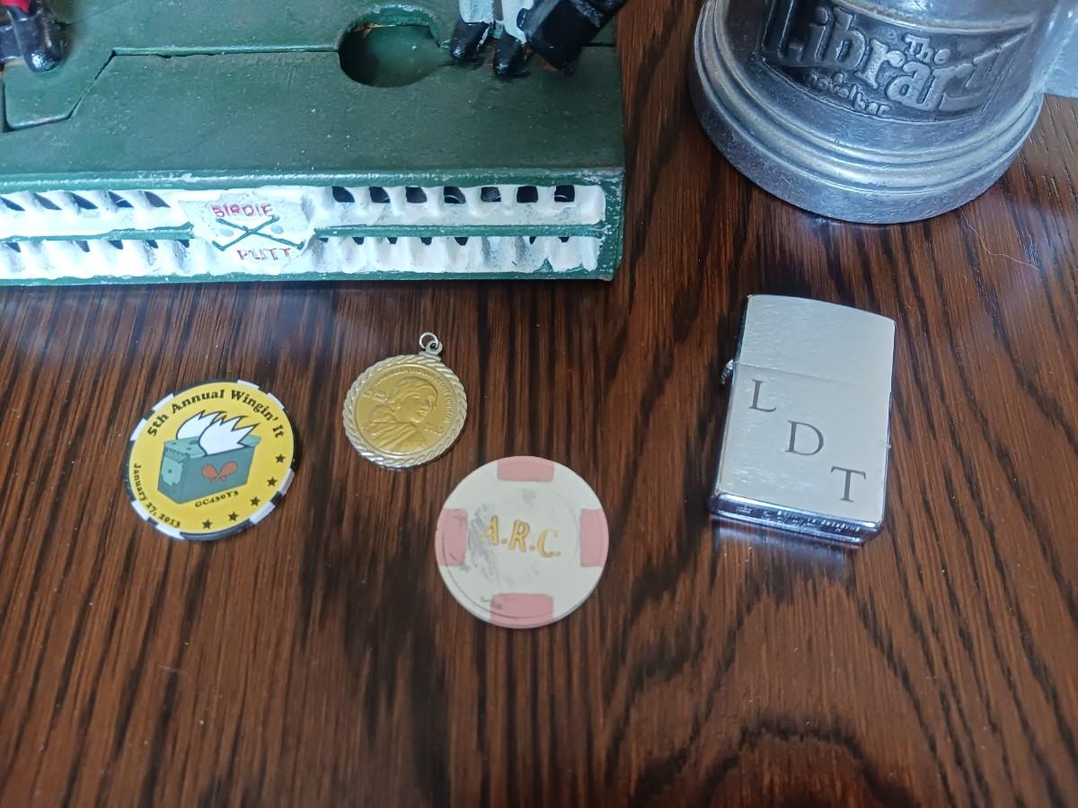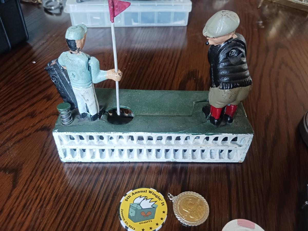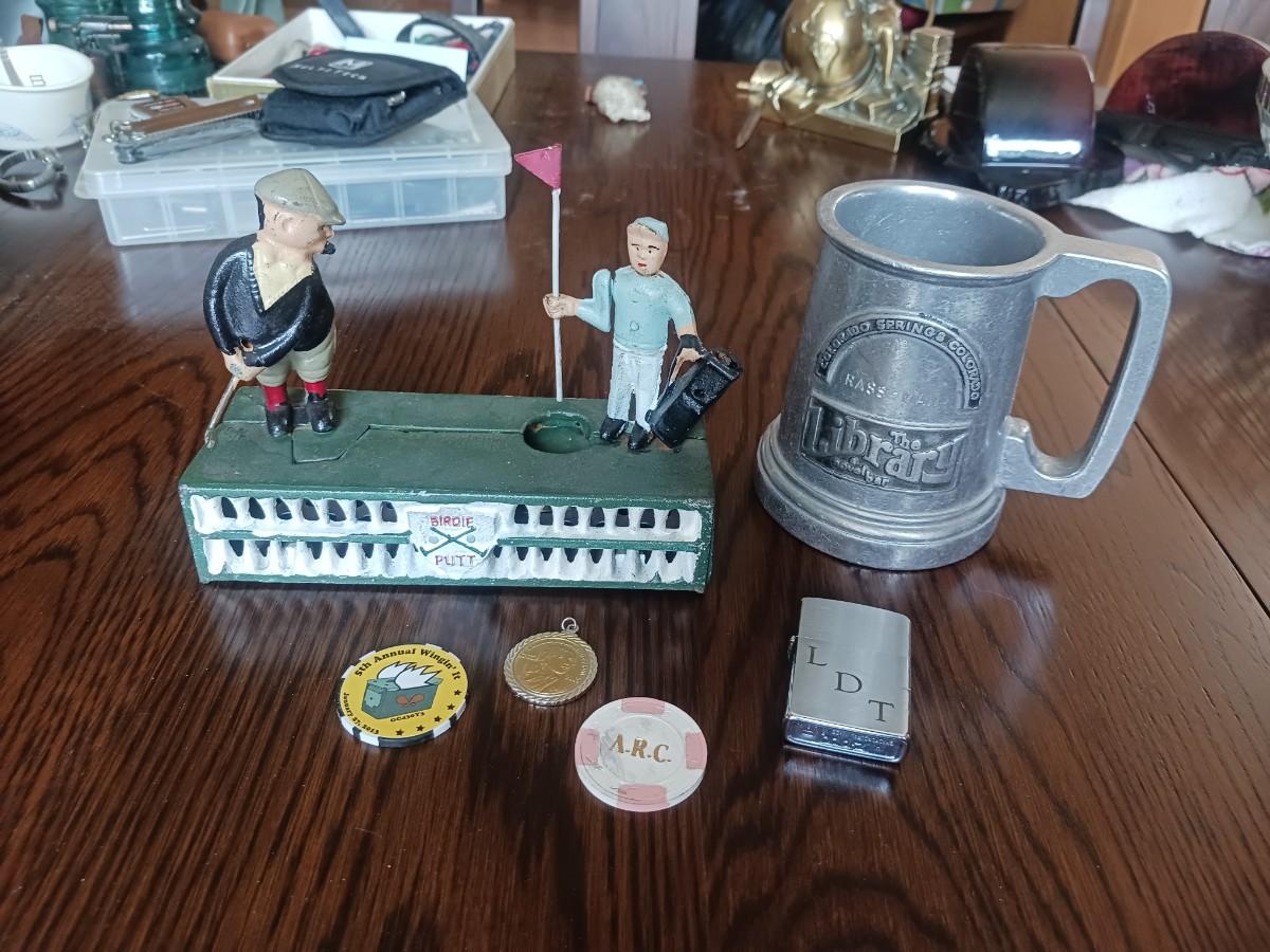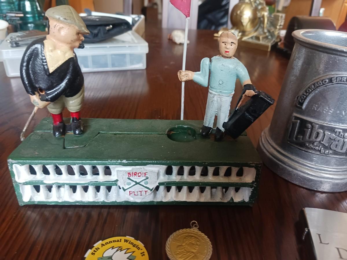 REPRODUCTION CAST IRON GOLFERS COIN BANK, PEWTER MUG AND MORE
