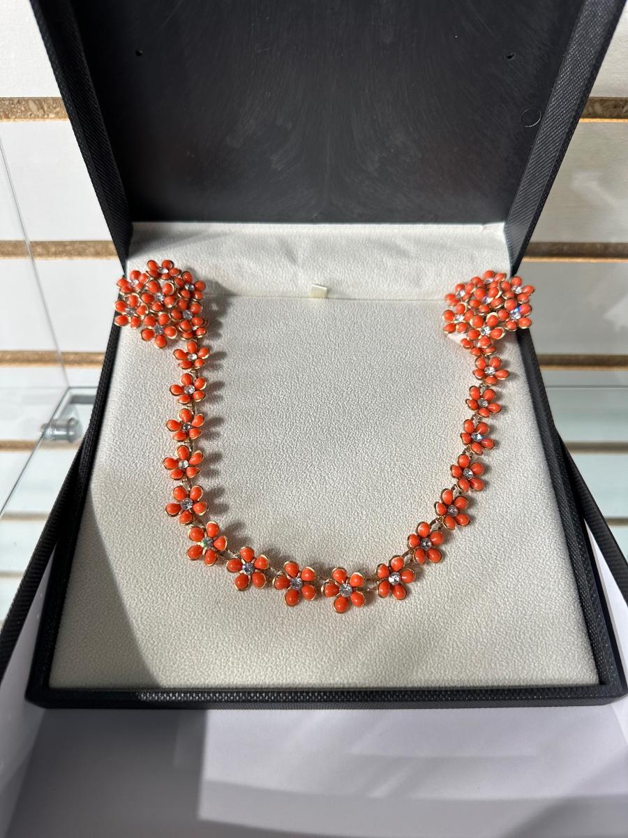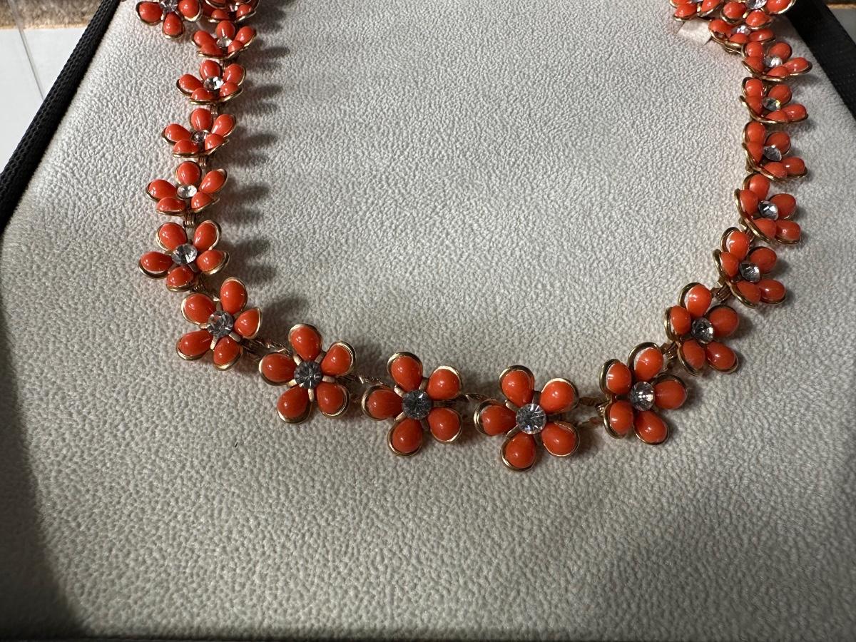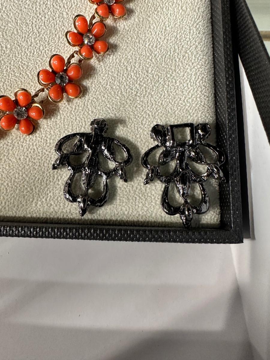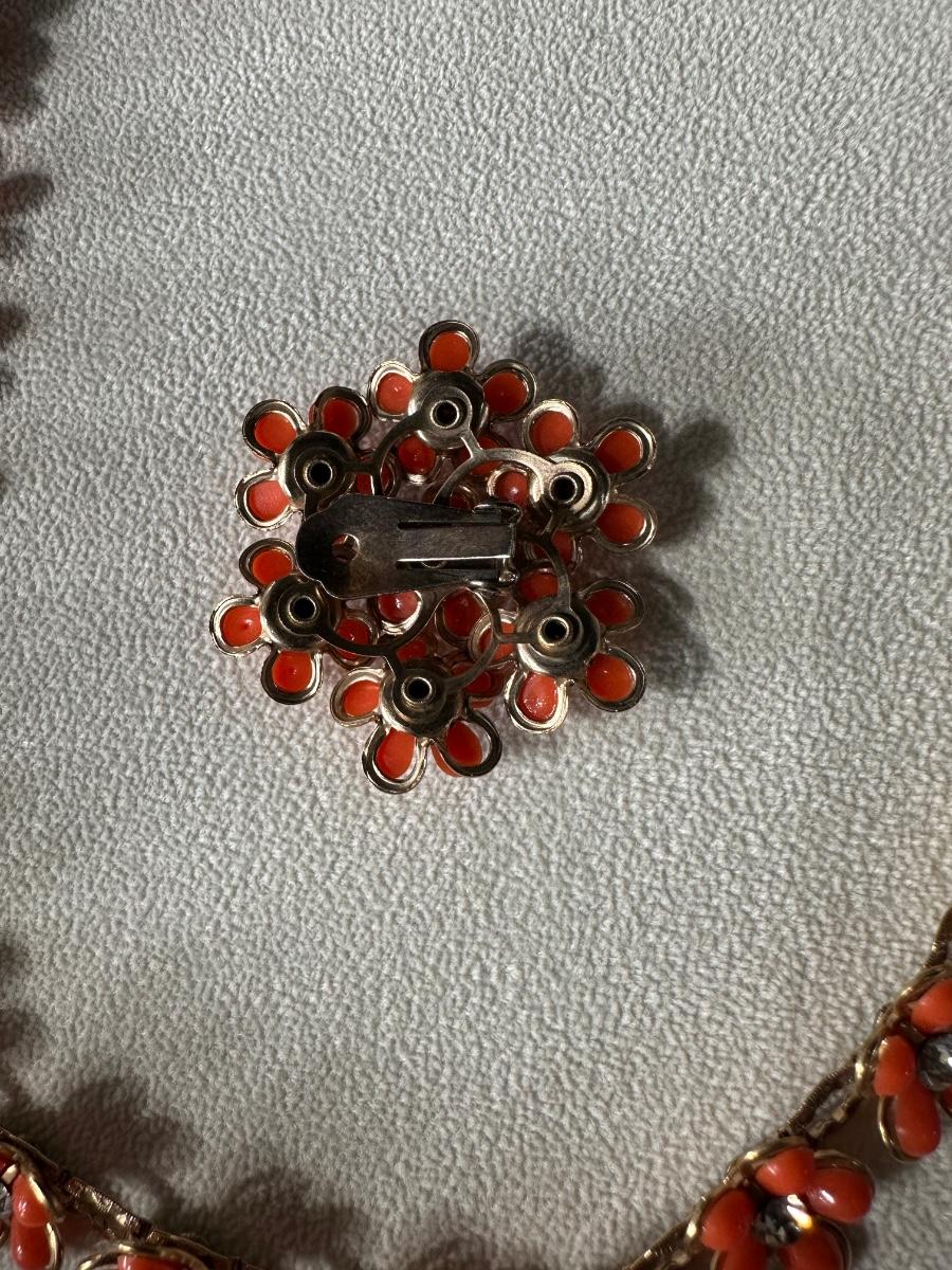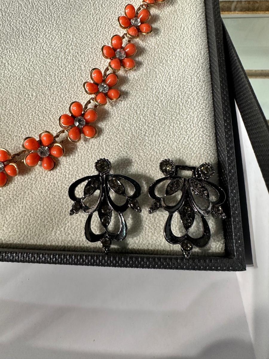 RETRO ORANGE FLORAL EARRING AND NECKLACE SET AND RETRO ELEGANT RHINESTONE SWEATER CLIPS