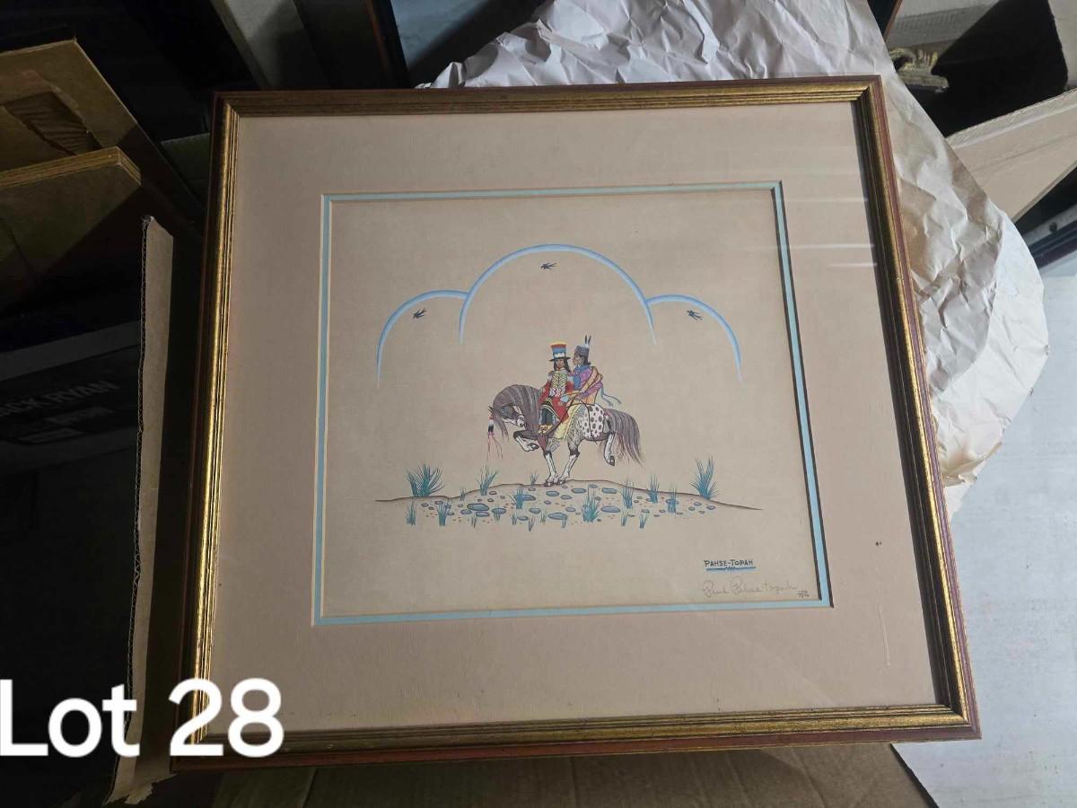 Osage/Cherokee artist and dancer Paul Pahsetopah was born in Pawhuska, Oklahoma in 1932. At the age of 14, he showed an interest in painting and drawing. He had already made his first dance regalia. It was not until Acee Blue Eagle encouraged him to paint in the 1950’s that he worked seriously at art. Singer, dancer, flutist, craftsman, historian and artist, Pahesetopah considered himself to be a guardian of tradition. He was especially knowledgeable about Native American songs, regalia, dance canes, and beaded gourds. His younger brother, Loren Pahsetopah, his son, Mike Pahsetopah, and nephew, Paul Anthony Pahsetopah were all successful artists.