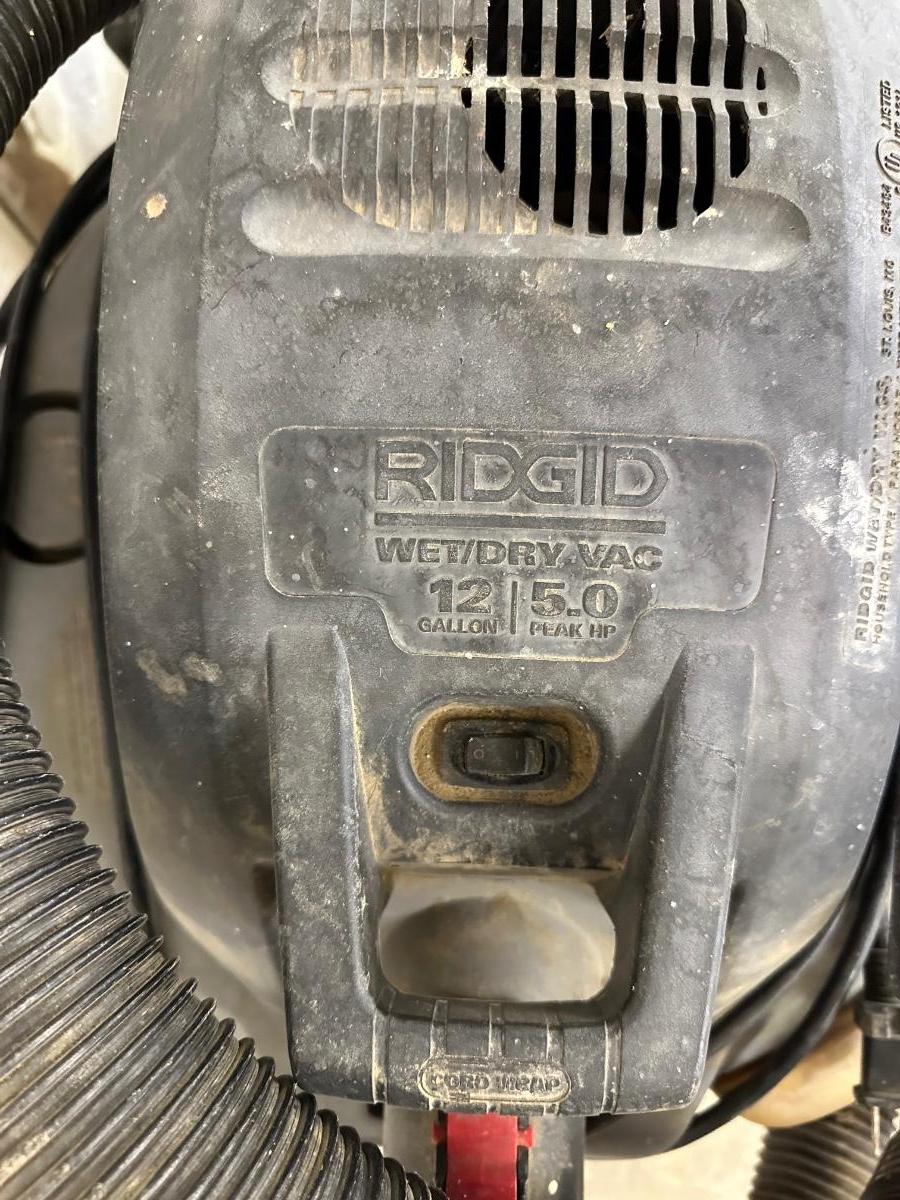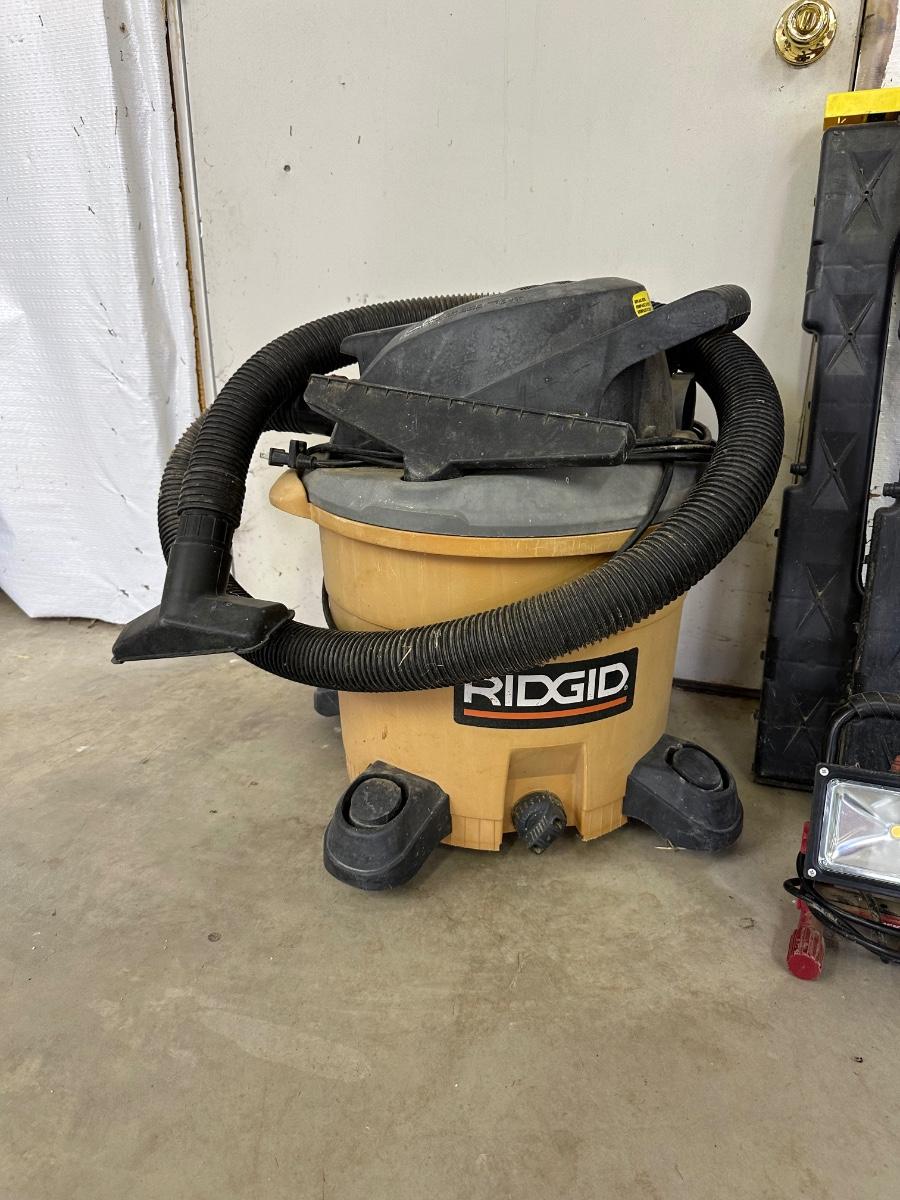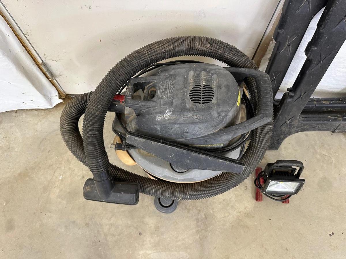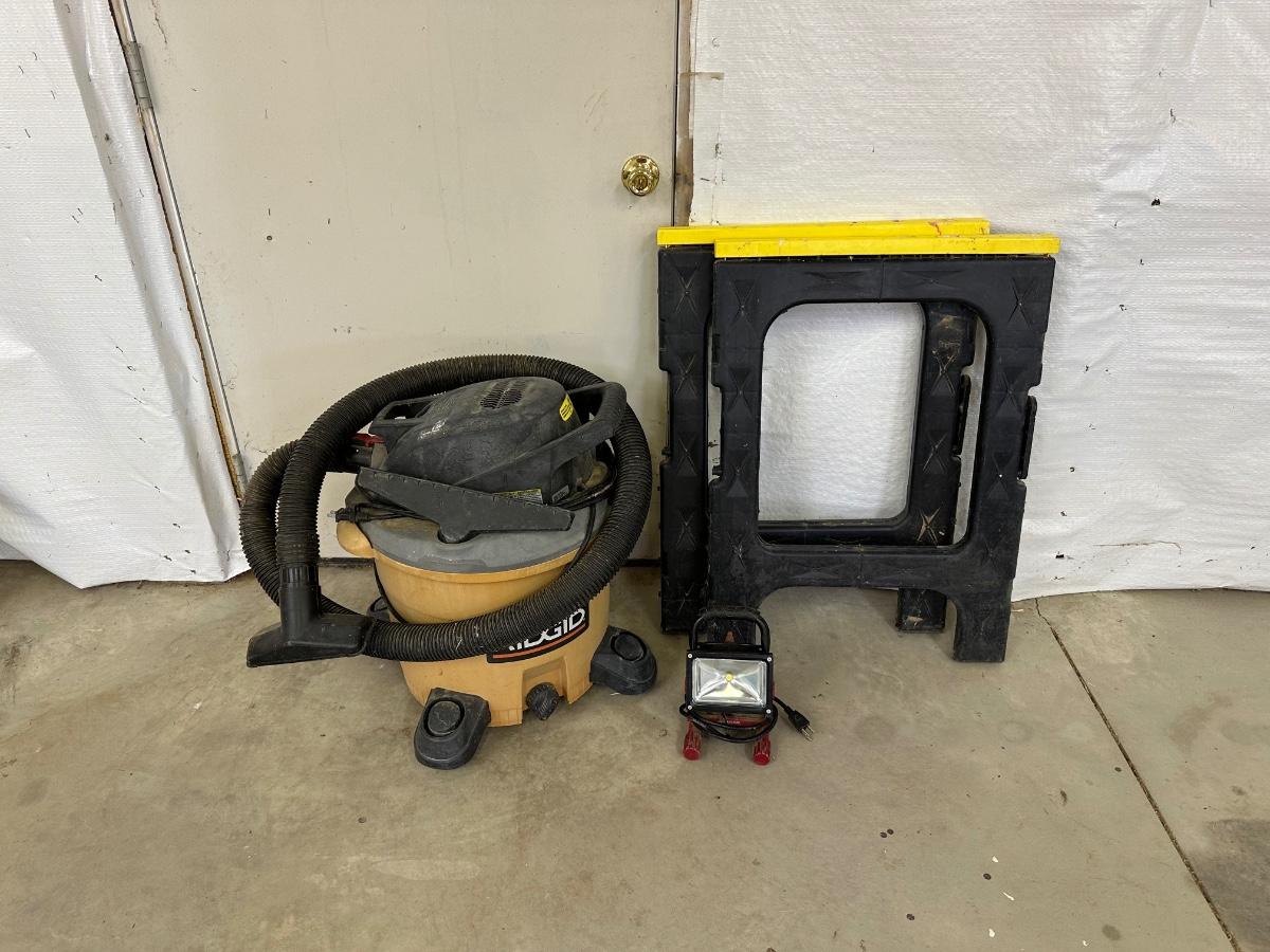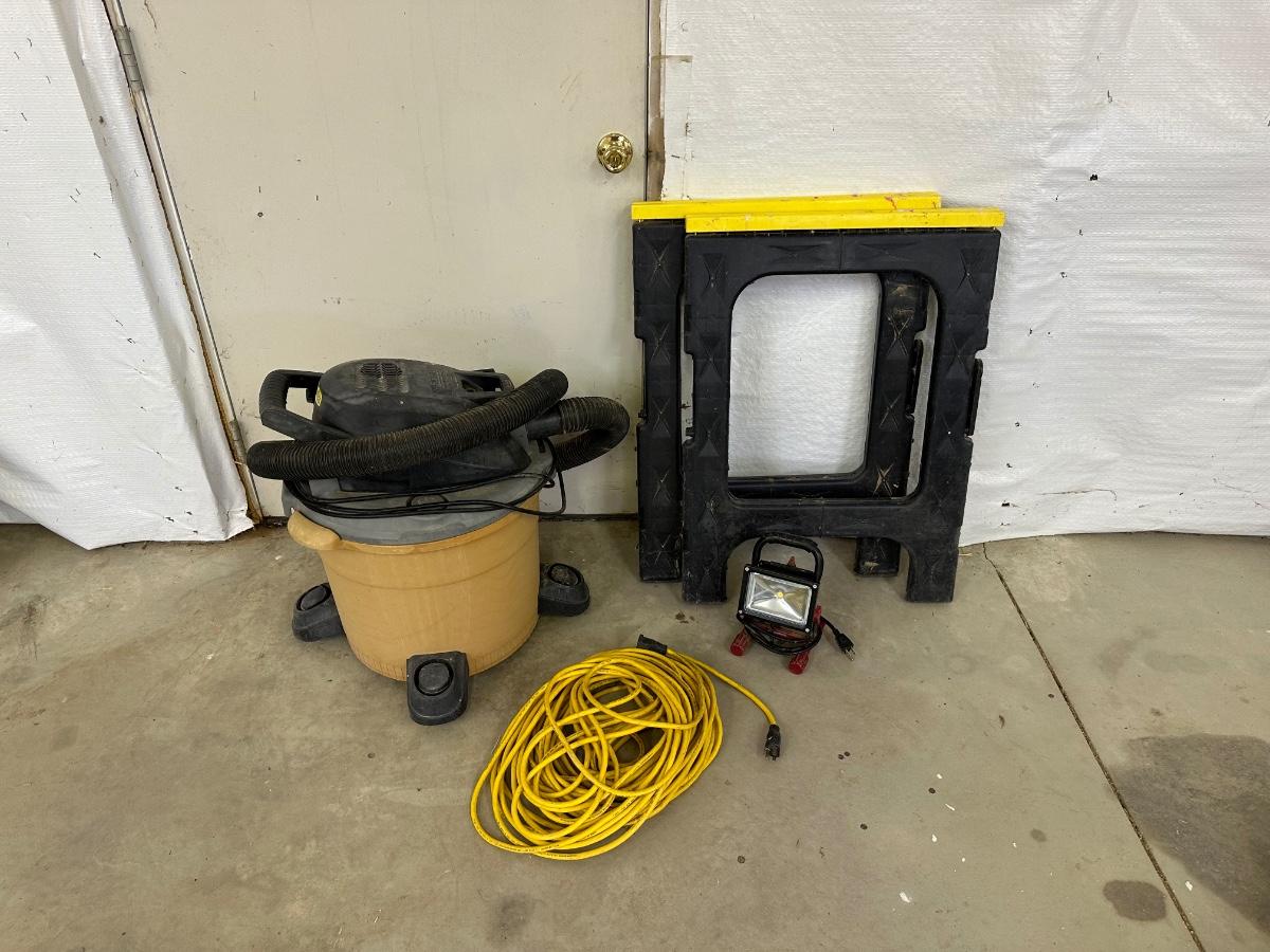 RIGID SHOP VACUUM, HUSKY WORK LIGHT, SAW HORSES, AND HEAVY DUTY 100’ EXTENSION CORD