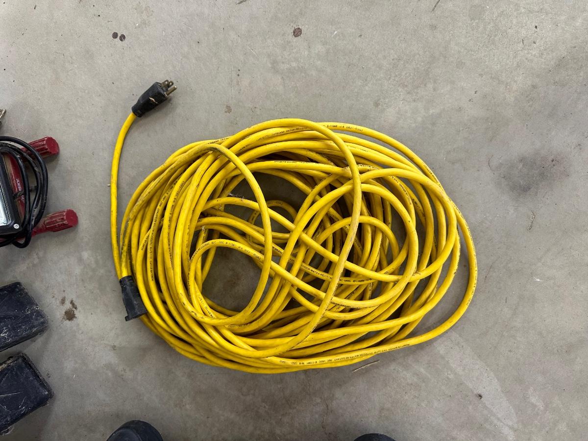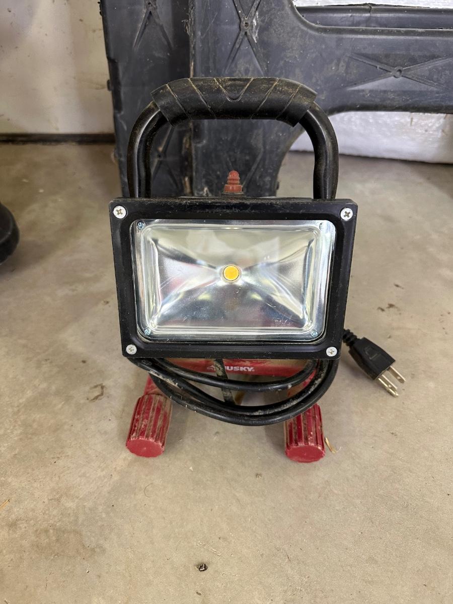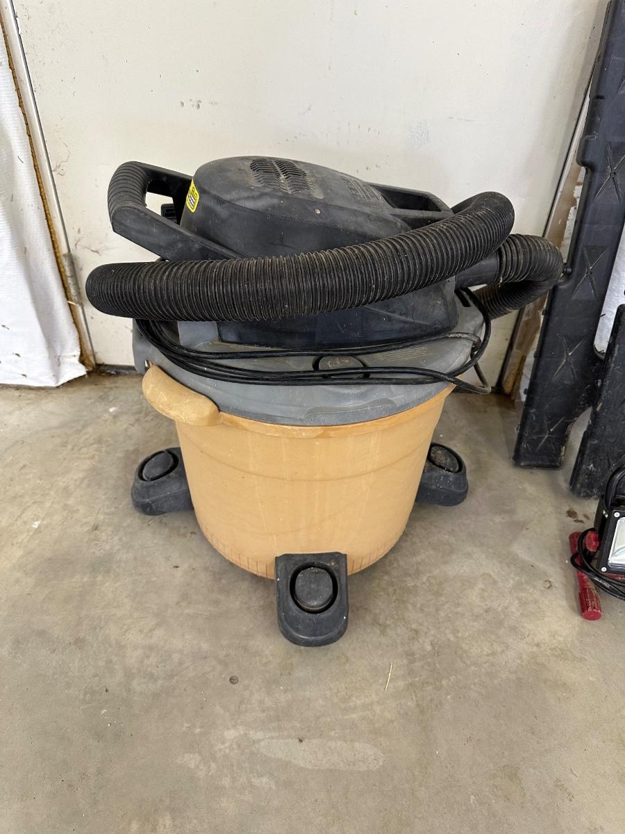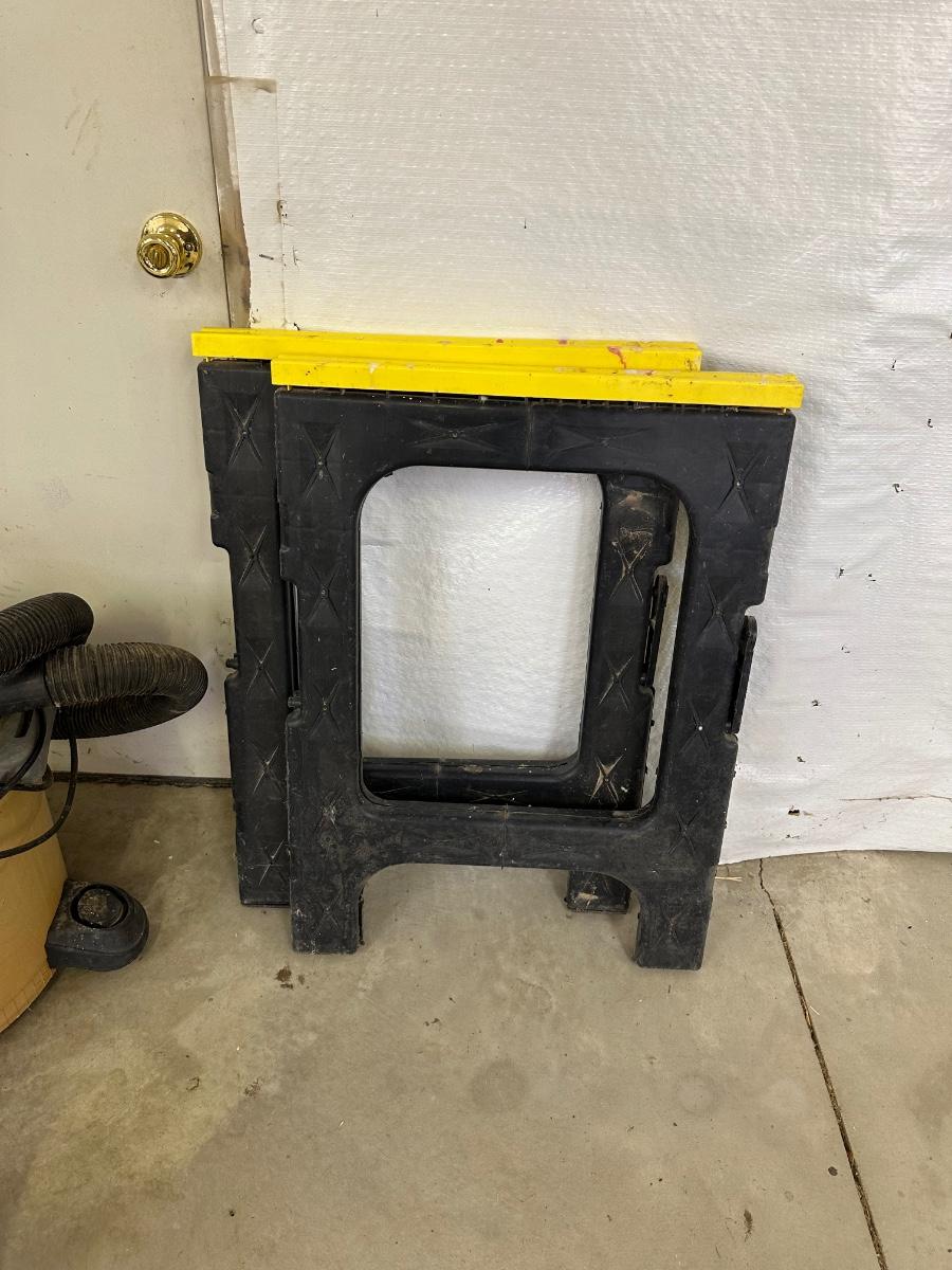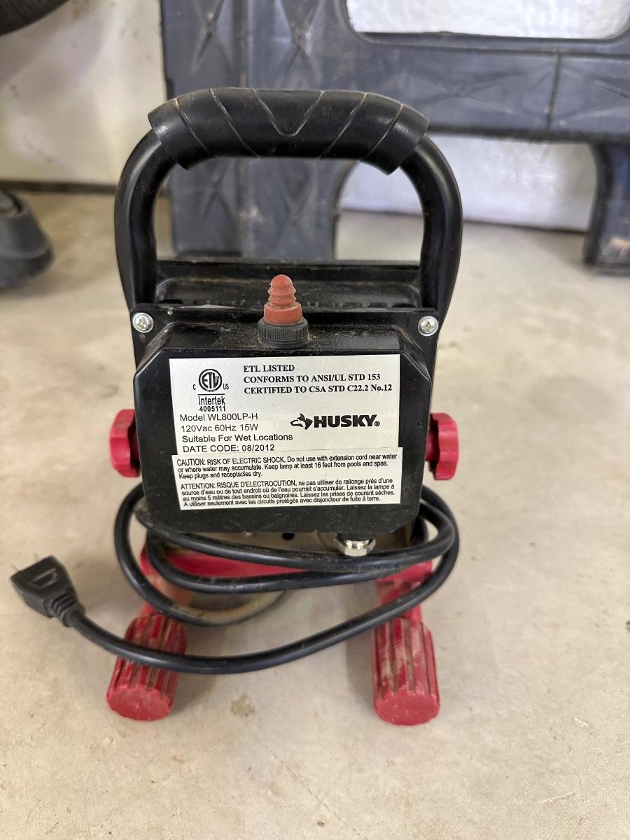 RIGID SHOP VACUUM, HUSKY WORK LIGHT, SAW HORSES, AND HEAVY DUTY 100’ EXTENSION CORD