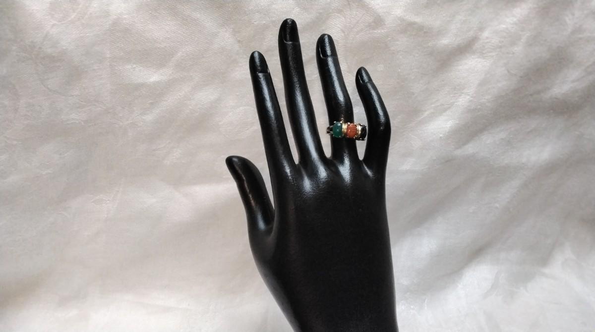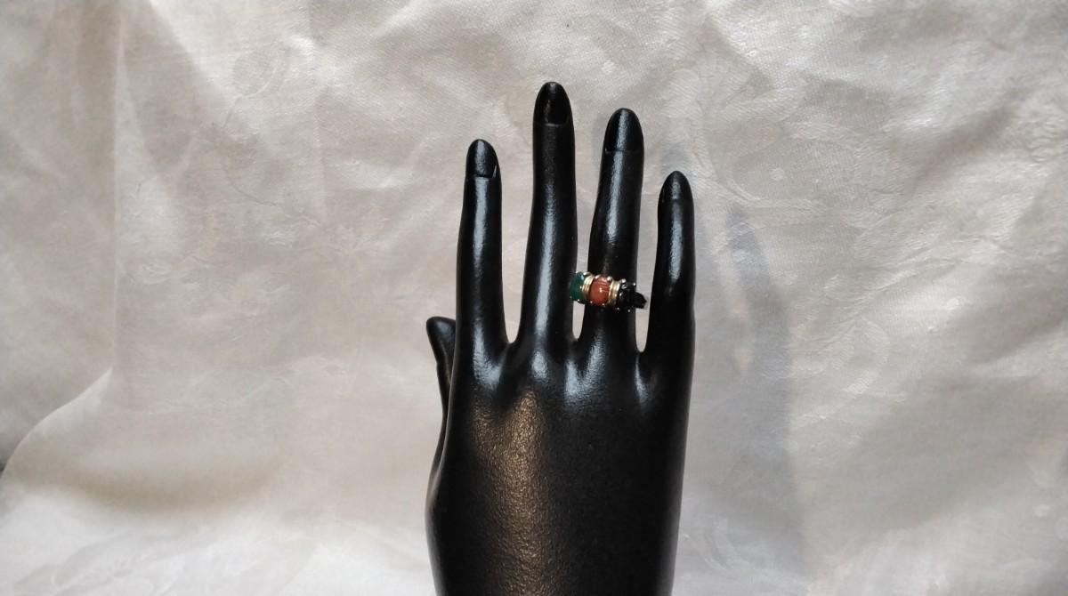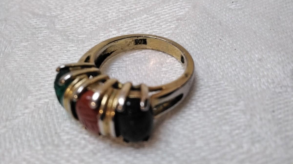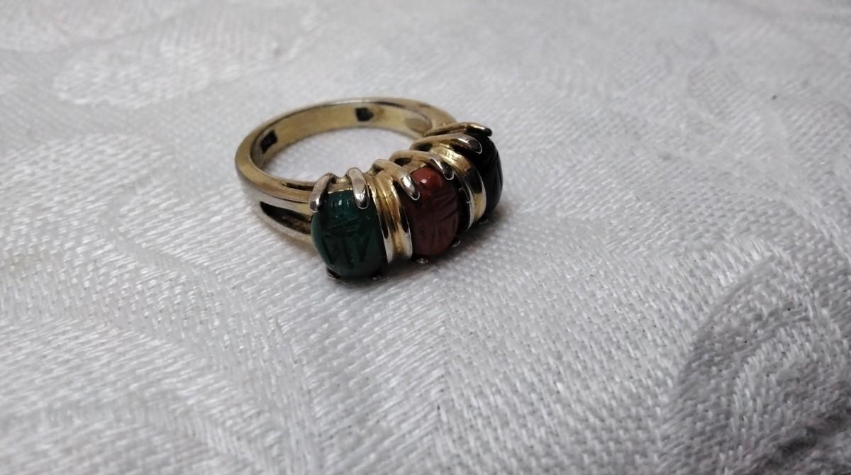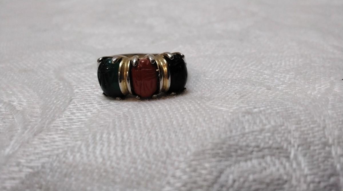 Unique Jade, Onyx, Goldstone Egyptian Scarabs Gold Vermeil Ring Size 5
