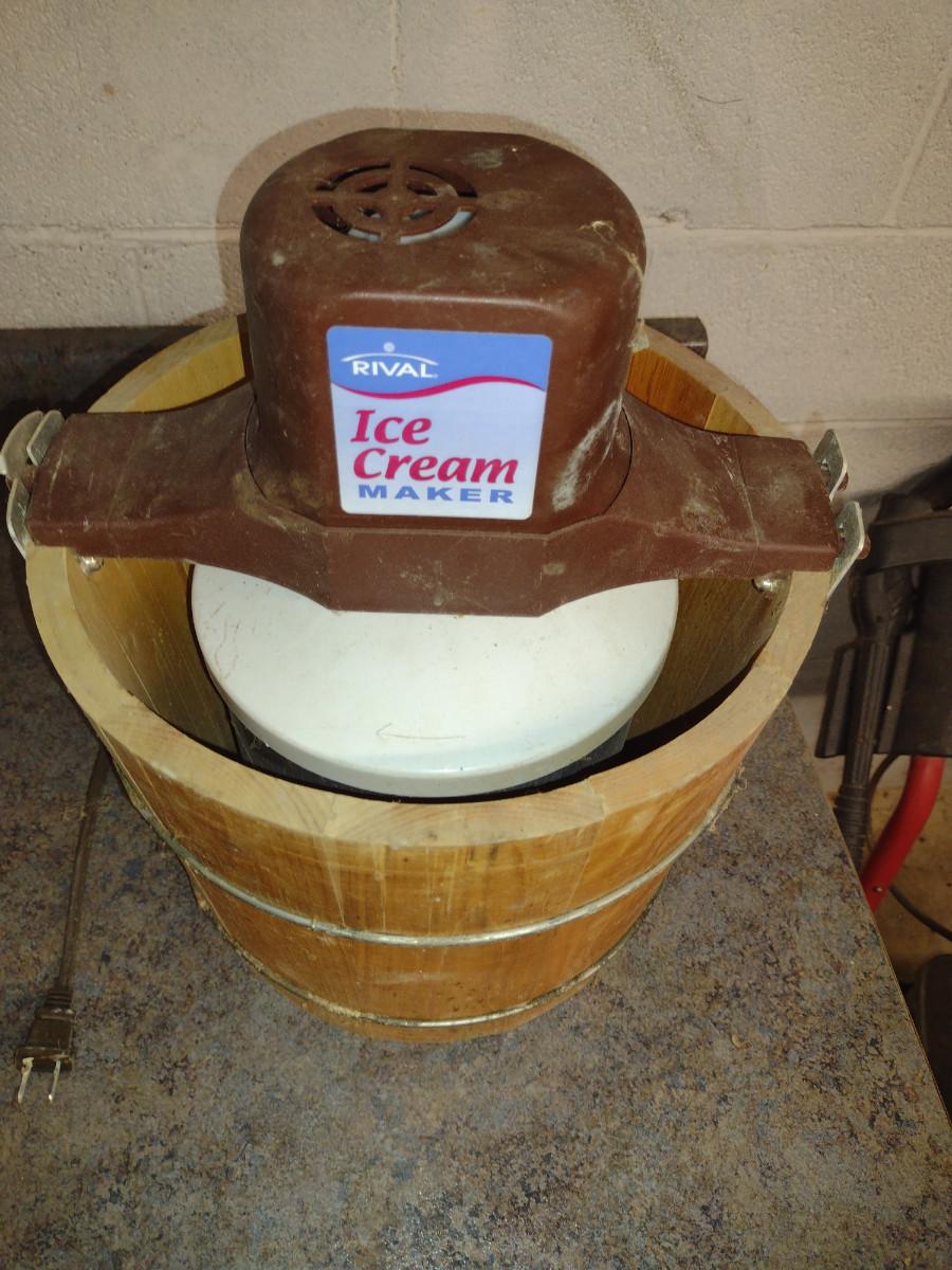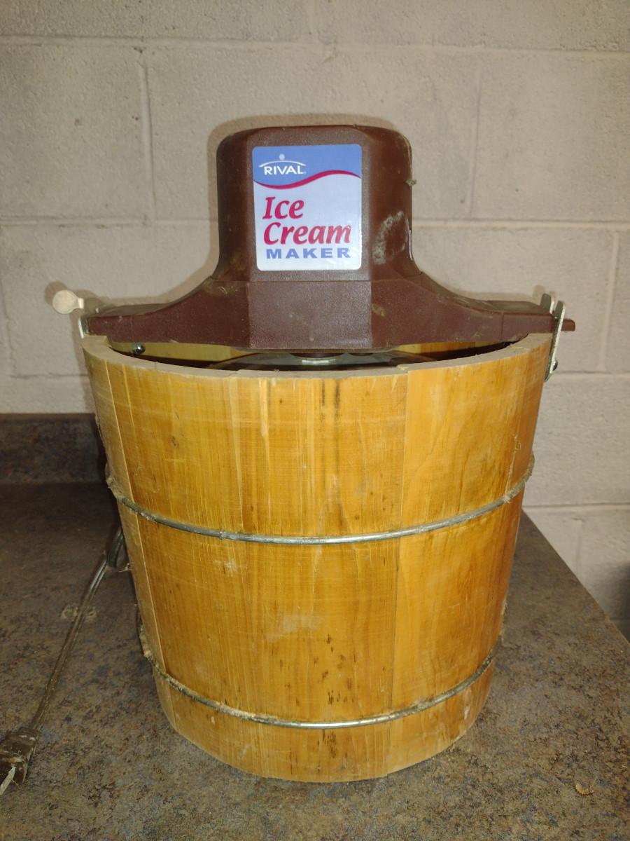 Rival Electric Ice Cream Maker. All parts appear to be present. Item does run, but very slowly- may need repair.